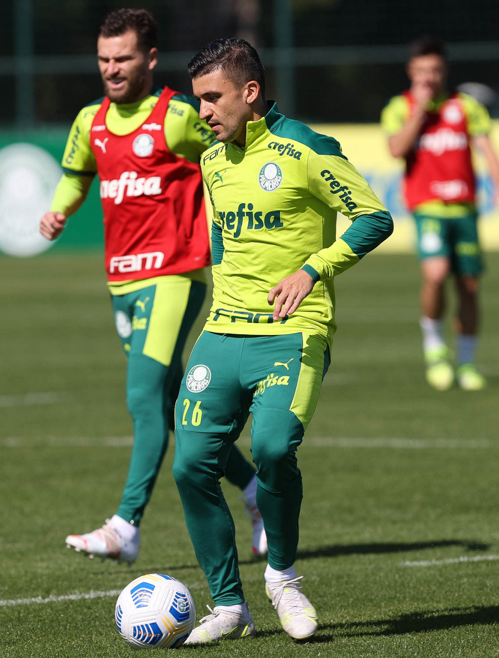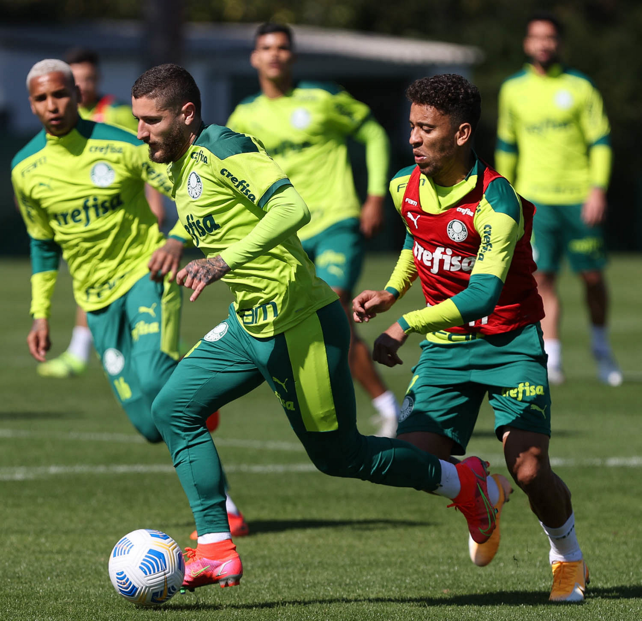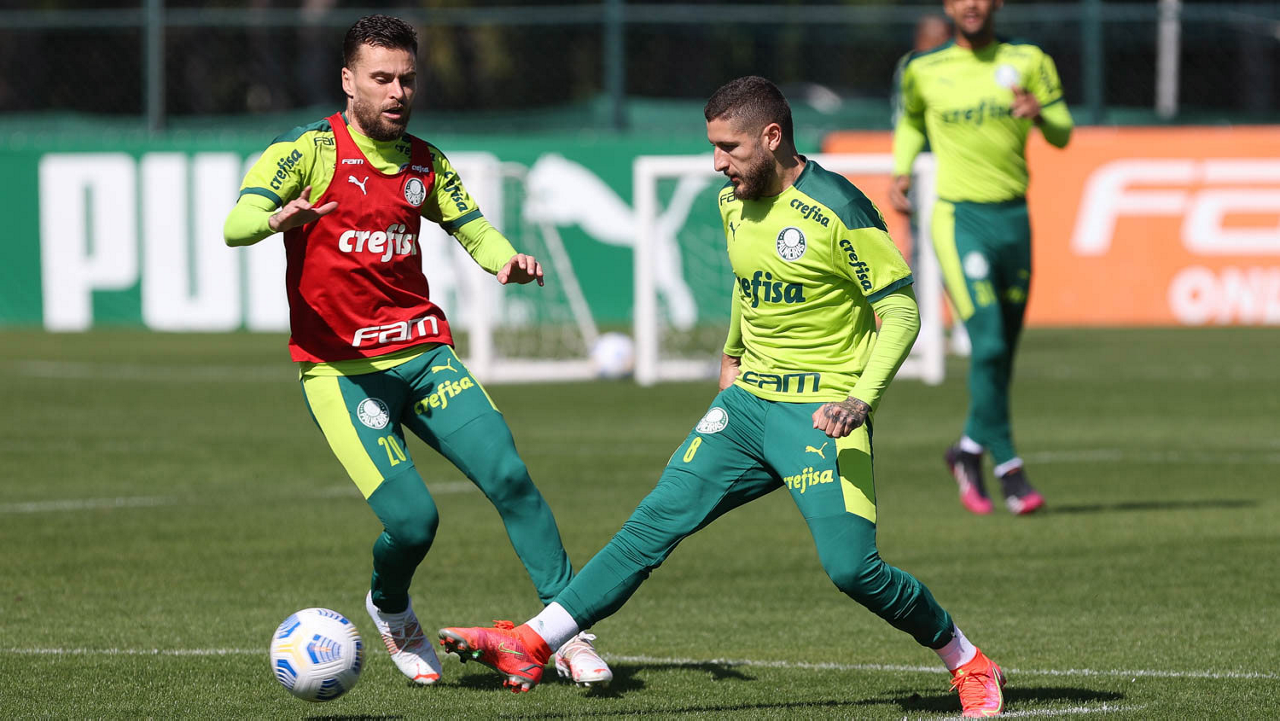 Os jogadores Patrick de Paula e Zé Rafael (D), da SE Palmeiras, durante treinamento, na Academia de Futebol. (Foto: Cesar Greco)