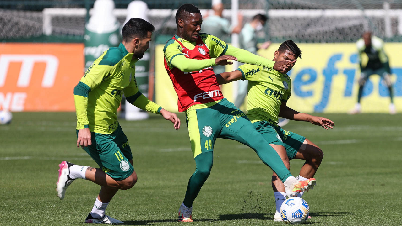 Os jogadores Luan, Patrick de Paula e Rony (E/D), da SE Palmeiras, durante treinamento, na Academia de Futebol. (Foto: Cesar Greco)