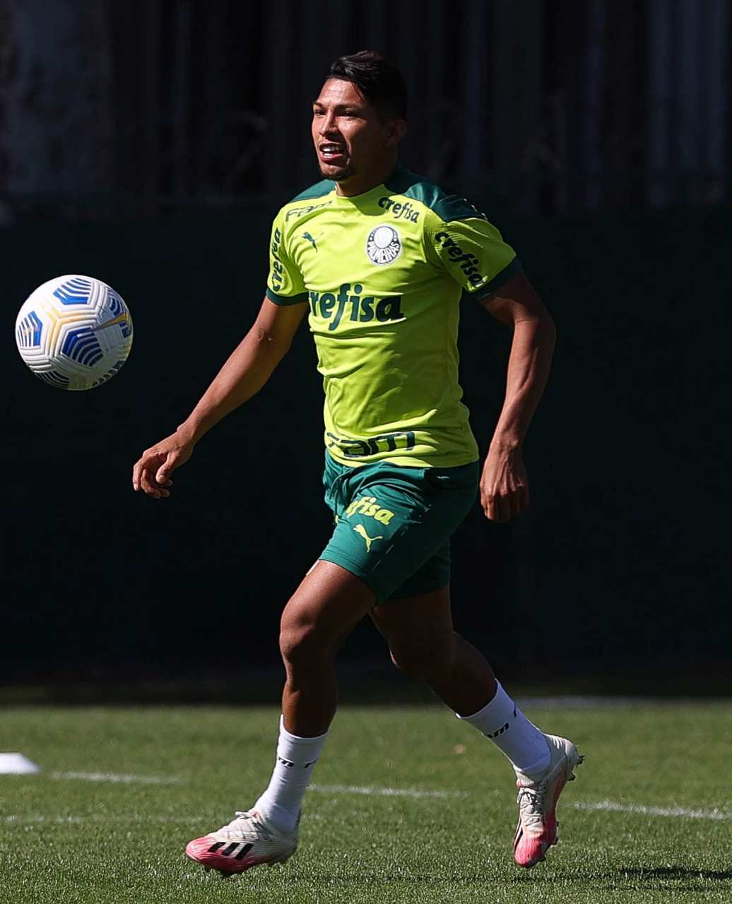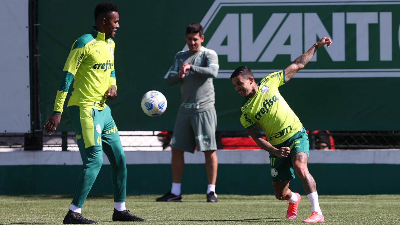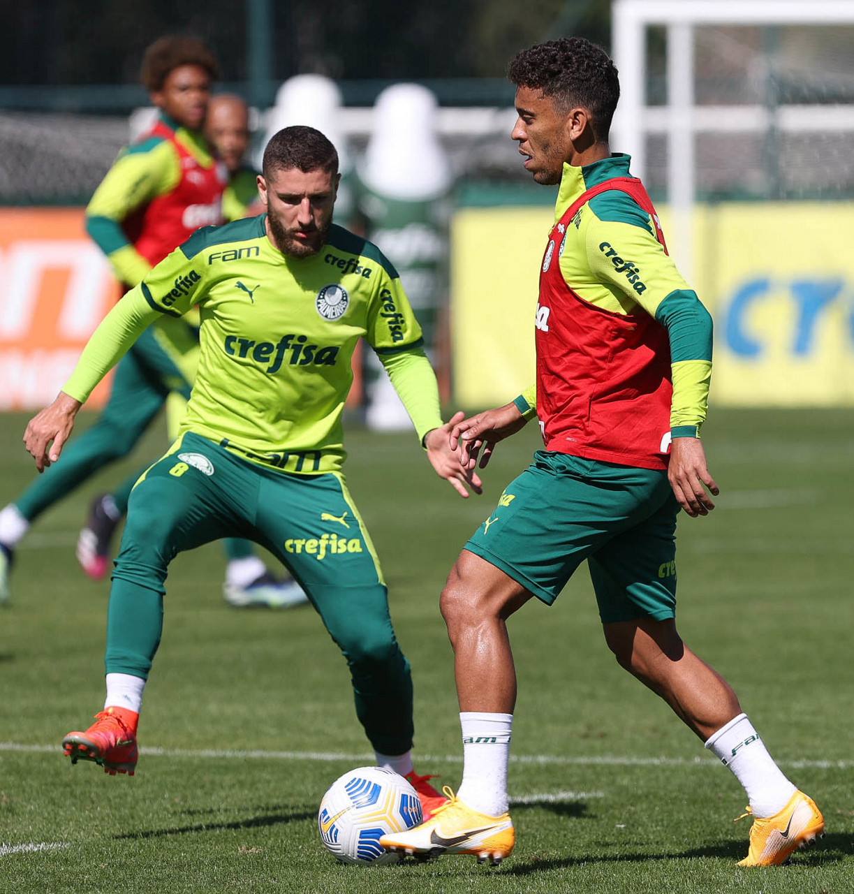 Os jogadores Benjamín Kuscevic e Rony (D), da SE Palmeiras, durante treinamento, na Academia de Futebol. (Foto: Cesar Greco)