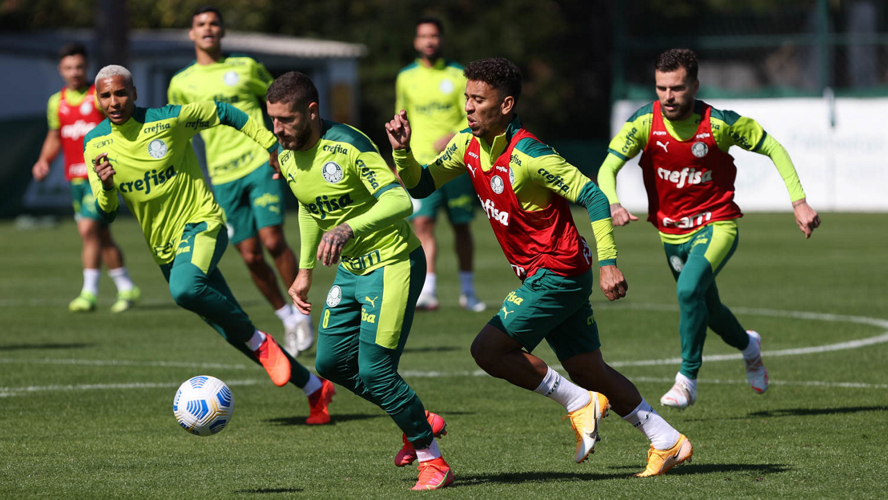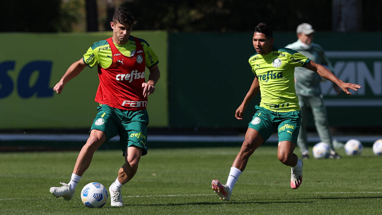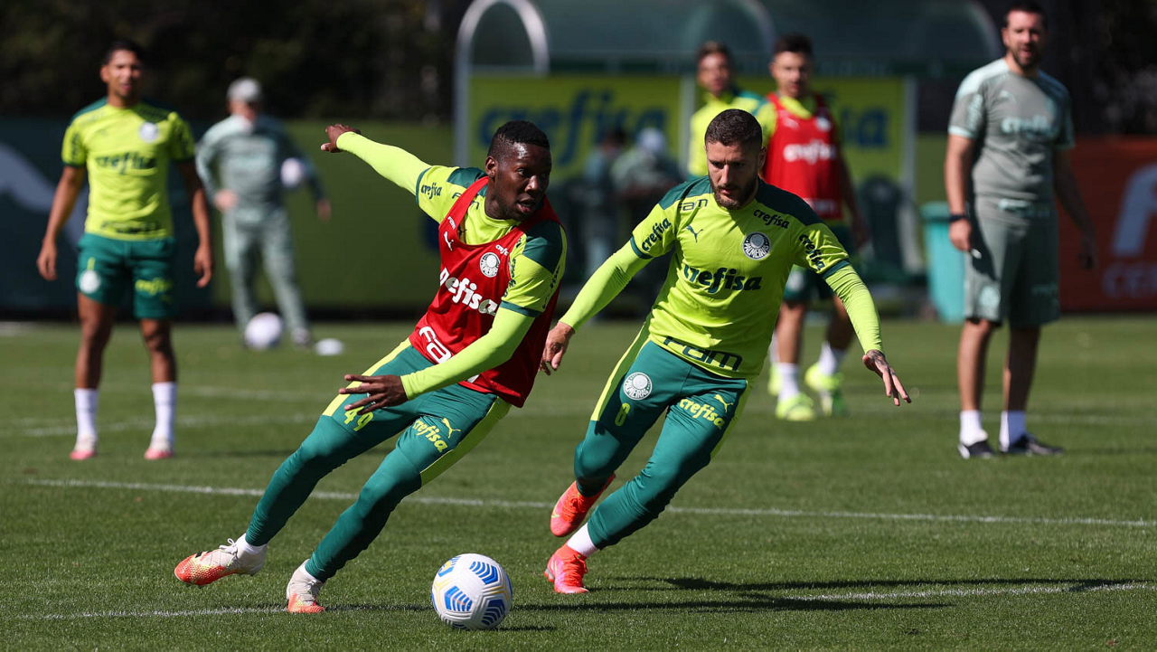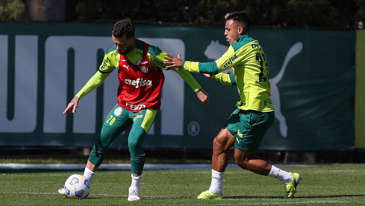 Os jogadores Lucas Lima e Gabriel Menino (D), da SE Palmeiras, durante treinamento, na Academia de Futebol. (Foto: Cesar Greco)
