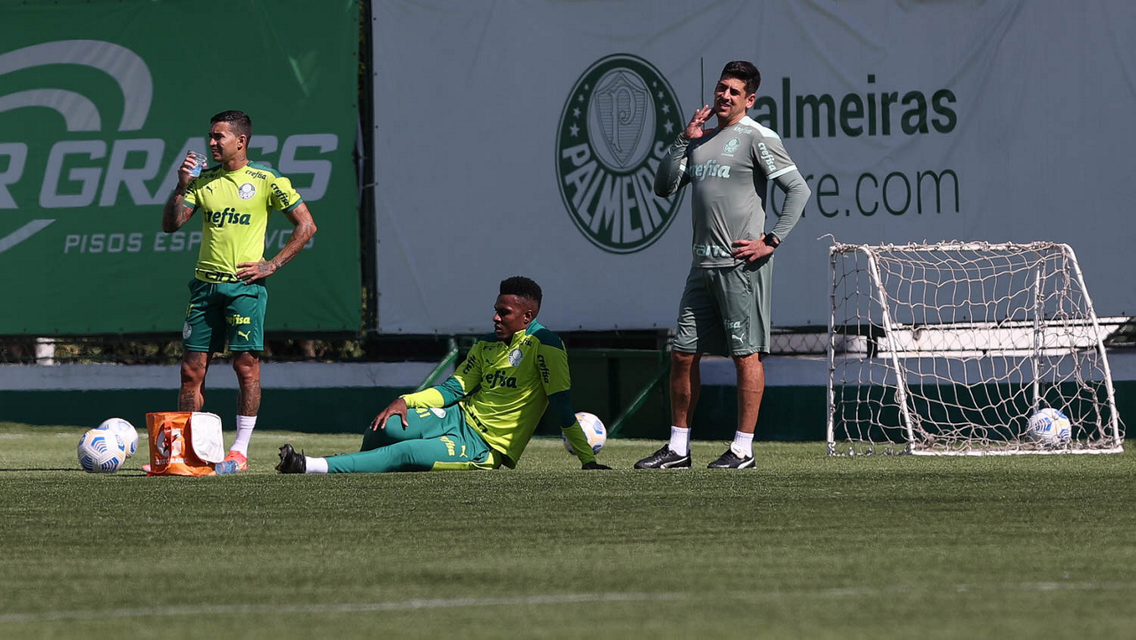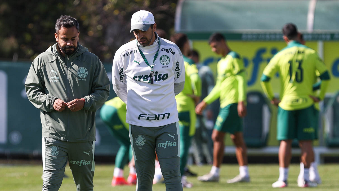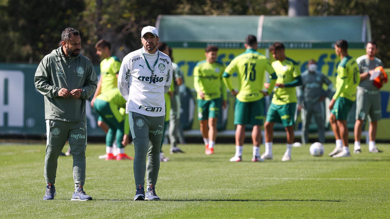 O técnico Abel Ferreira e o coordenador científico Daniel Gonçalves (E), da SE Palmeiras, durante treinamento, na Academia de Futebol. (Foto: Cesar Greco)