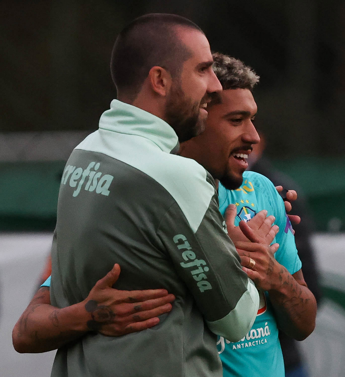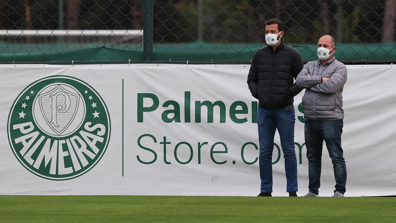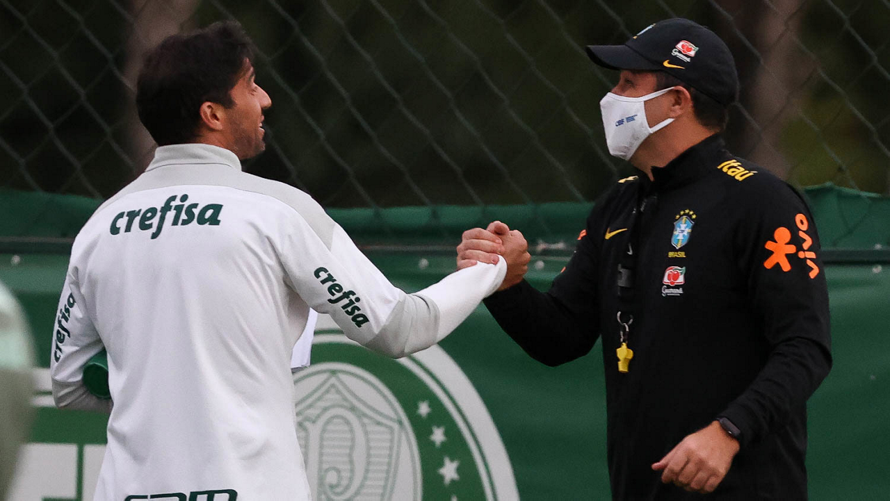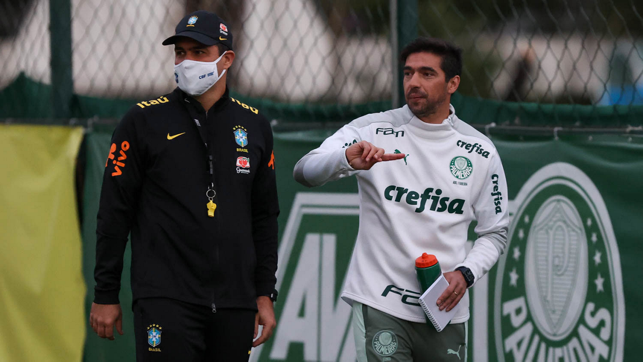 O técnico Abel Ferreira, da SE Palmeiras, e o técnico da seleção brasileira olímpica Andre Jardine (E), durante treinamento, na Academia de Futebol. (Foto: Cesar Greco)