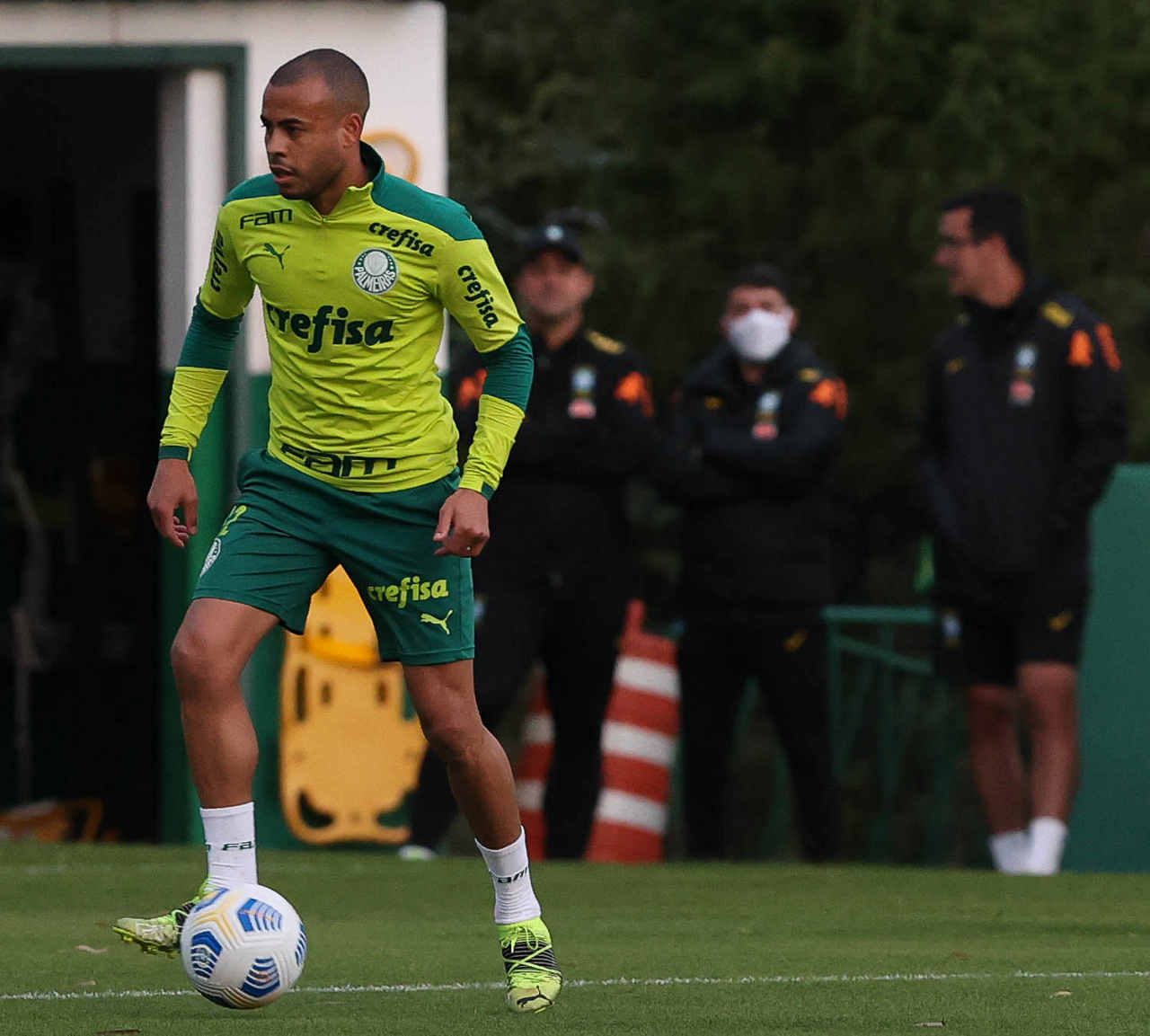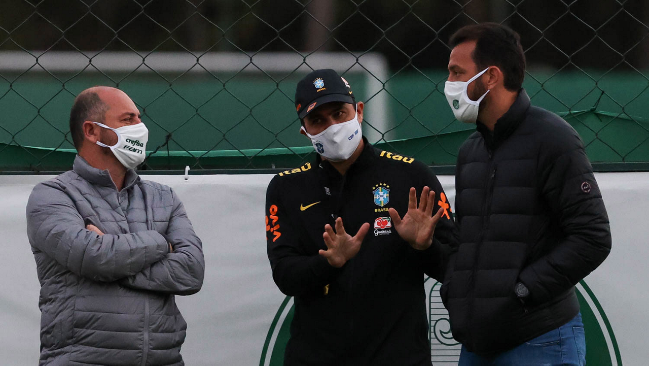 O gerente de futebol Cicero Souza e o assessor técnico Edu Dracena (E e D), da SE Palmeiras, e o técnico da seleção brasileira olímpica Andre Jardine (C), durante treinamento, na Academia de Futebol. (Foto: Cesar Greco)