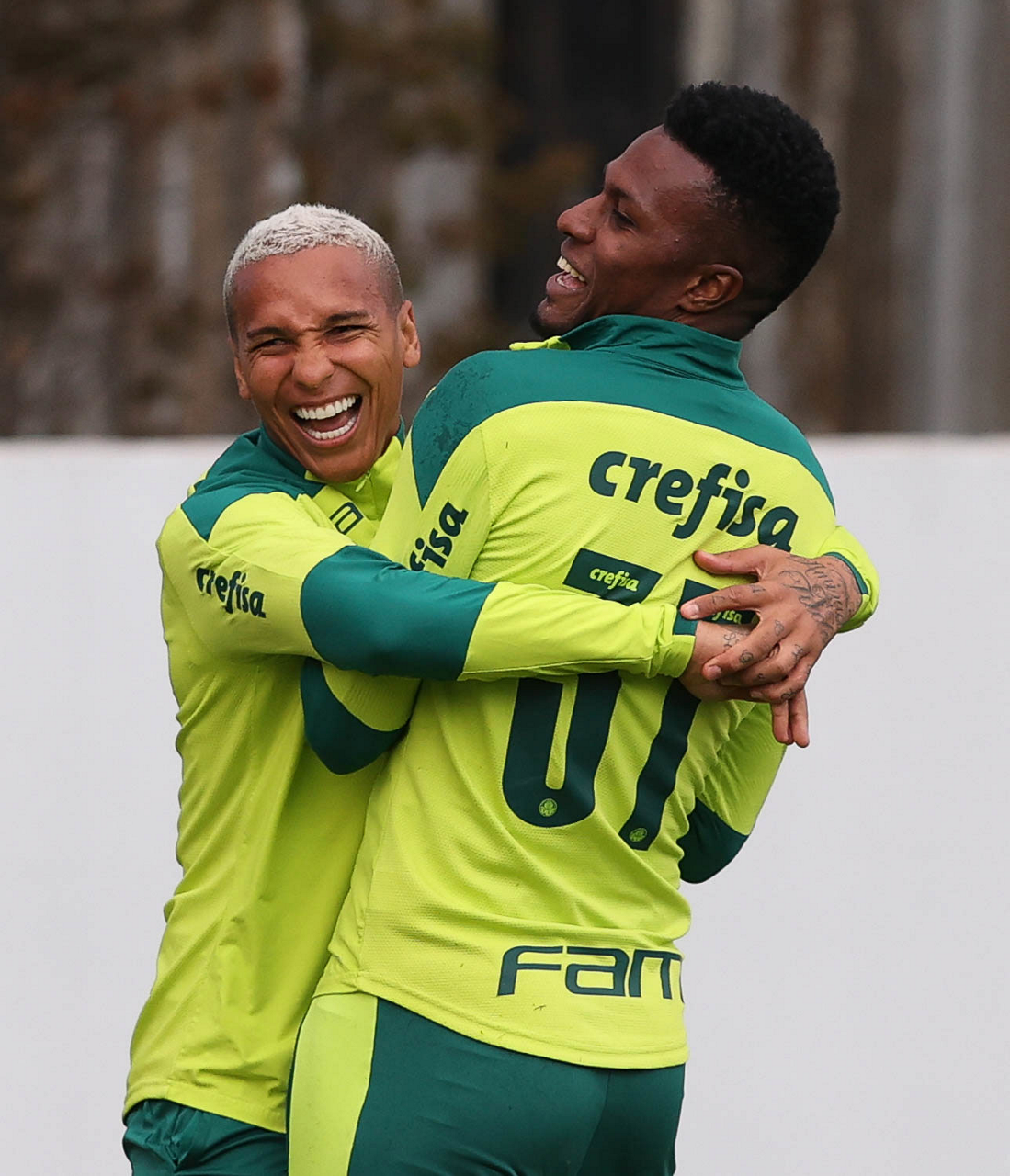 Os jogadores Deyverson e Pedrão (D), da SE Palmeiras, durante treinamento, na Academia de Futebol. (Foto: Cesar Greco)