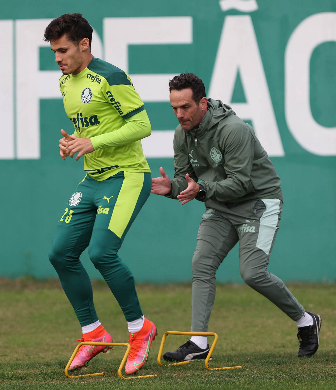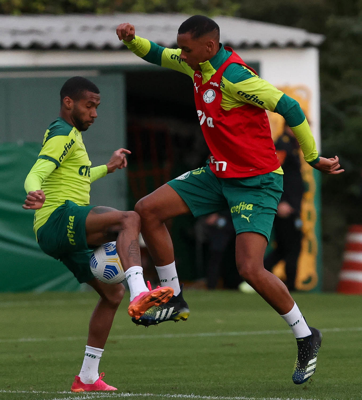 O jogador Raphael Veiga e o preparador físico Marco Aurélio (D), da SE Palmeiras, durante treinamento, na Academia de Futebol. (Foto: Cesar Greco)