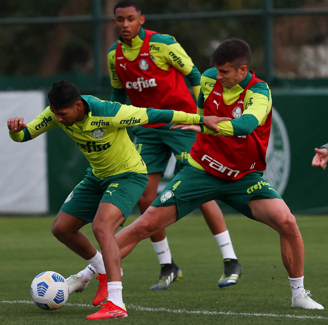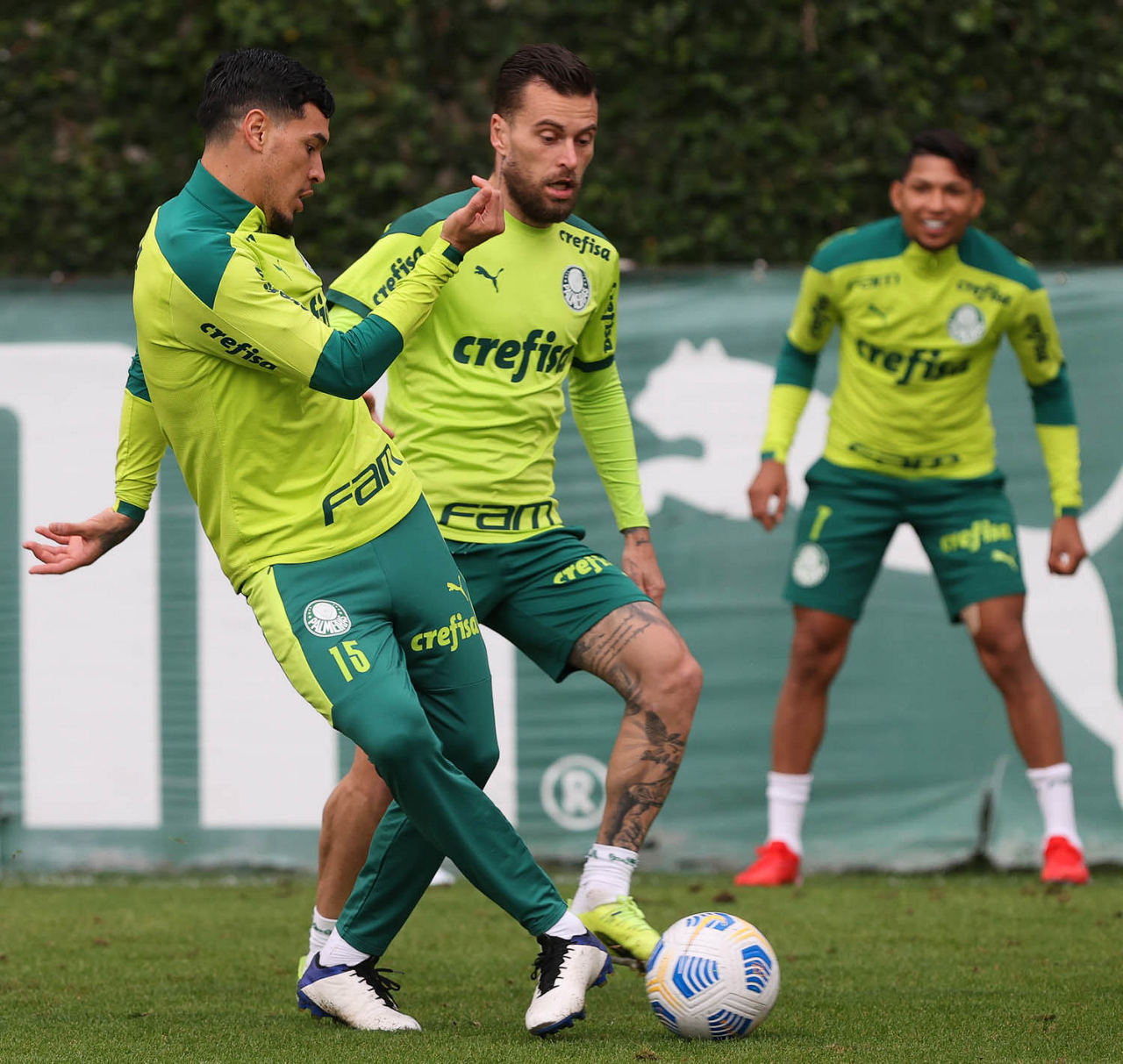 Os jogadores Patrick de Paula e Zé Rafael (D), da SE Palmeiras, durante treinamento, na Academia de Futebol. (Foto: Cesar Greco)