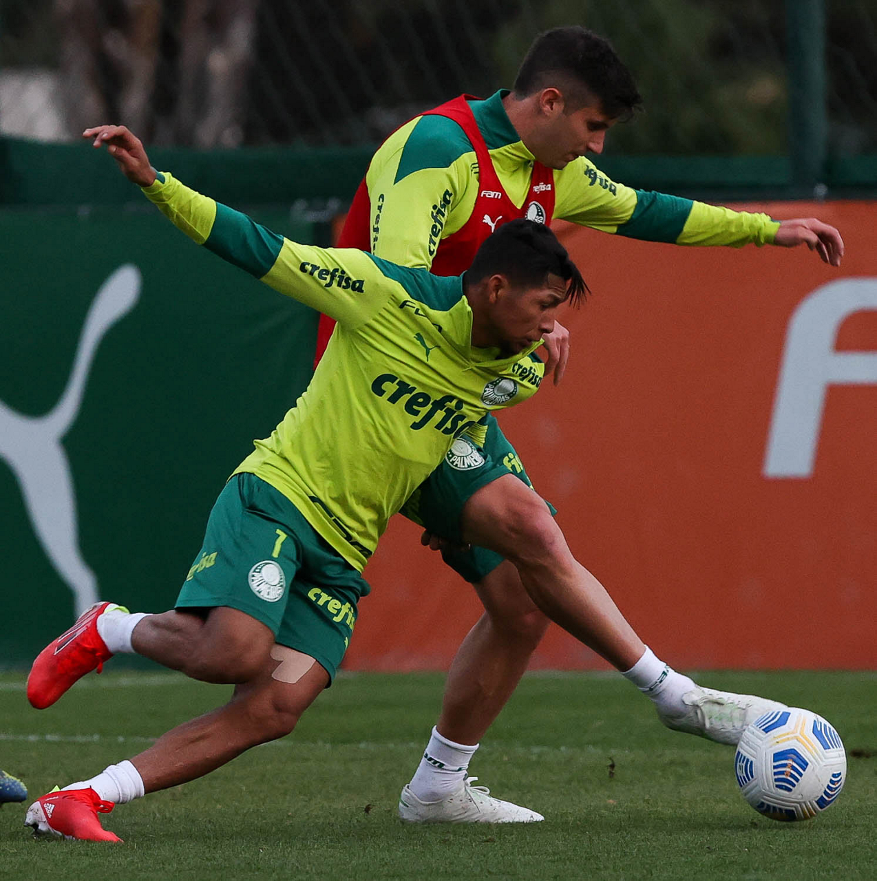 Os jogadores Rony e Benjamín Kuscevic (D), da SE Palmeiras, durante treinamento, na Academia de Futebol. (Foto: Cesar Greco)