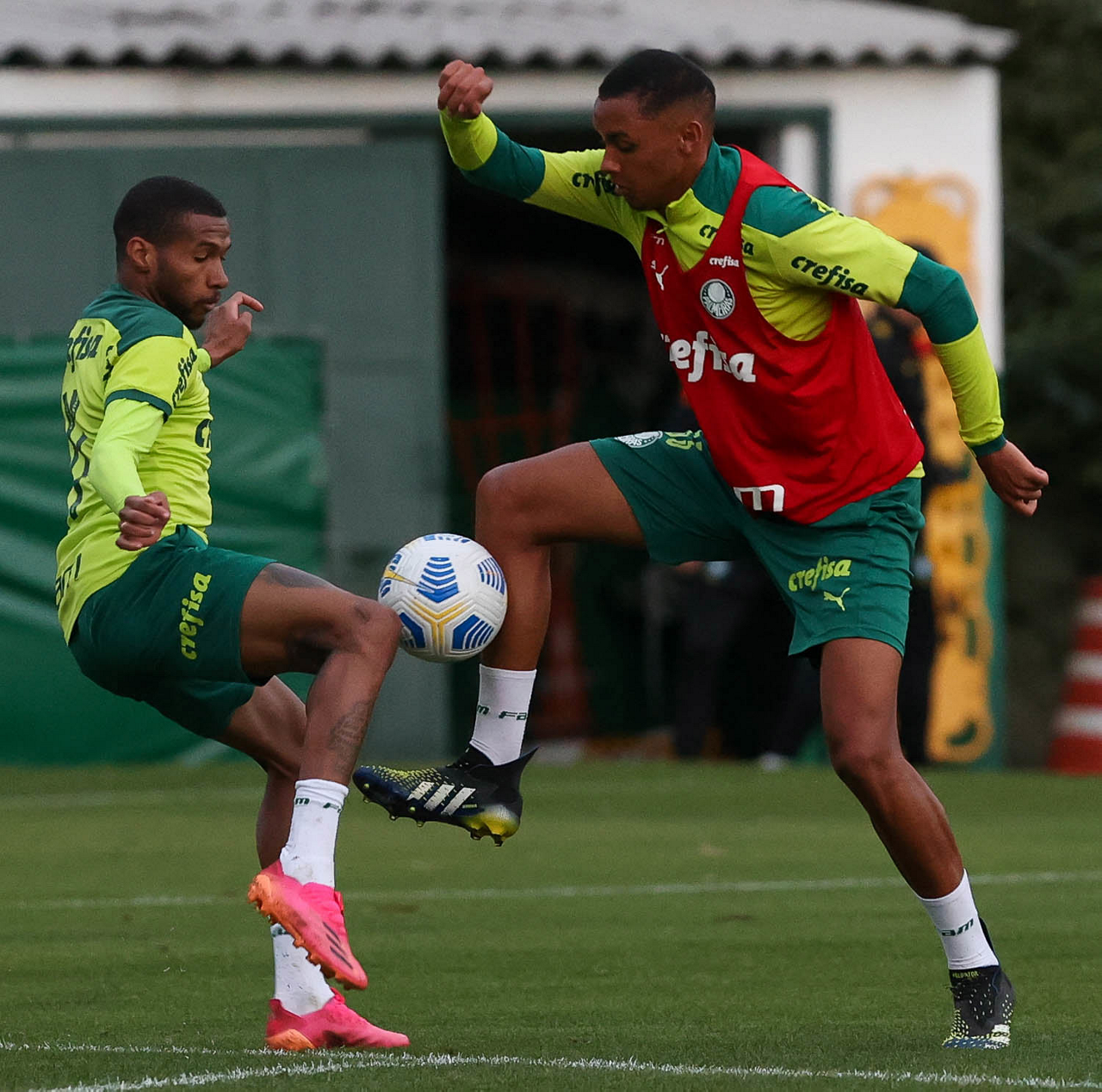 Os jogadores Patrick de Paula e Danilo Barbosa (D), da SE Palmeiras, durante treinamento, na Academia de Futebol. (Foto: Cesar Greco)