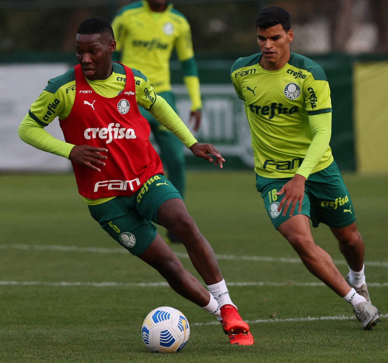 Os jogadores Benjamín Kuscevic e Breno Lopes (D), da SE Palmeiras, durante treinamento, na Academia de Futebol. (Foto: Cesar Greco)