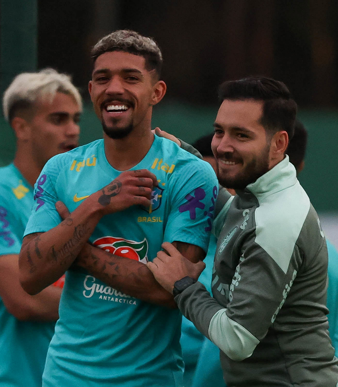 Os jogadores Luan e Gustavo Gómez (D), da SE Palmeiras, durante treinamento, na Academia de Futebol. (Foto: Cesar Greco)