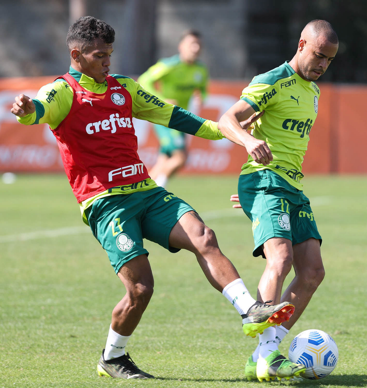 Os jogadores Gabriel Menino e Breno Lopes (D), da SE Palmeiras, durante treinamento, na Academia de Futebol. (Foto: Cesar Greco)