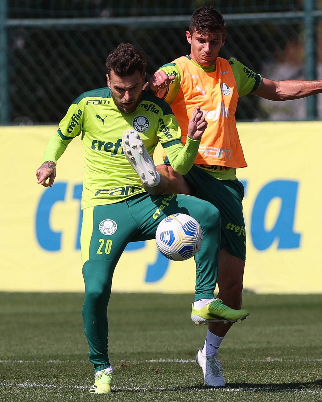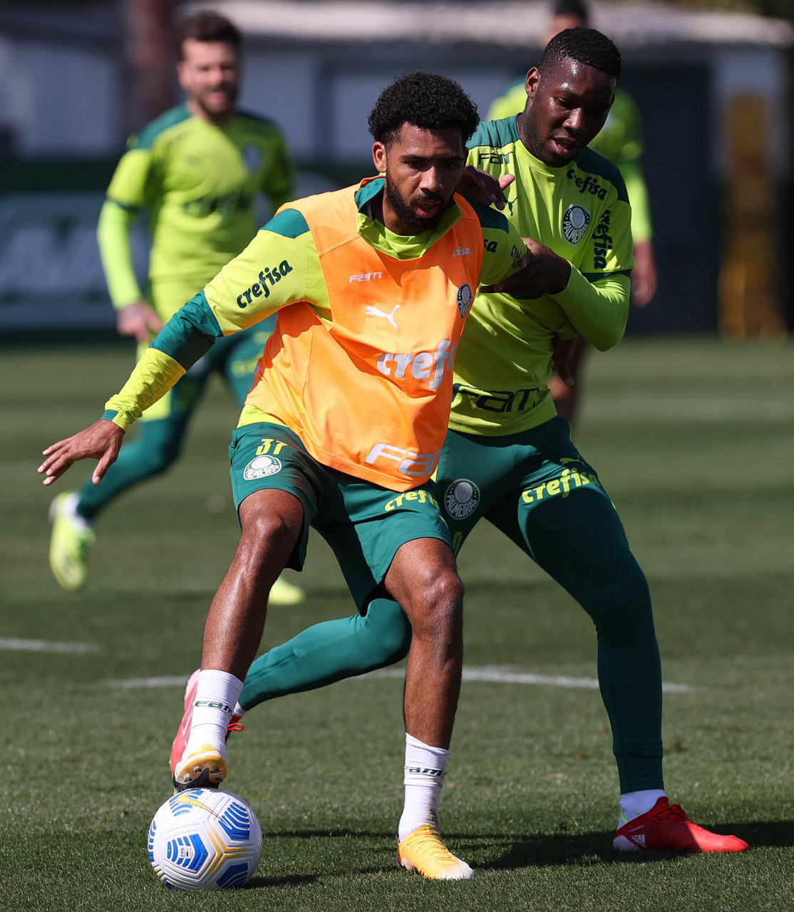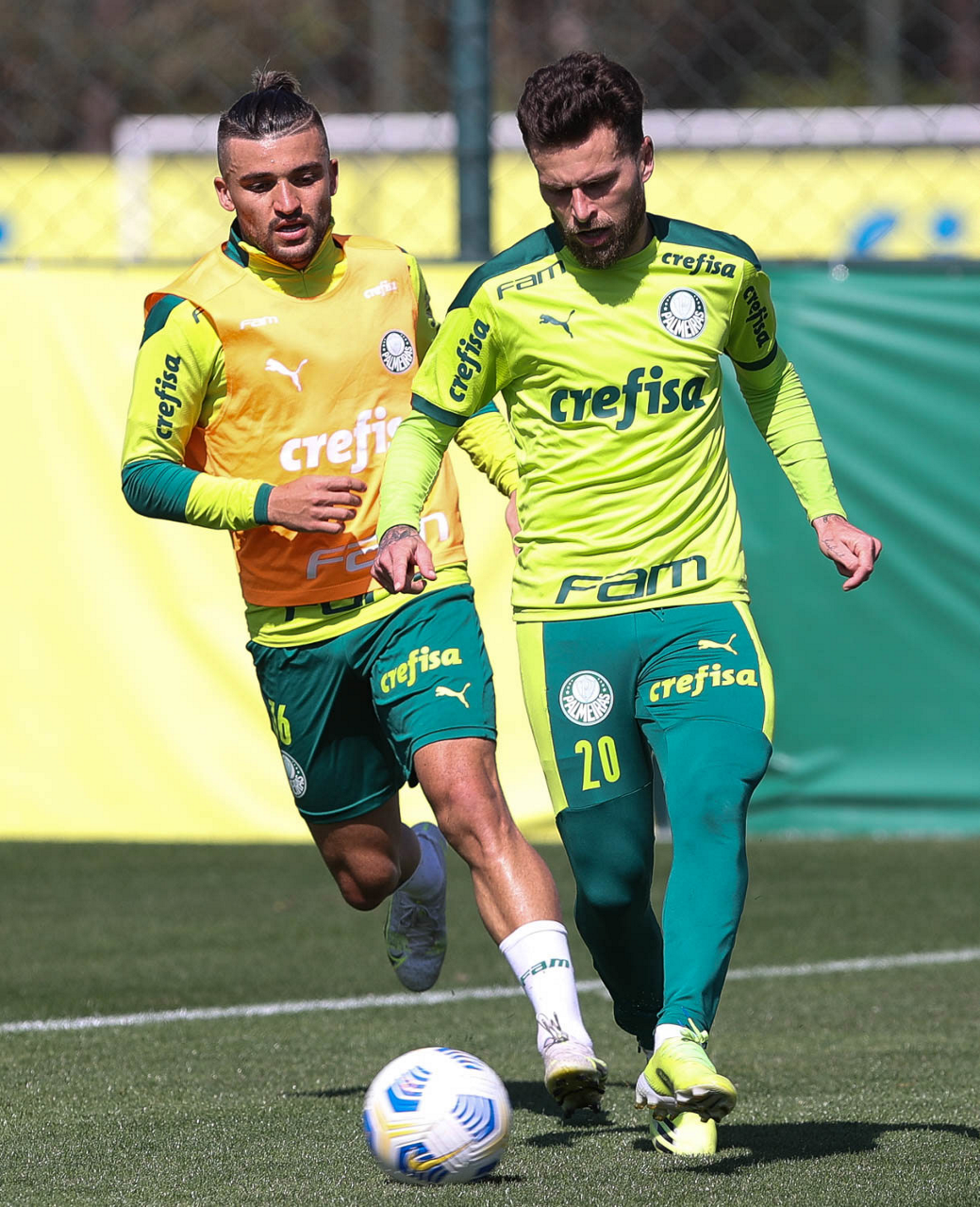 Os jogadores Matheus Fernandes e Patrick de Paula (D), da SE Palmeiras, durante treinamento, na Academia de Futebol. (Foto: Cesar Greco)