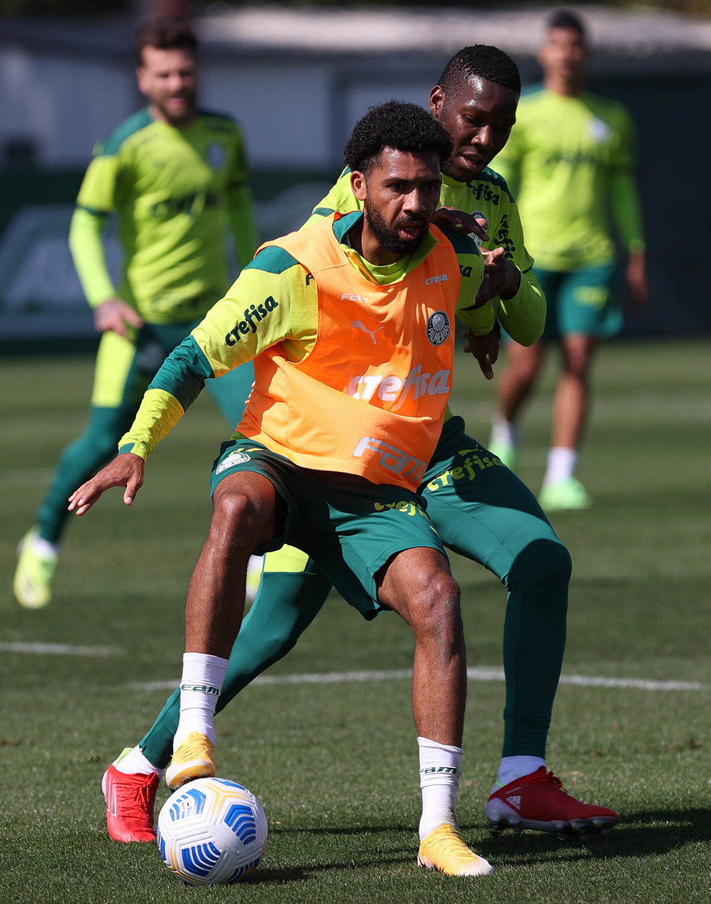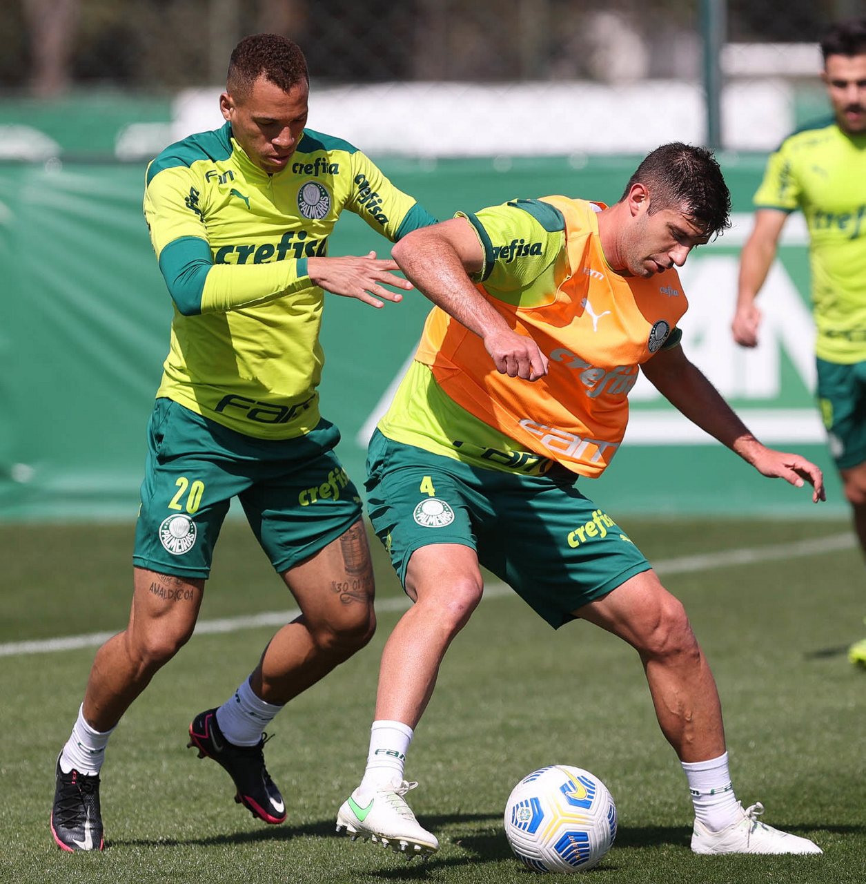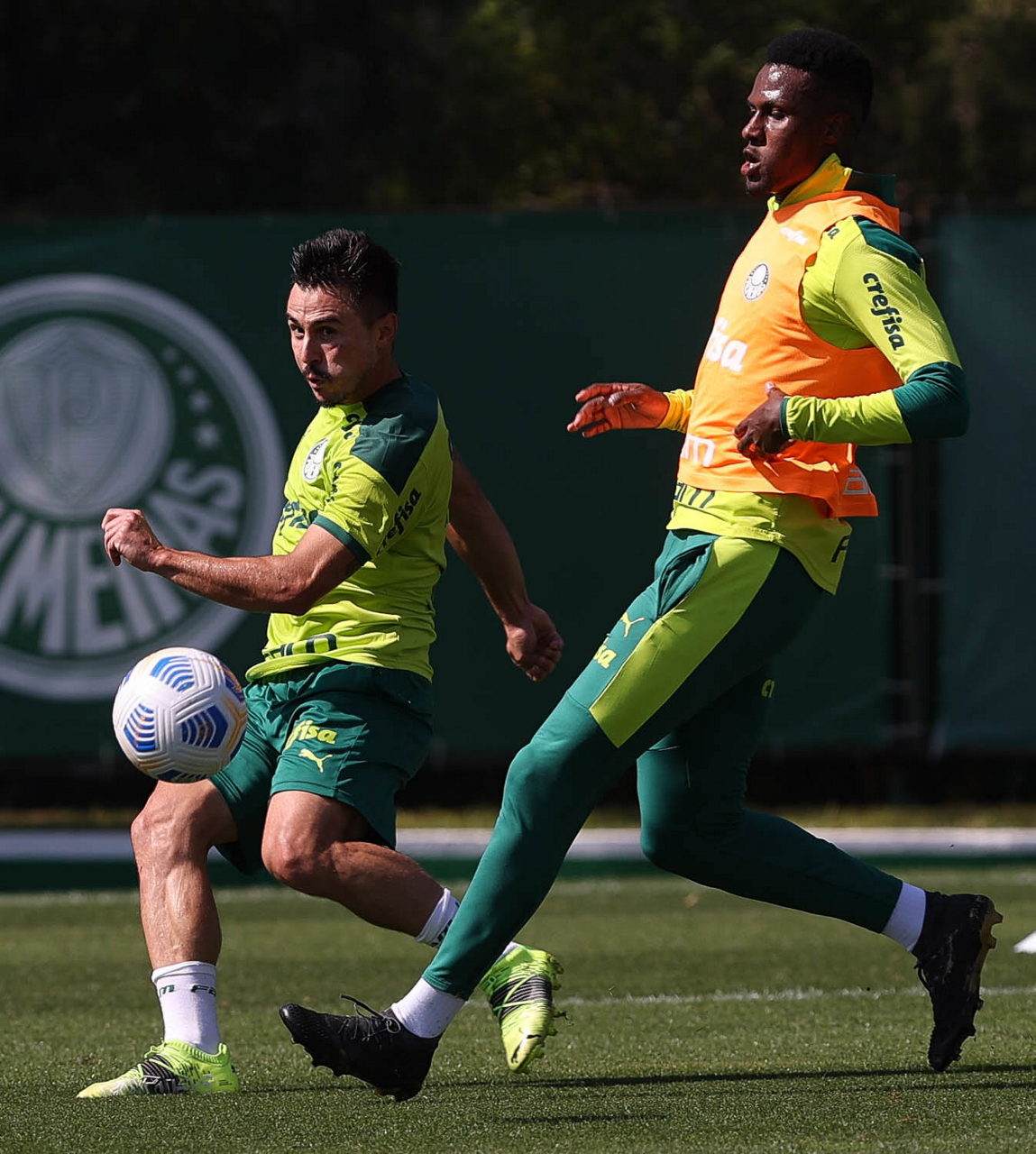 Os jogadores Matheus Fernandes e Patrick de Paula (D), da SE Palmeiras, durante treinamento, na Academia de Futebol. (Foto: Cesar Greco)