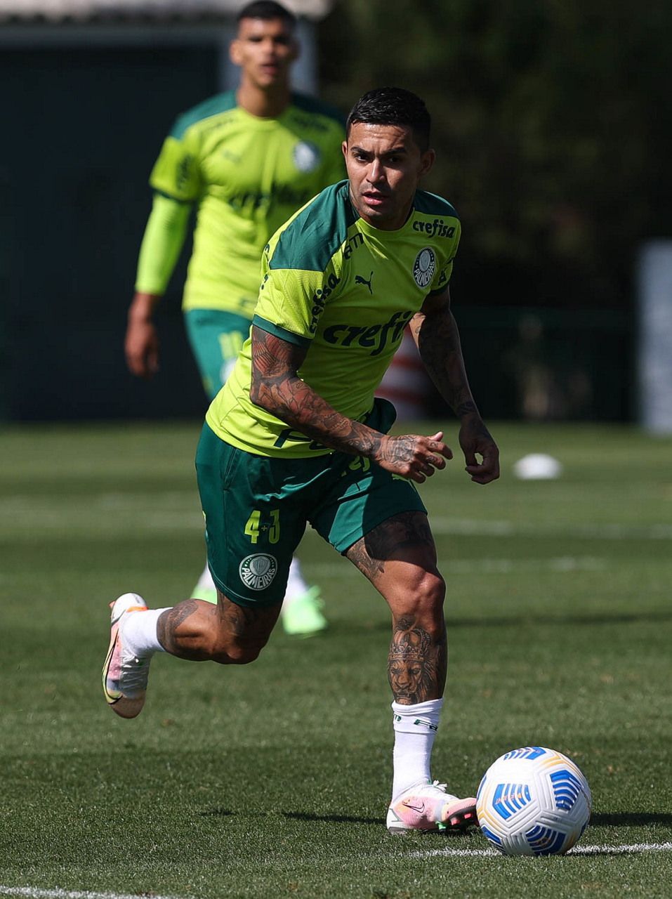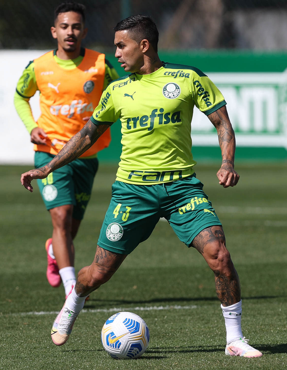 Os jogadores Benjamín Kuscevic e Dudu (D), da SE Palmeiras, durante treinamento, na Academia de Futebol. (Foto: Cesar Greco)