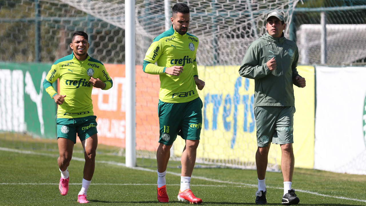 Os jogadores Rony e Luan e o preparador físico Thiago Maldonado (E/D), da SE Palmeiras, durante treinamento, na Academia de Futebol. (Foto: Cesar Greco)
