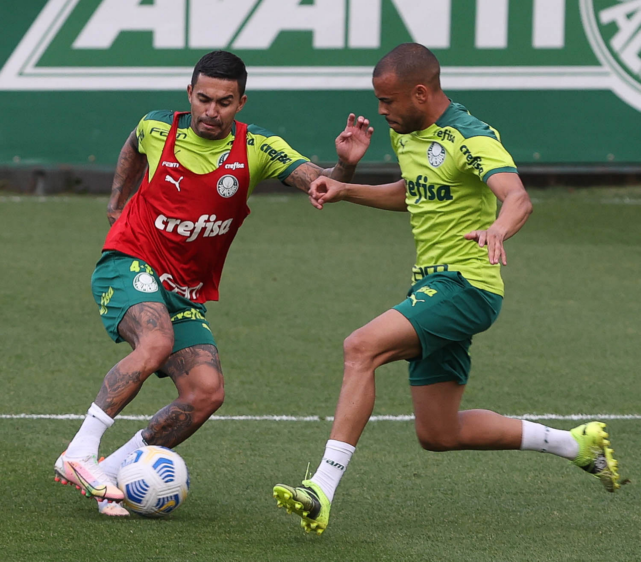 Os jogadores Dudu e Mayke (D), da SE Palmeiras, durante treinamento, na Academia de Futebol. (Foto: Cesar Greco)