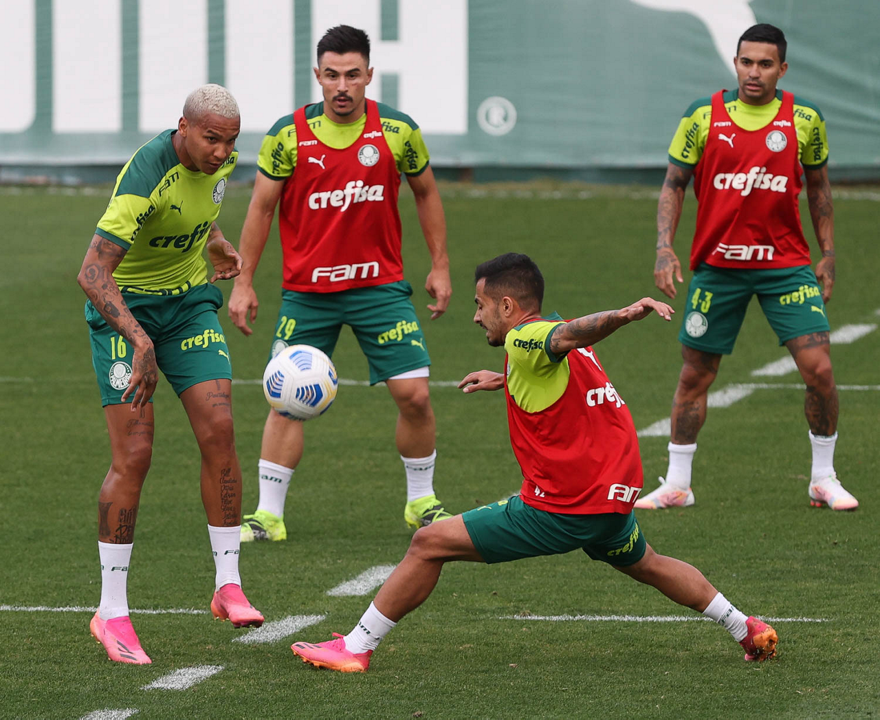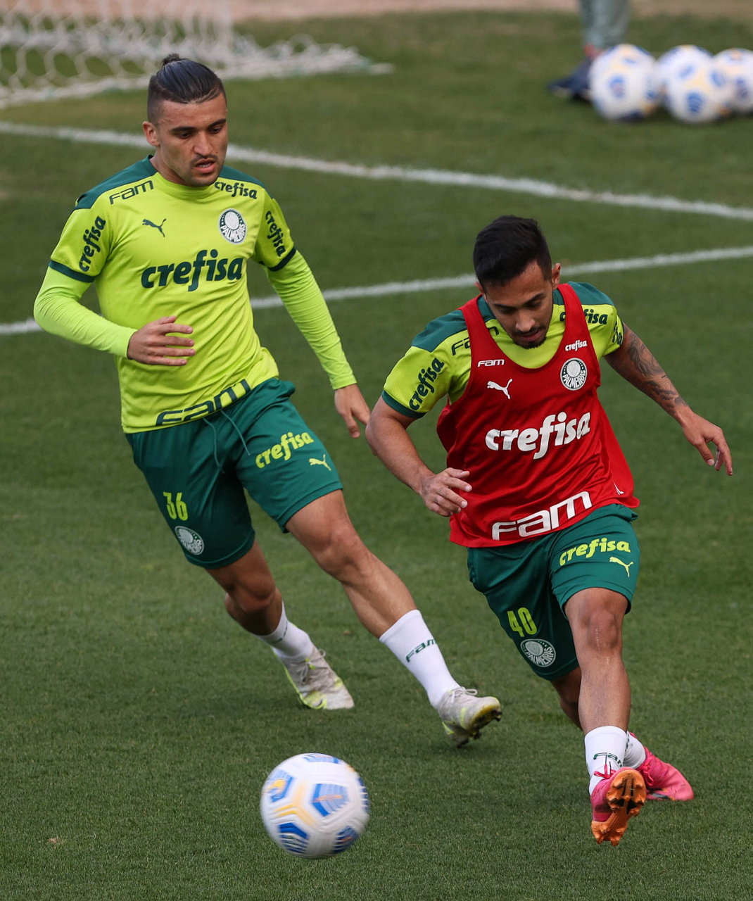 Os jogadores Deyverson e Alan (D), da SE Palmeiras, durante treinamento, na Academia de Futebol. (Foto: Cesar Greco)
