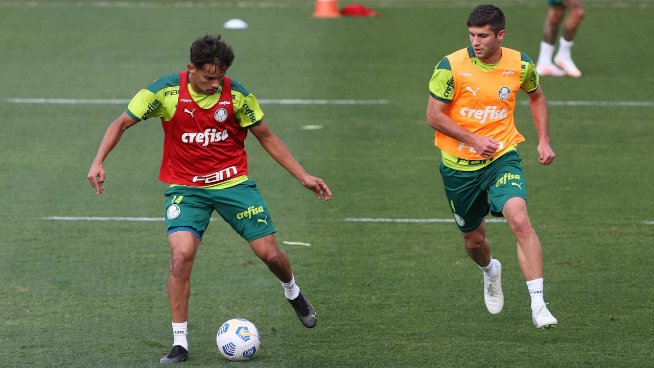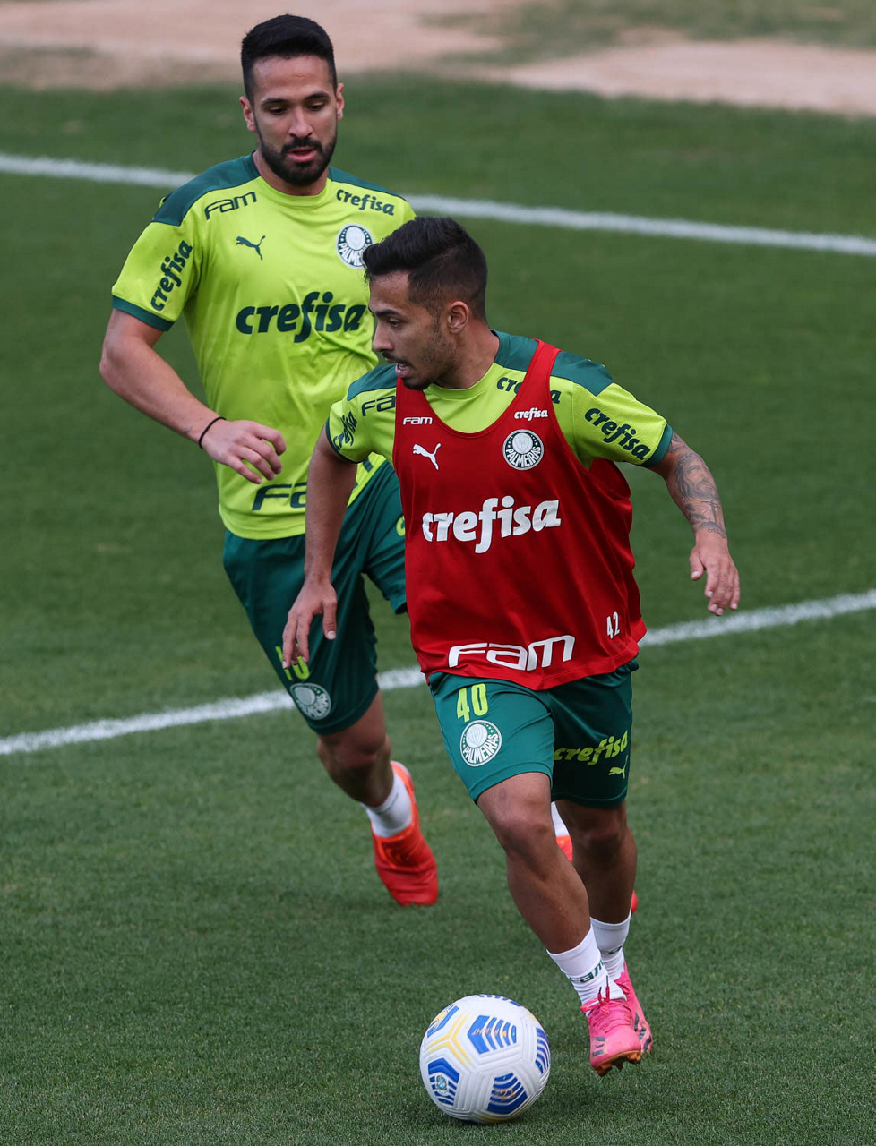 Os jogadores Gustavo Scarpa e Benjamín Kuscevic (D), da SE Palmeiras, durante treinamento, na Academia de Futebol. (Foto: Cesar Greco)