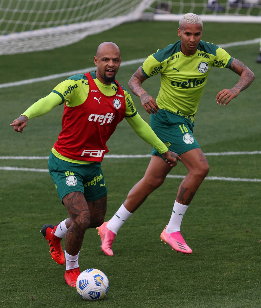 Os jogadores Felipe Melo e Deyverson (D), da SE Palmeiras, durante treinamento, na Academia de Futebol. (Foto: Cesar Greco)