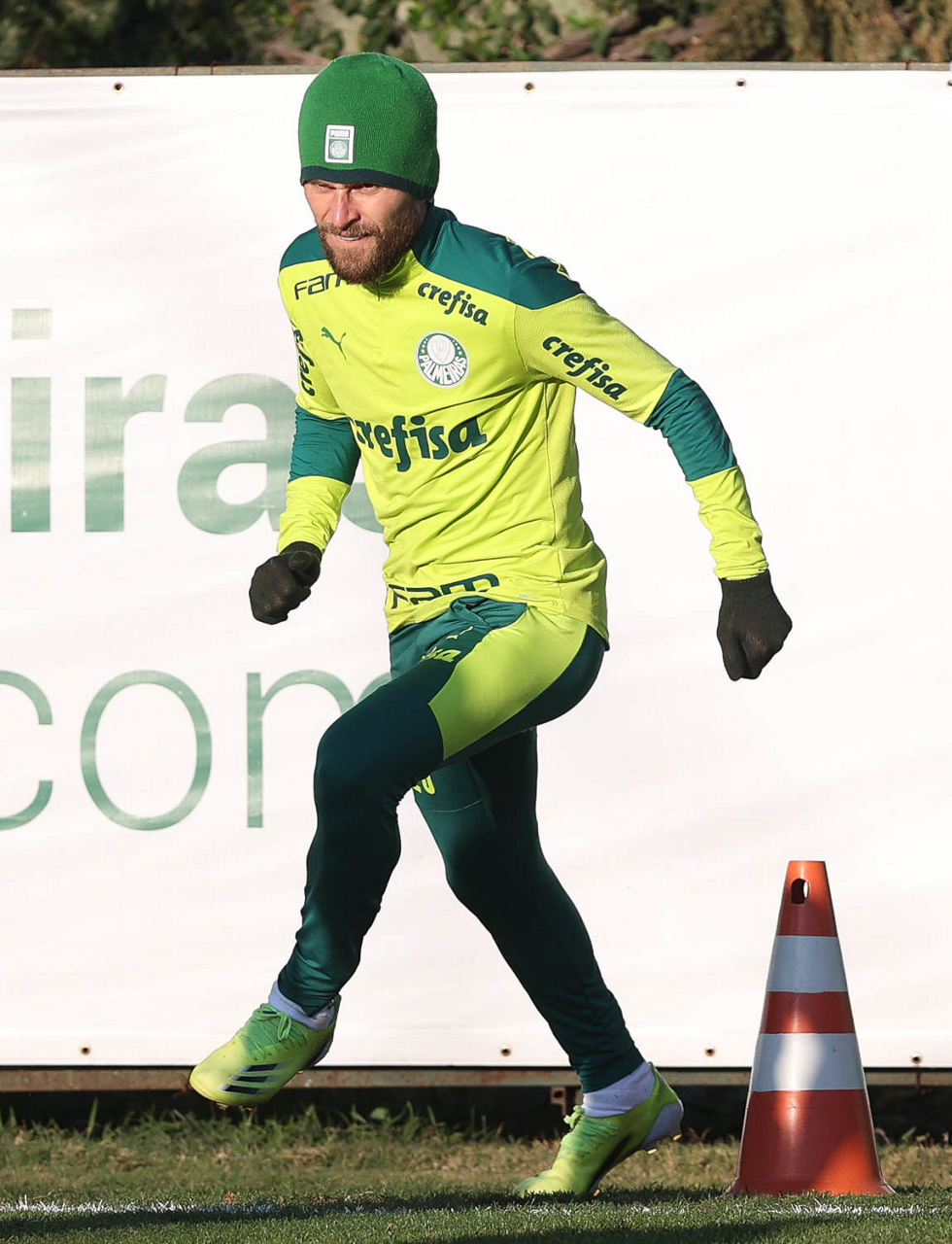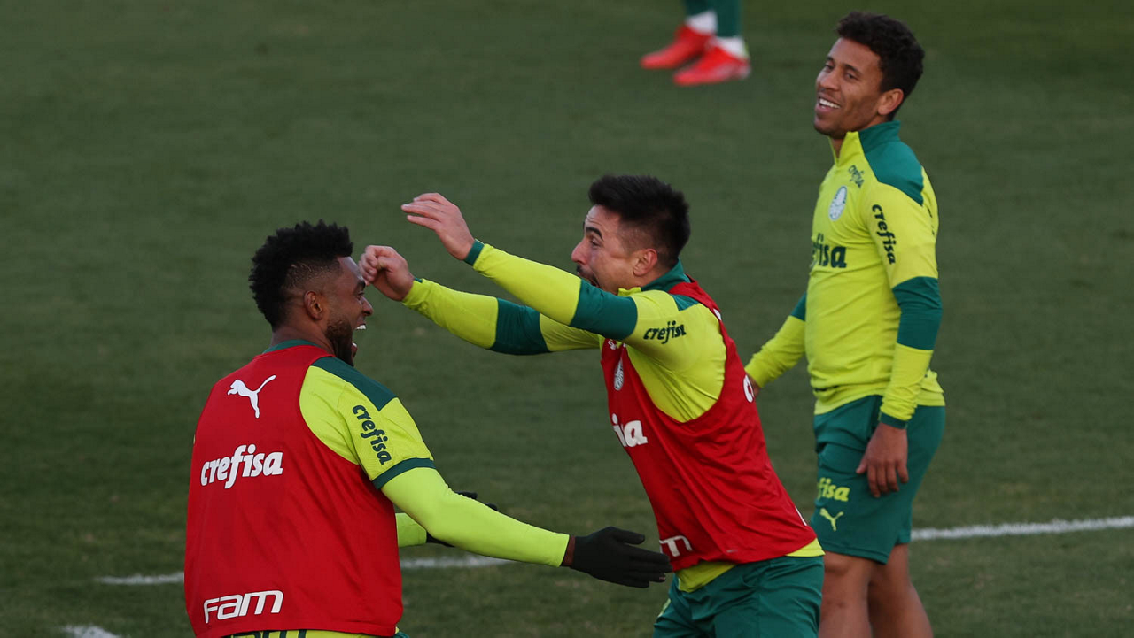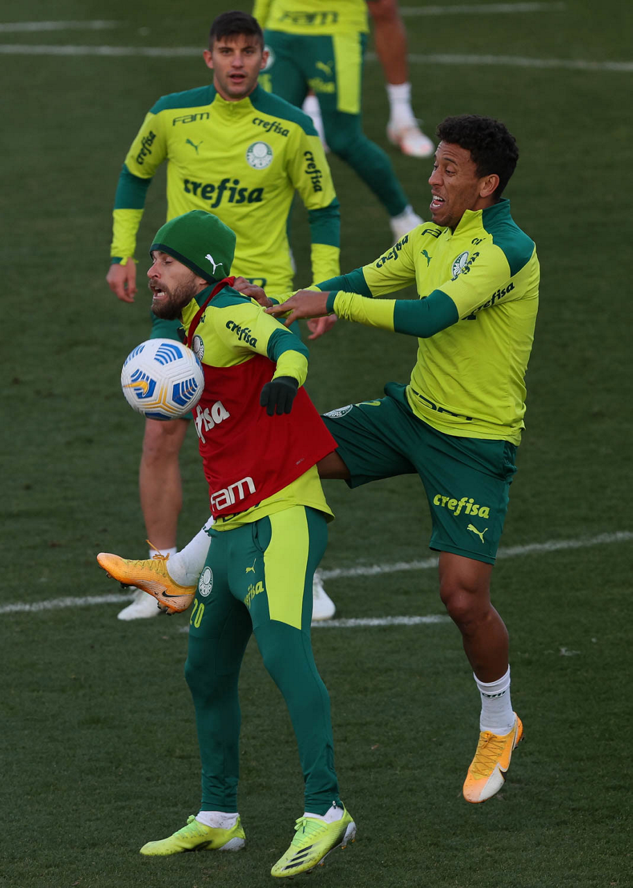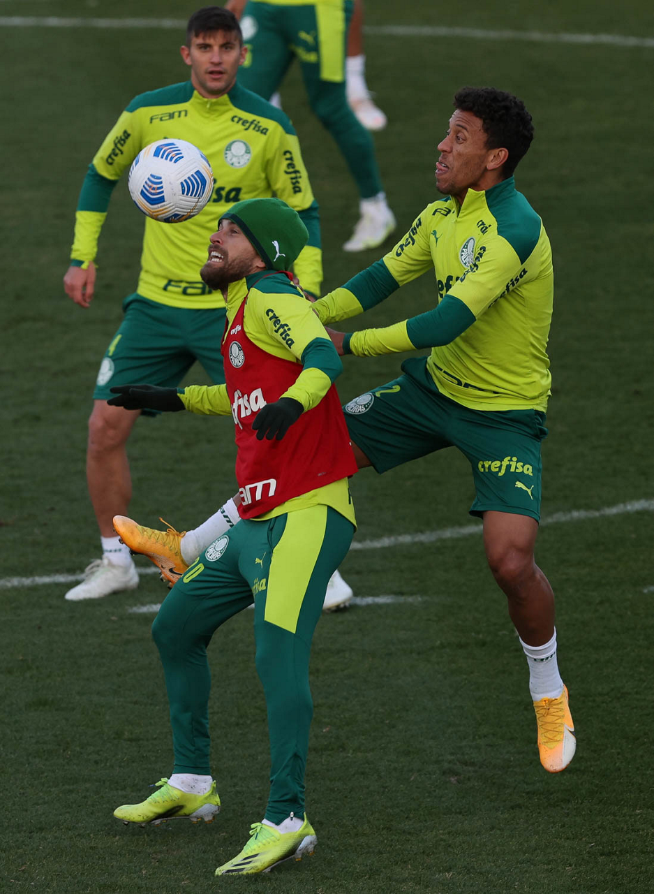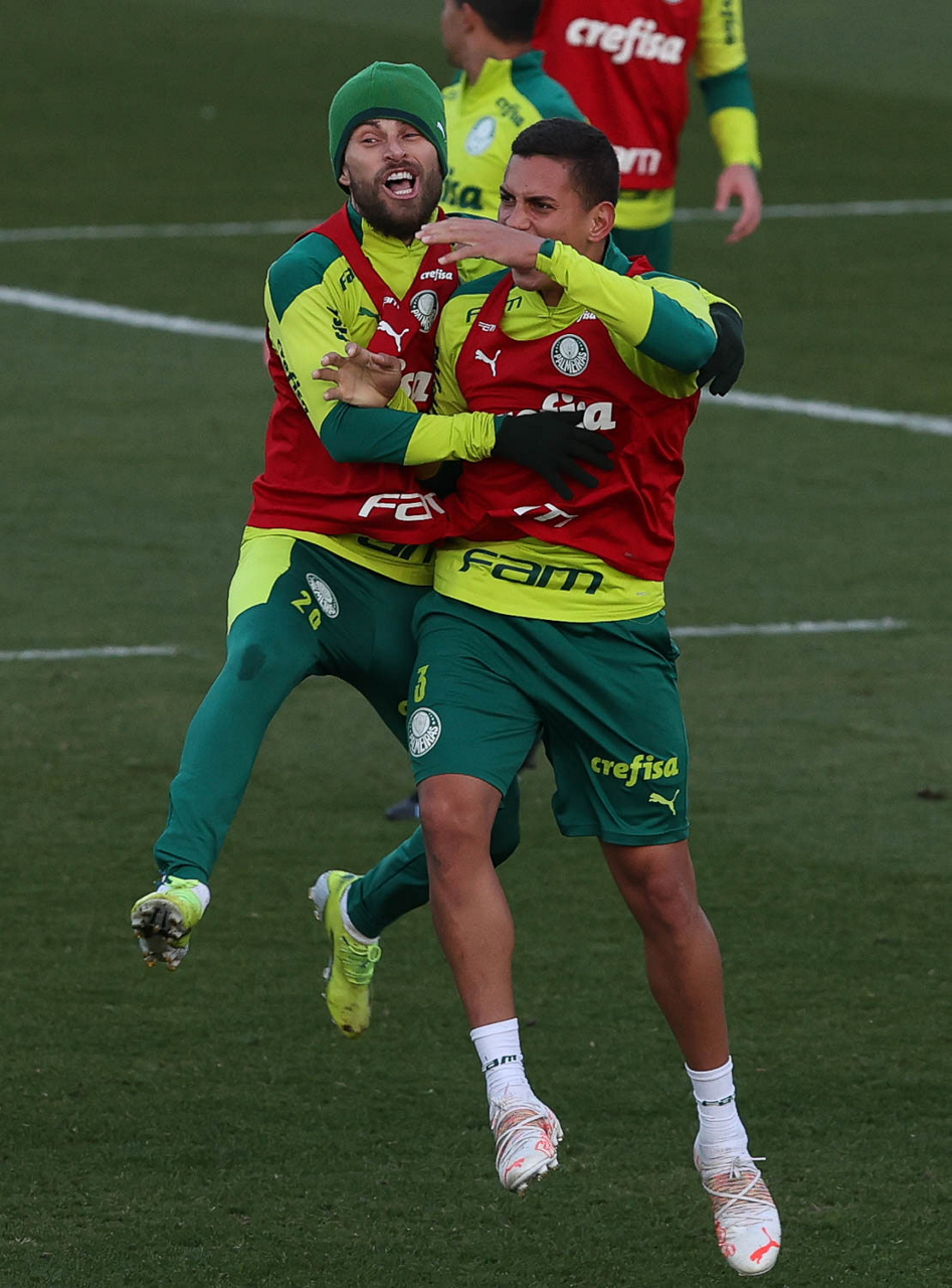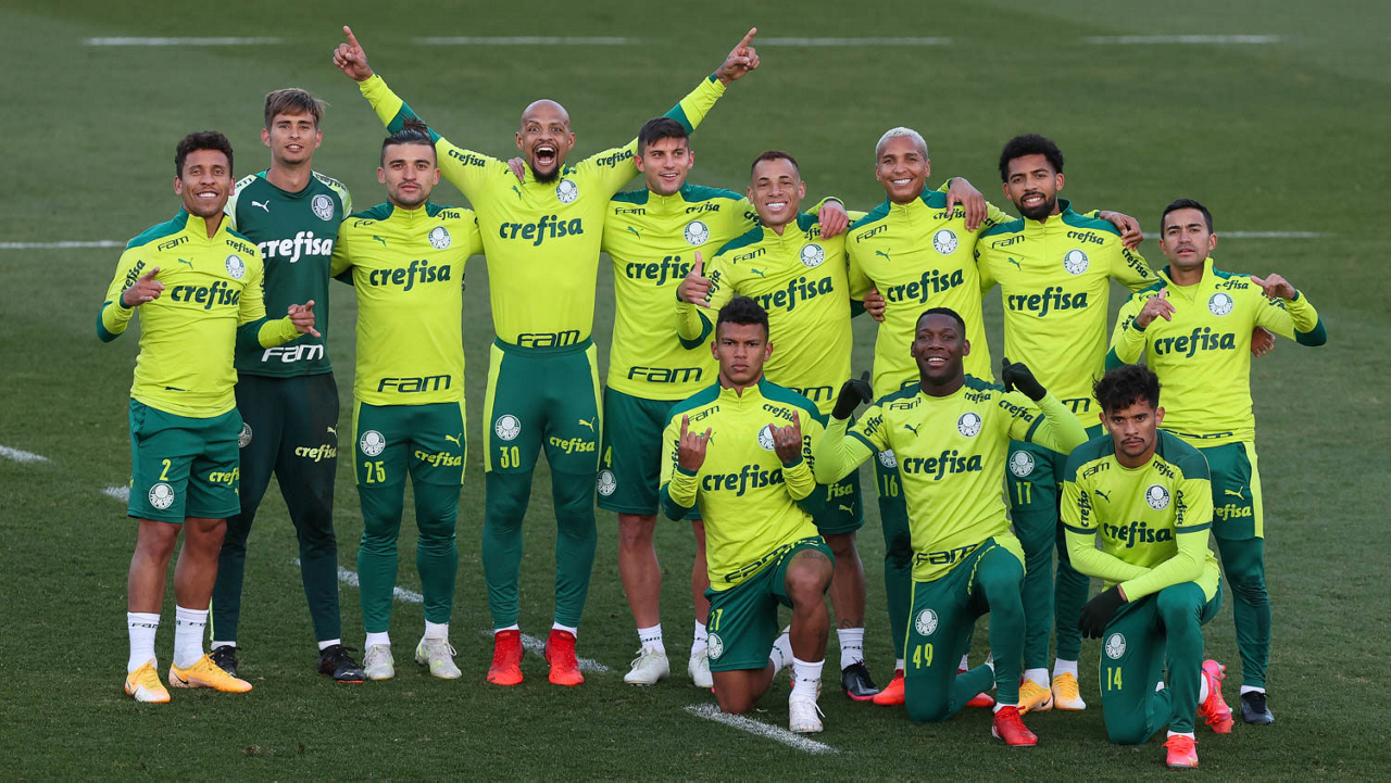 O goleiro Bruno (E) e os jogadores Marcos Rocha, Victor Luis, Felipe Melo, Benjamín Kuscevic, Breno Lopes, Deyverson, Mathesu Fernades e Dudu (E/D em pé) e Gabriel Veron, Patrick de Paula e Gustavo Scarpa (E/D agachados), da SE Palmeiras, durante treinamento, na Academia de Futebol. (Foto: Cesar Greco)