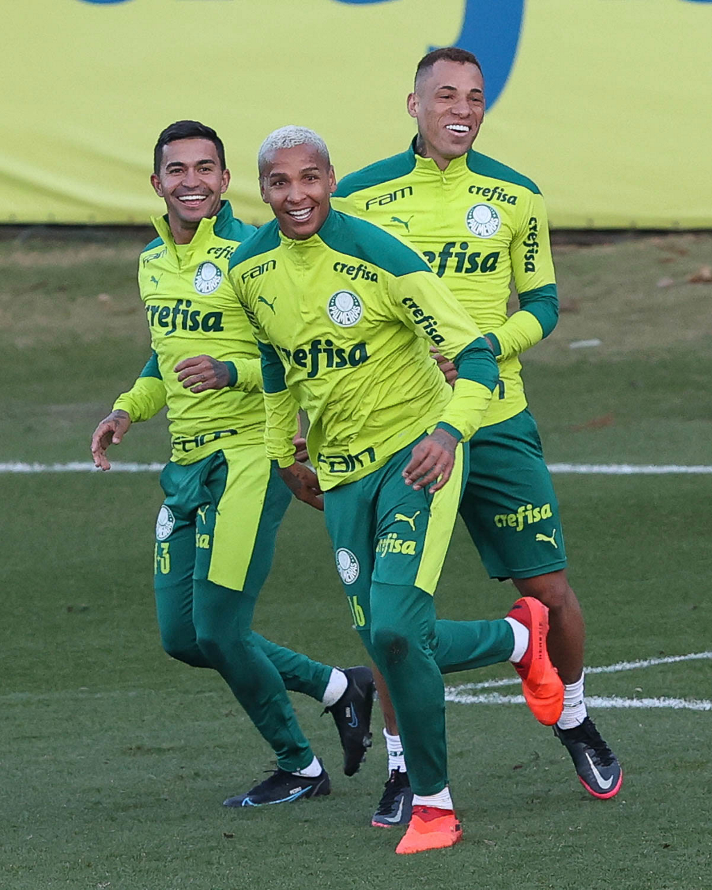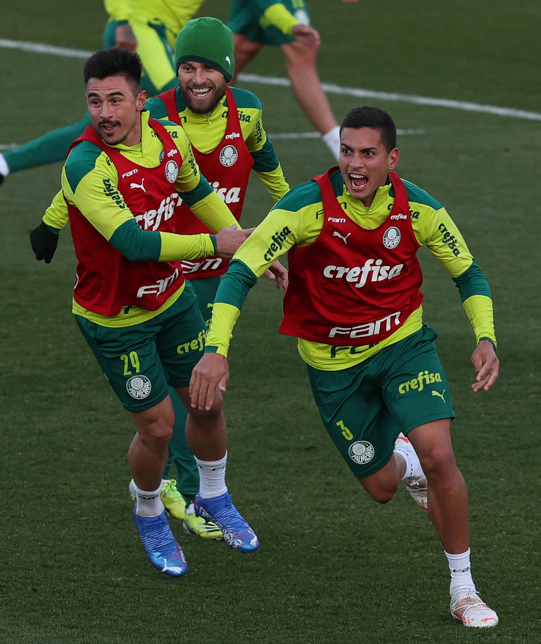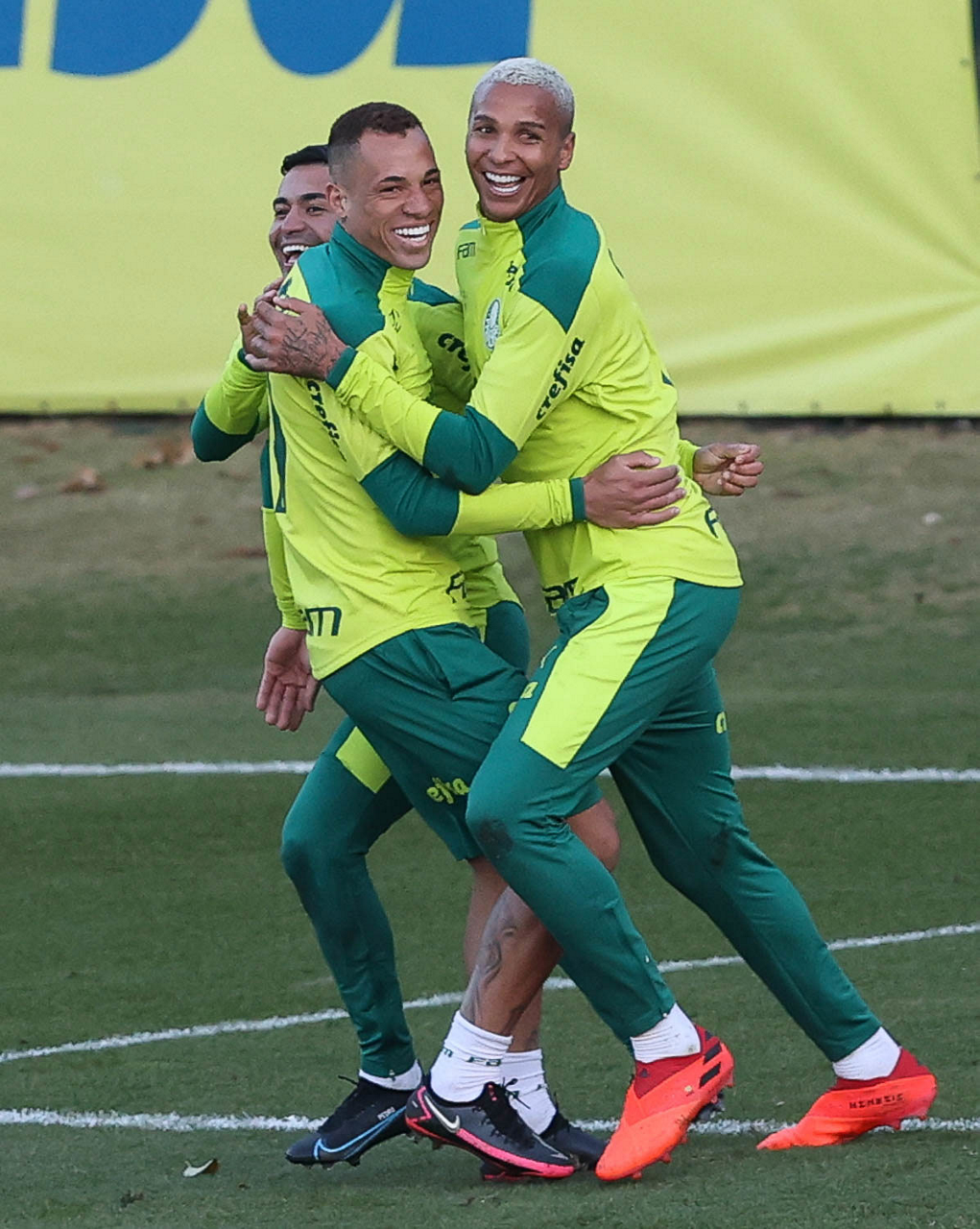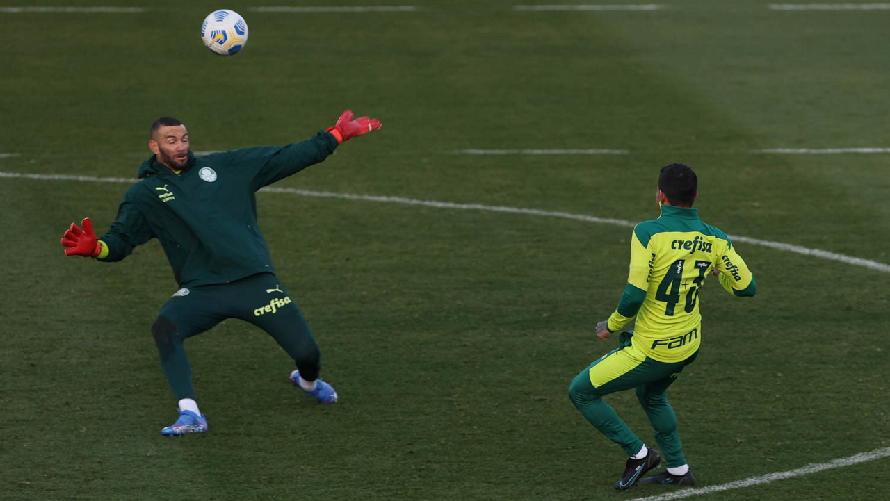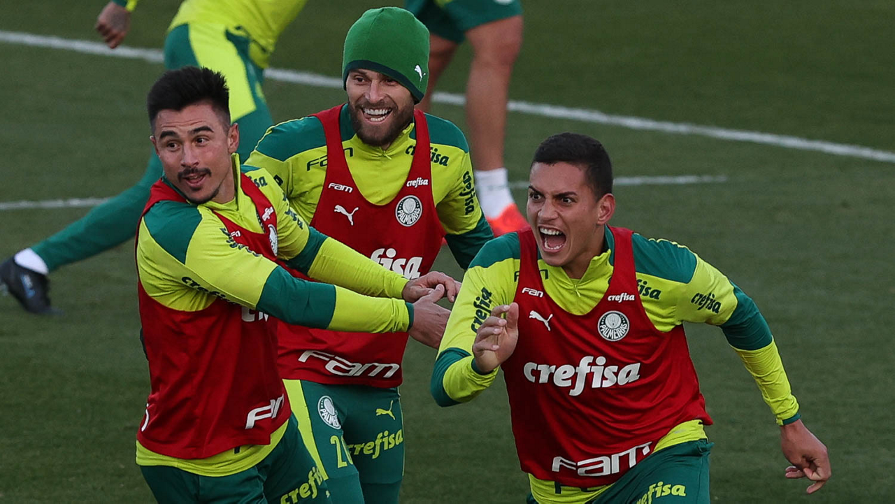 O goleiro Bruno (E) e os jogadores Marcos Rocha, Victor Luis, Felipe Melo, Benjamín Kuscevic, Breno Lopes, Deyverson, Mathesu Fernades e Dudu (E/D em pé) e Gabriel Veron, Patrick de Paula e Gustavo Scarpa (E/D agachados), da SE Palmeiras, durante treinamento, na Academia de Futebol. (Foto: Cesar Greco)