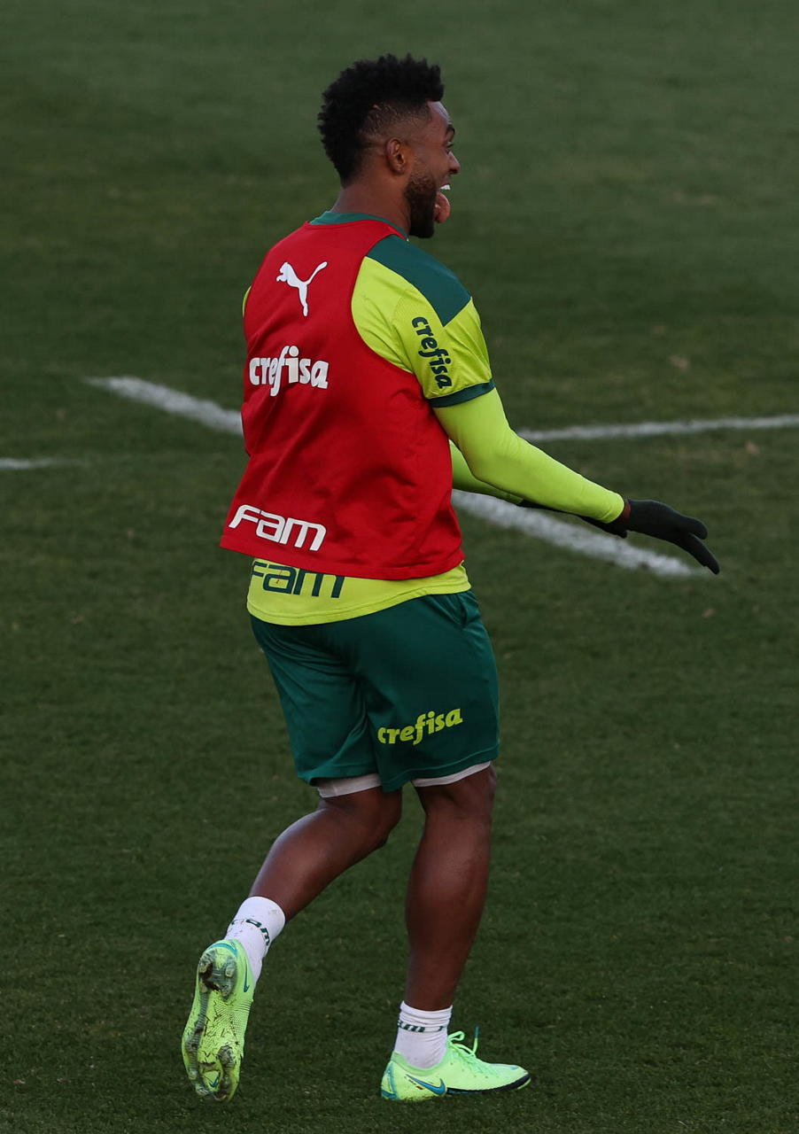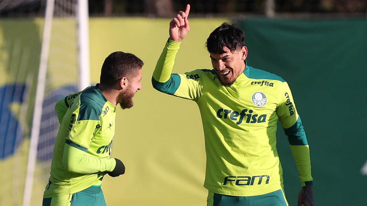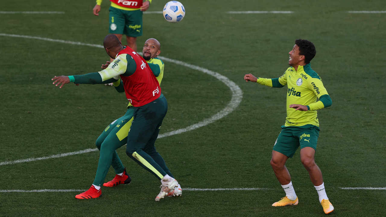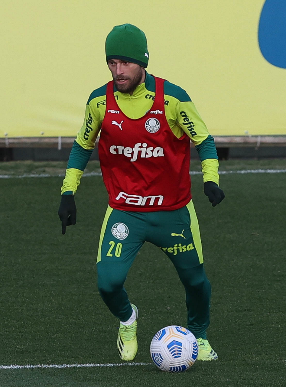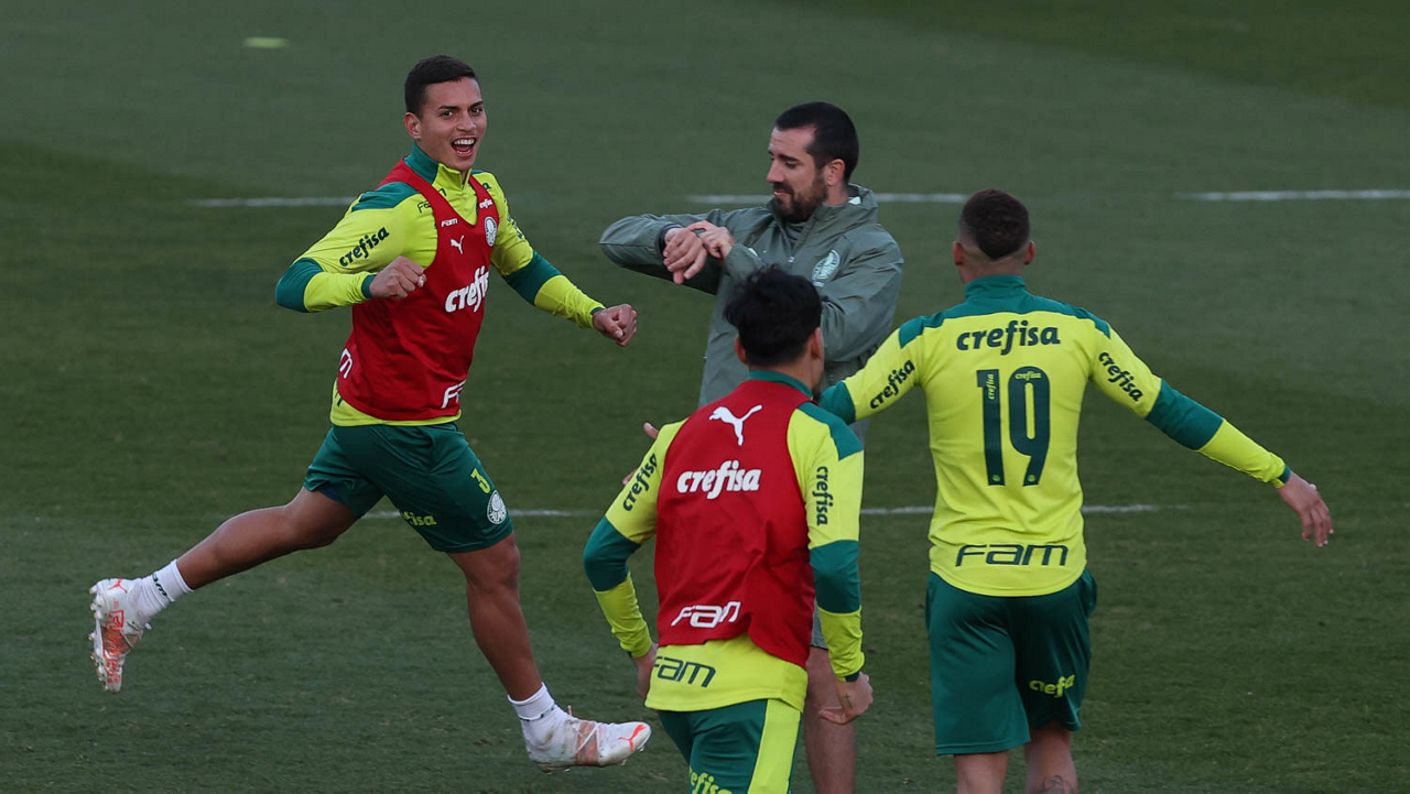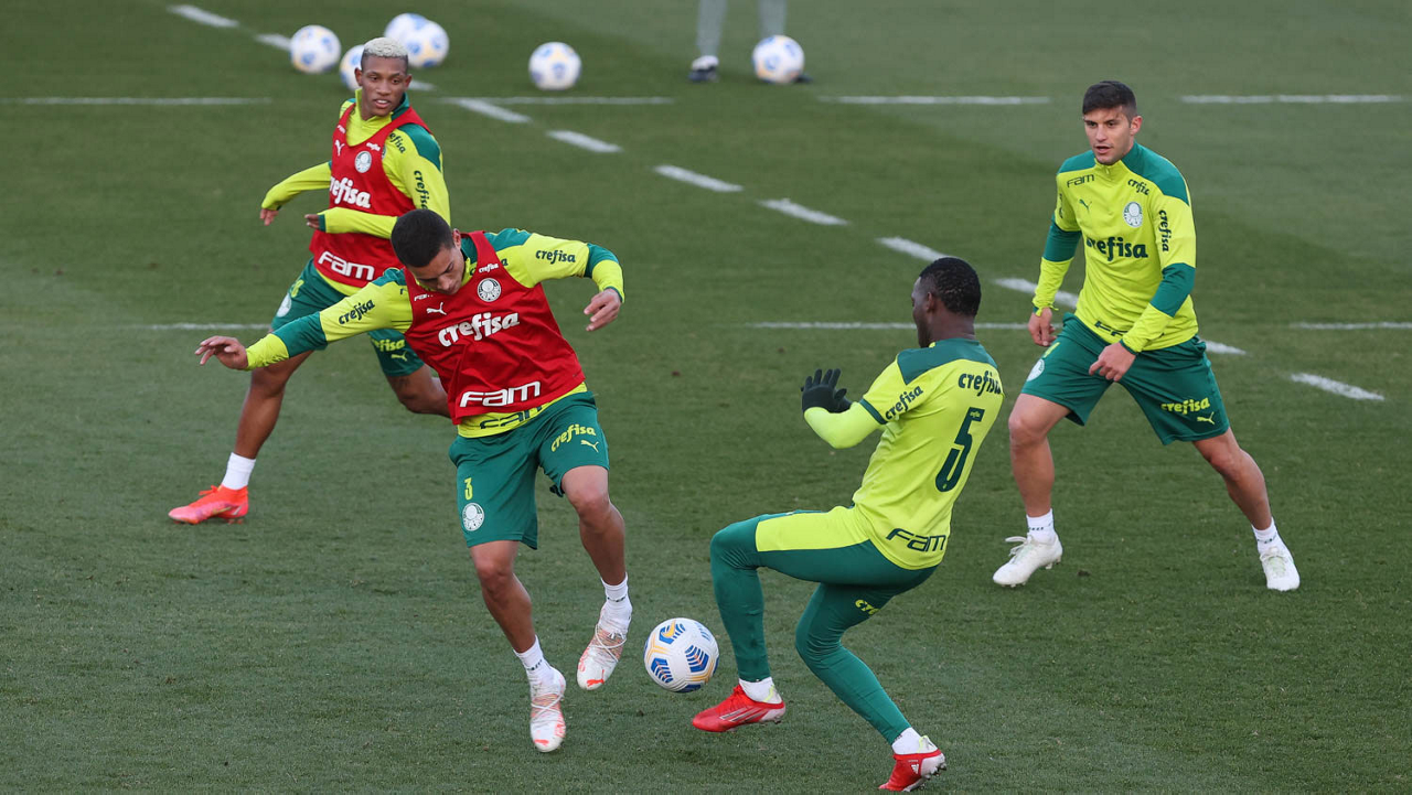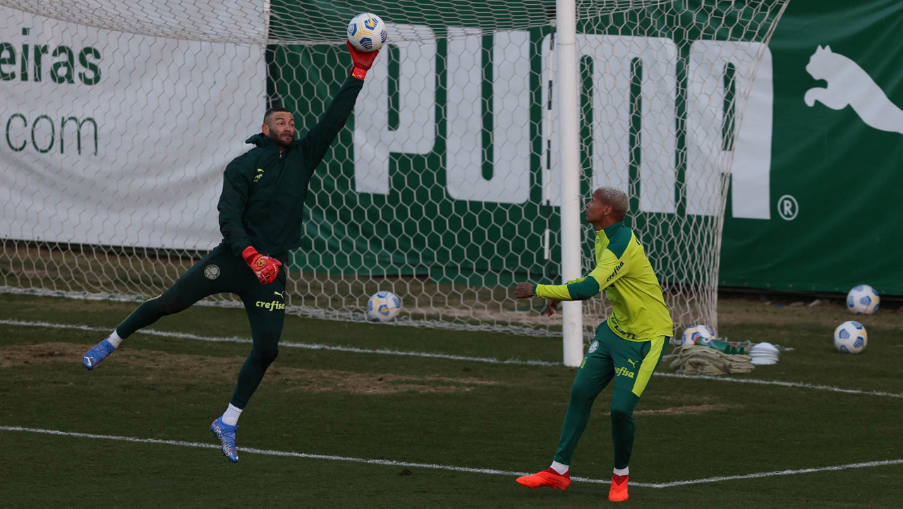 O goleiro Bruno (E) e os jogadores Marcos Rocha, Victor Luis, Felipe Melo, Benjamín Kuscevic, Breno Lopes, Deyverson, Mathesu Fernades e Dudu (E/D em pé) e Gabriel Veron, Patrick de Paula e Gustavo Scarpa (E/D agachados), da SE Palmeiras, durante treinamento, na Academia de Futebol. (Foto: Cesar Greco)