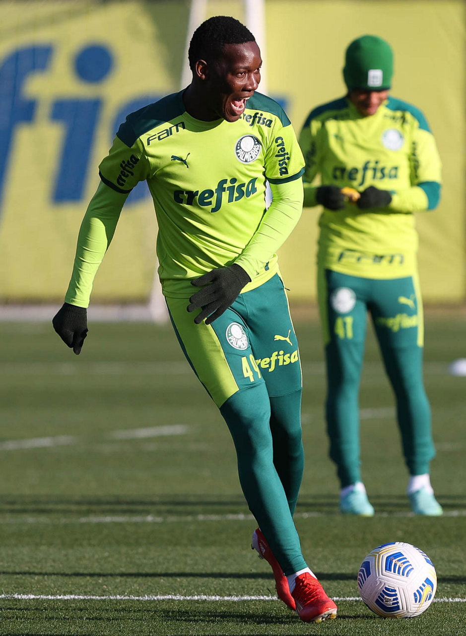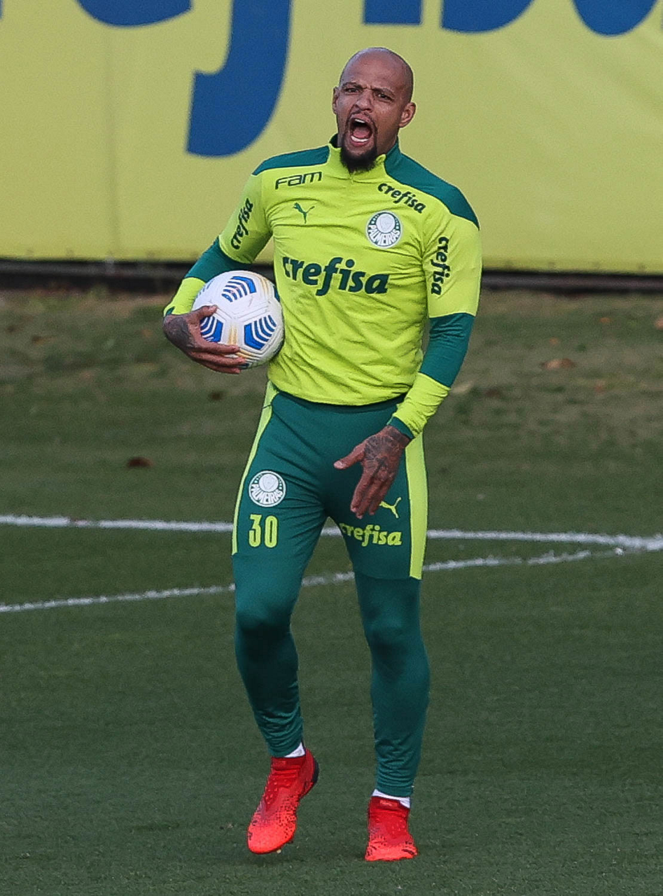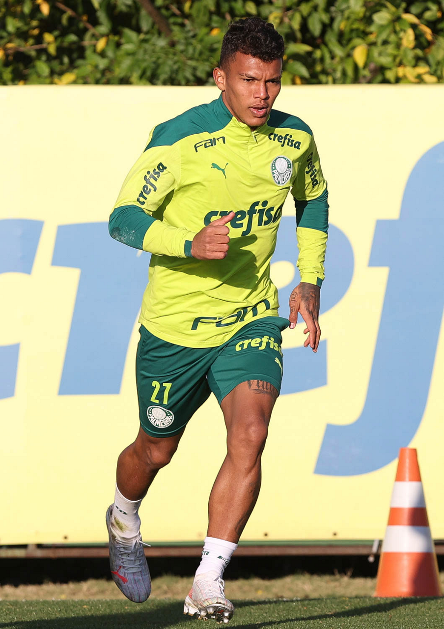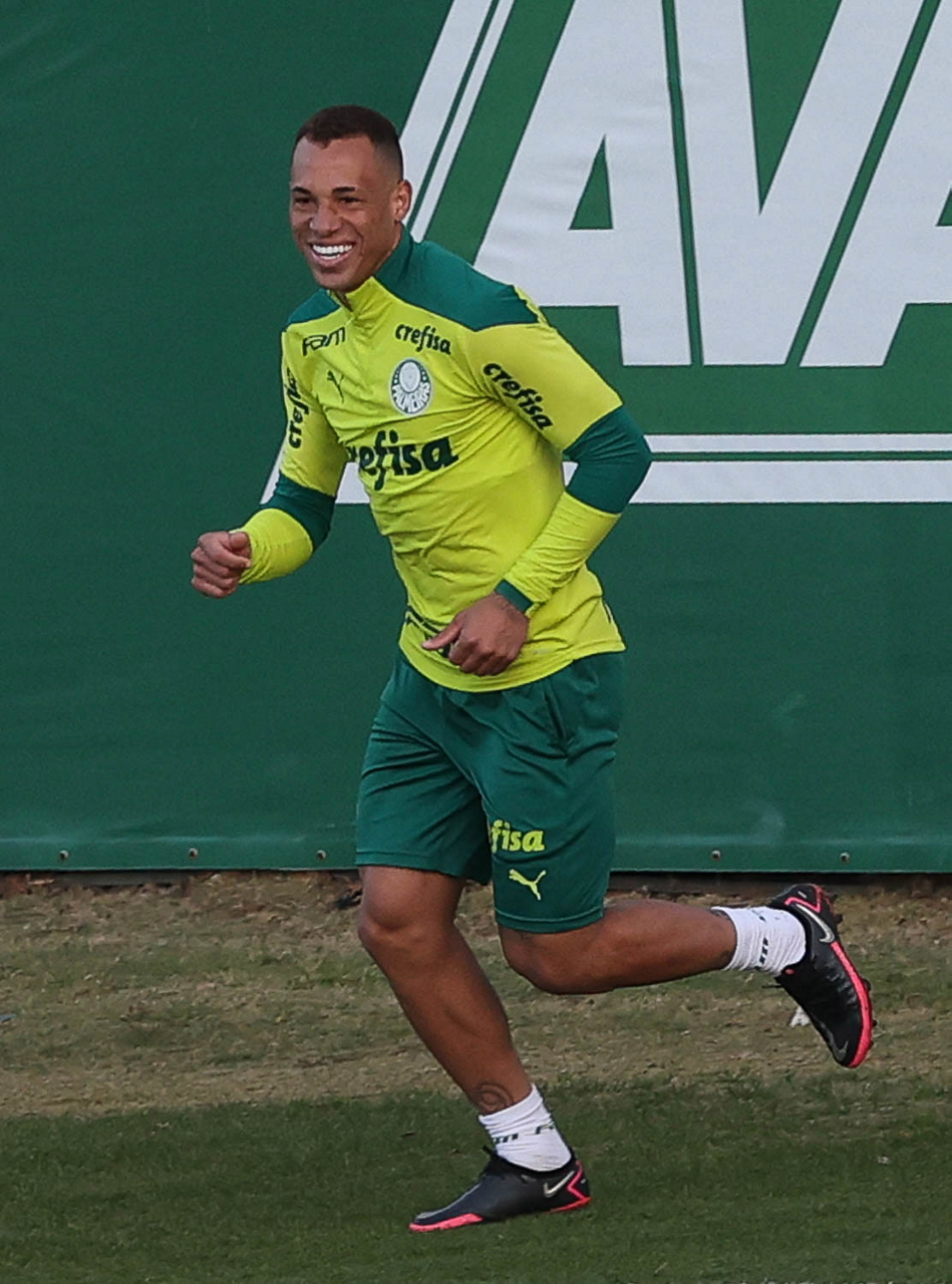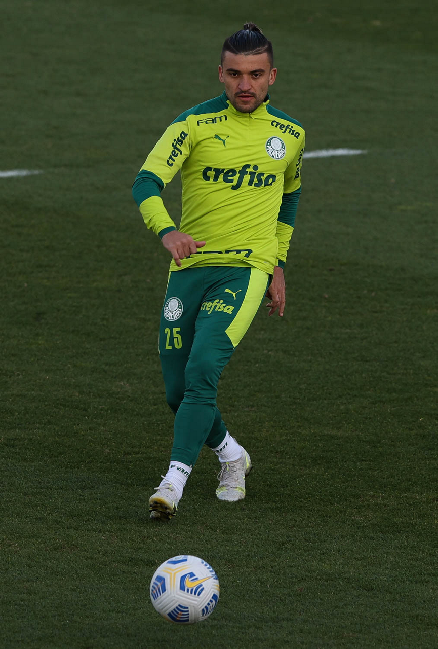 O goleiro Bruno (E) e os jogadores Marcos Rocha, Victor Luis, Felipe Melo, Benjamín Kuscevic, Breno Lopes, Deyverson, Mathesu Fernades e Dudu (E/D em pé) e Gabriel Veron, Patrick de Paula e Gustavo Scarpa (E/D agachados), da SE Palmeiras, durante treinamento, na Academia de Futebol. (Foto: Cesar Greco)