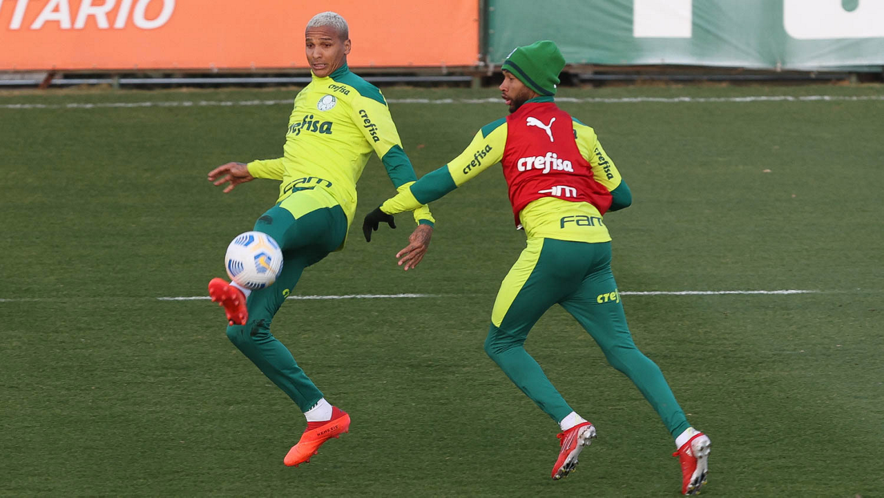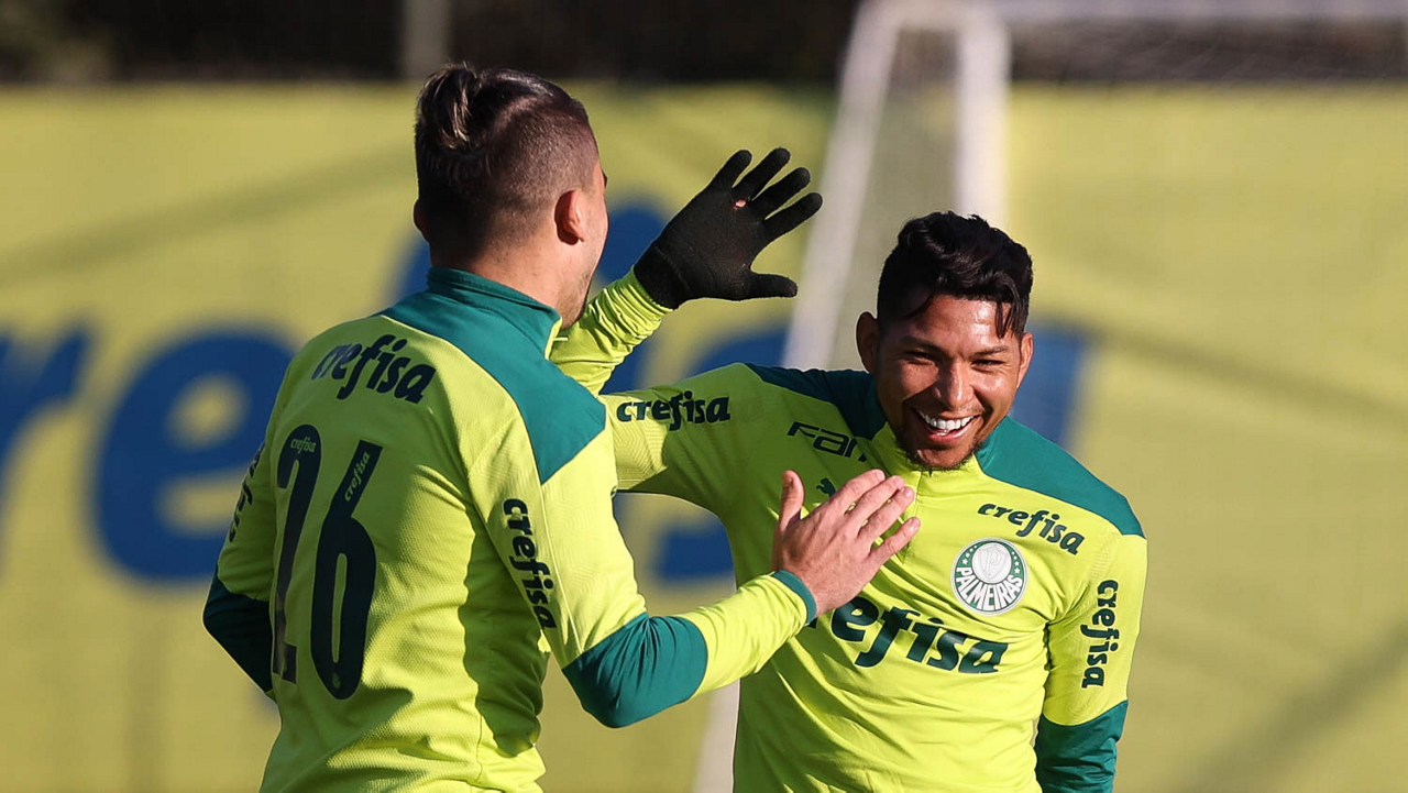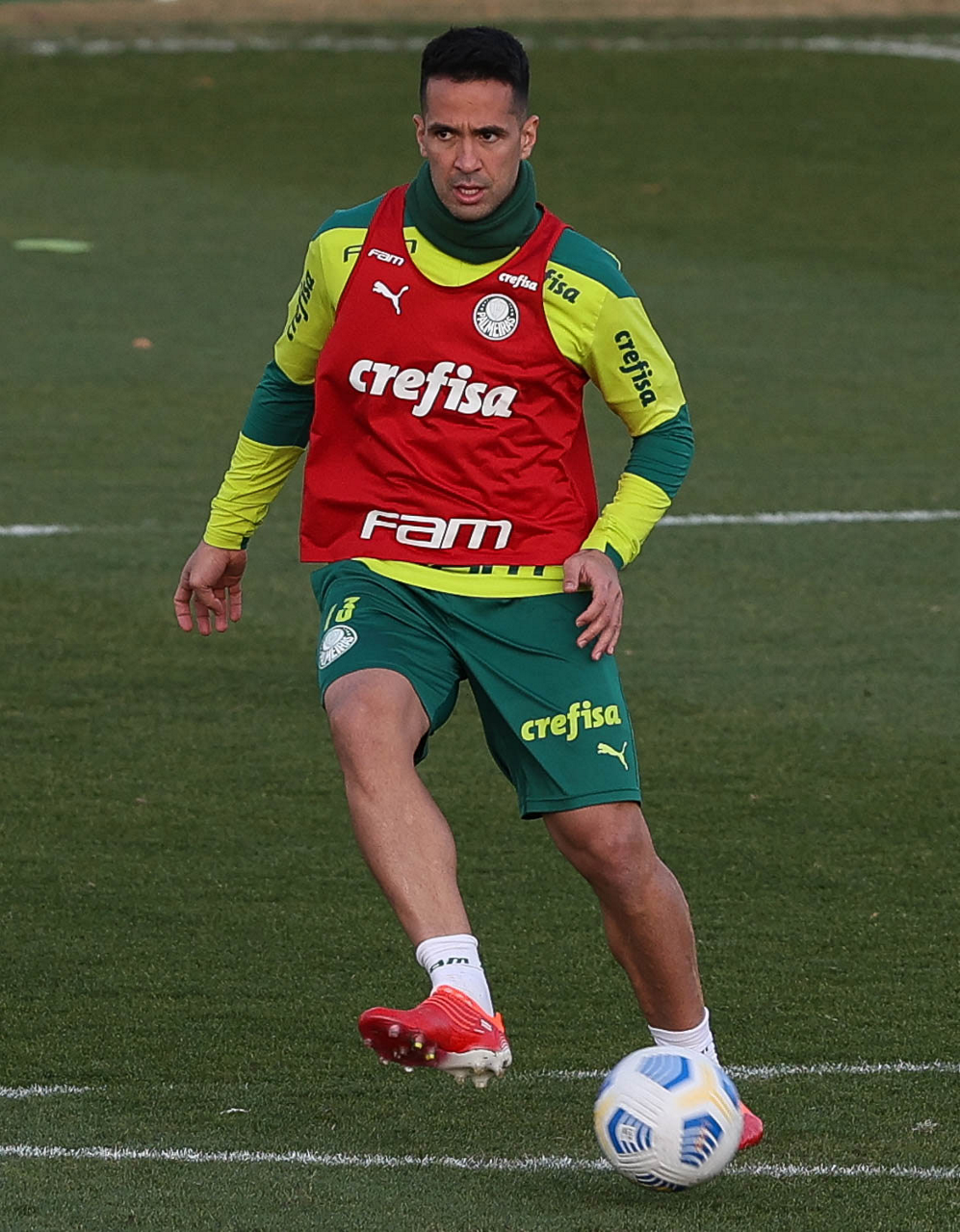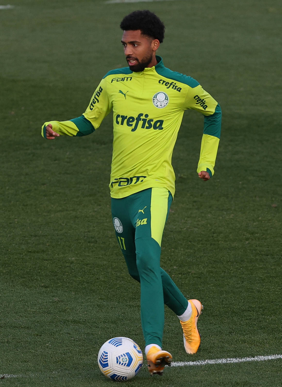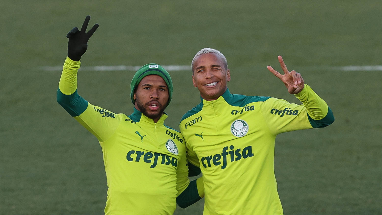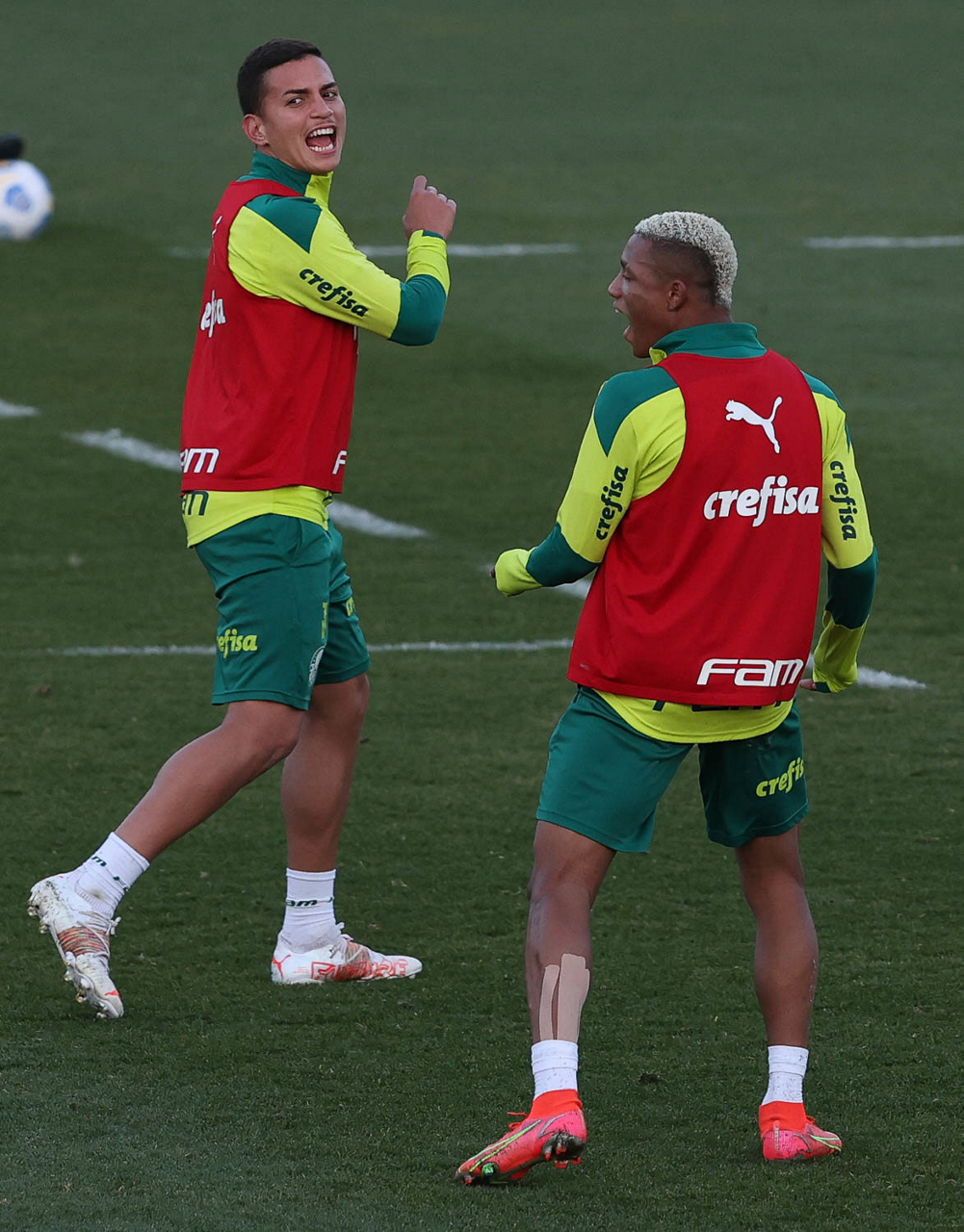 O goleiro Bruno (E) e os jogadores Marcos Rocha, Victor Luis, Felipe Melo, Benjamín Kuscevic, Breno Lopes, Deyverson, Mathesu Fernades e Dudu (E/D em pé) e Gabriel Veron, Patrick de Paula e Gustavo Scarpa (E/D agachados), da SE Palmeiras, durante treinamento, na Academia de Futebol. (Foto: Cesar Greco)