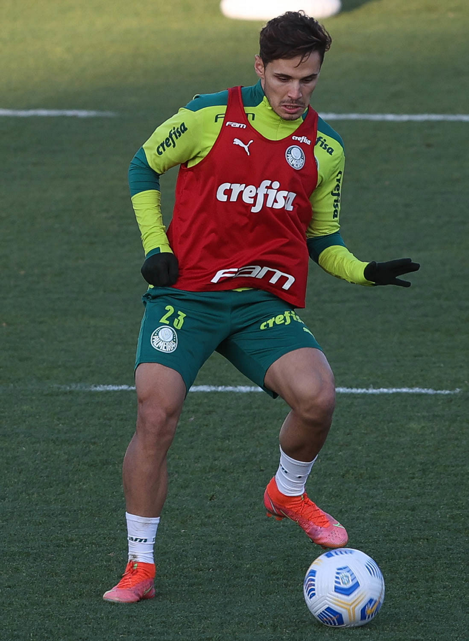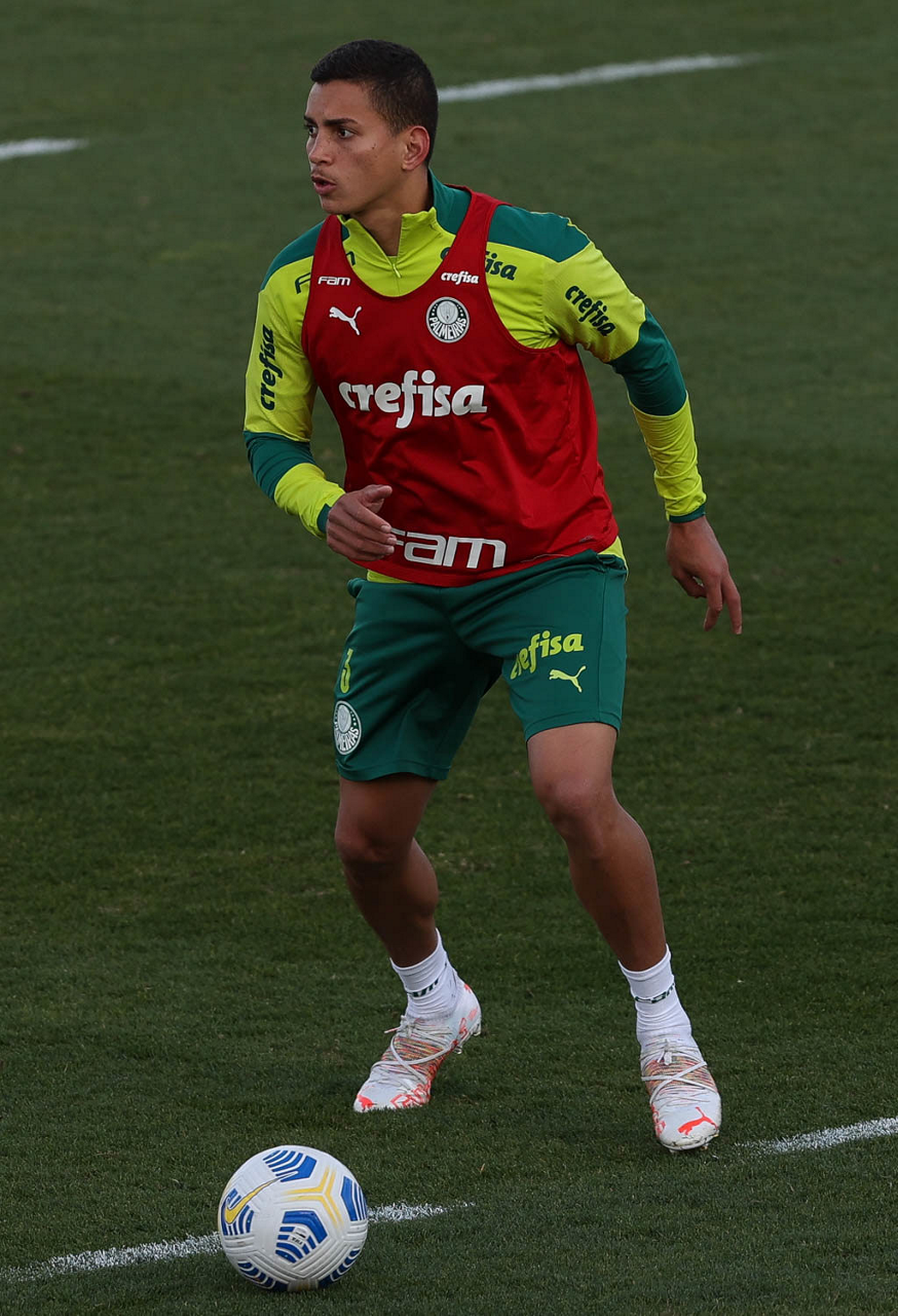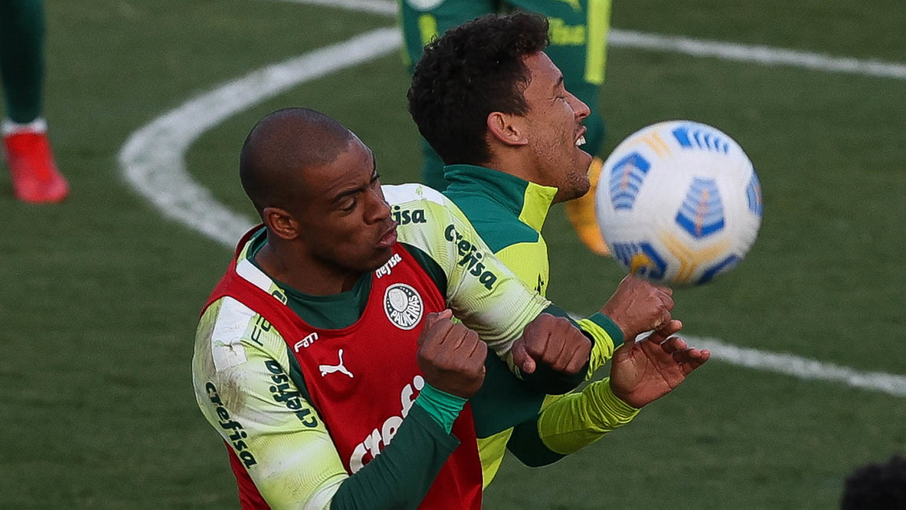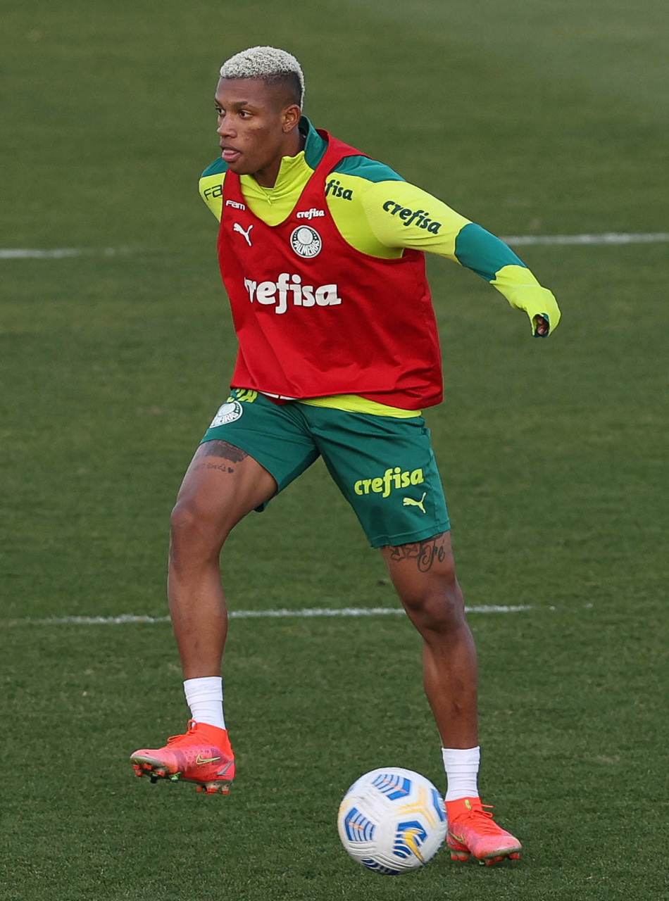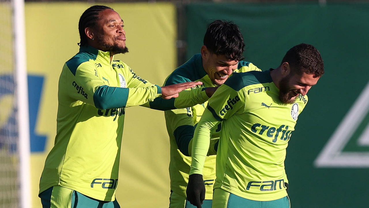 O goleiro Bruno (E) e os jogadores Marcos Rocha, Victor Luis, Felipe Melo, Benjamín Kuscevic, Breno Lopes, Deyverson, Mathesu Fernades e Dudu (E/D em pé) e Gabriel Veron, Patrick de Paula e Gustavo Scarpa (E/D agachados), da SE Palmeiras, durante treinamento, na Academia de Futebol. (Foto: Cesar Greco)