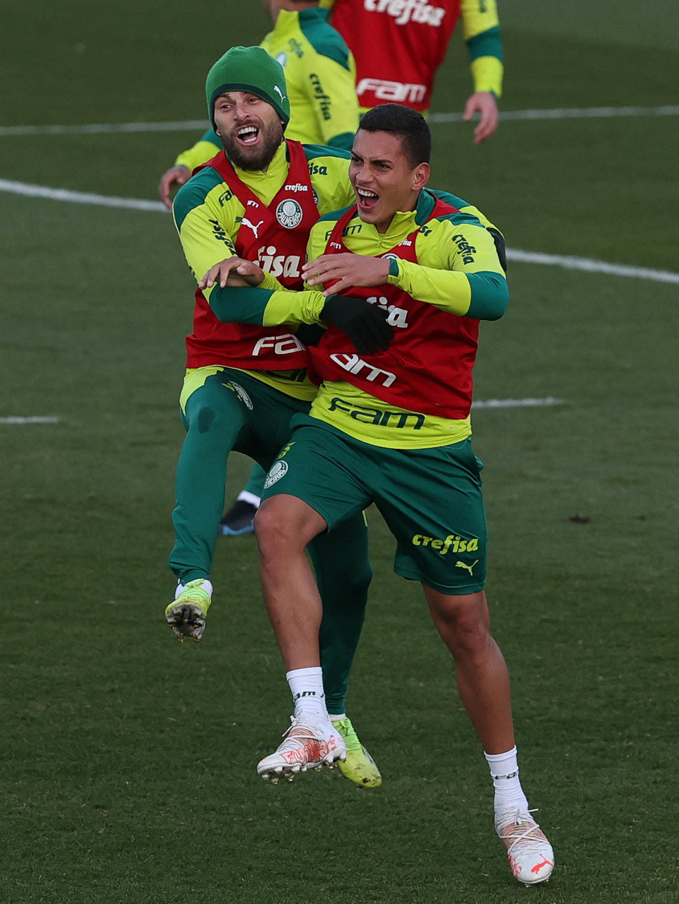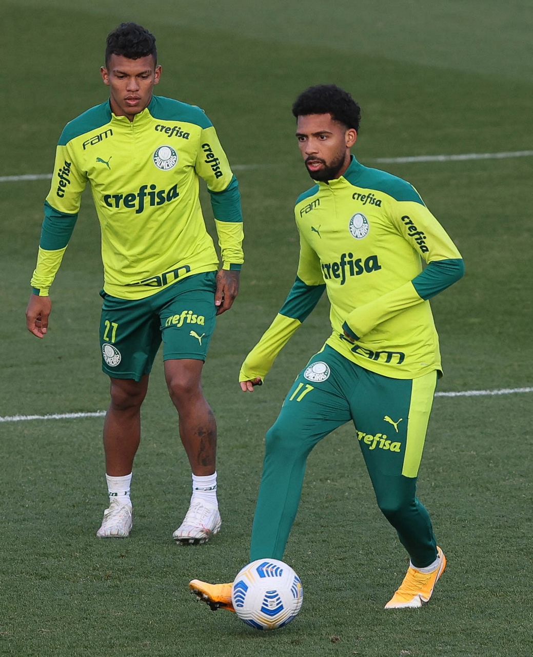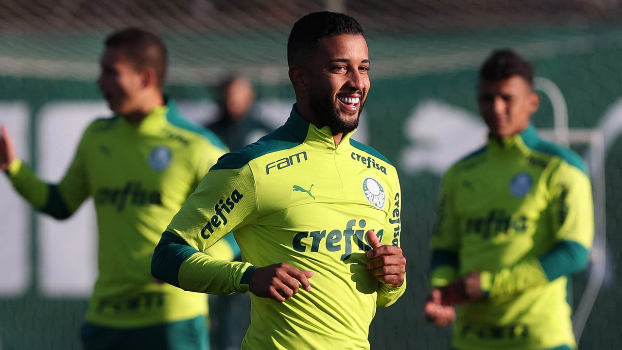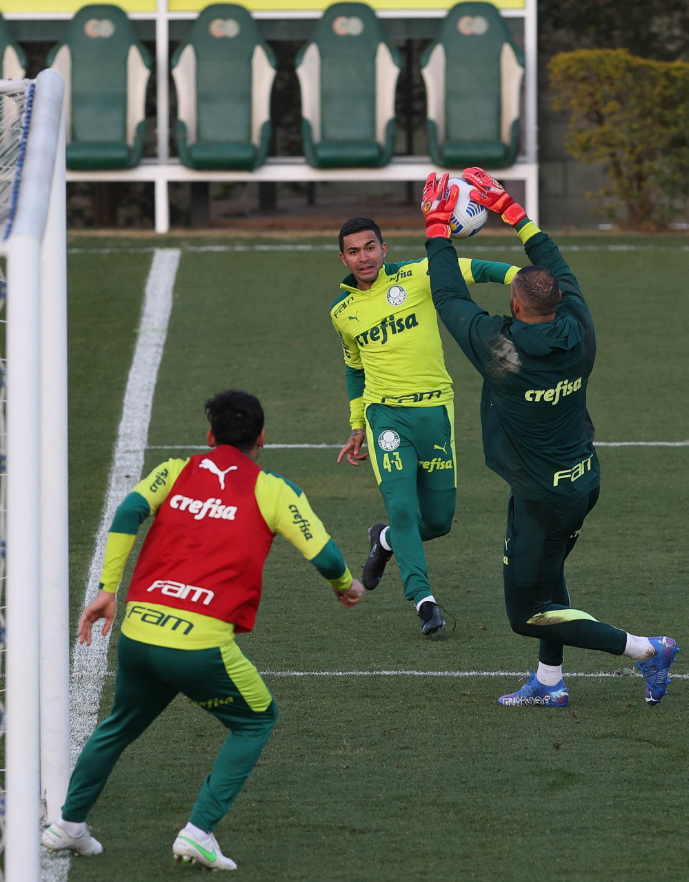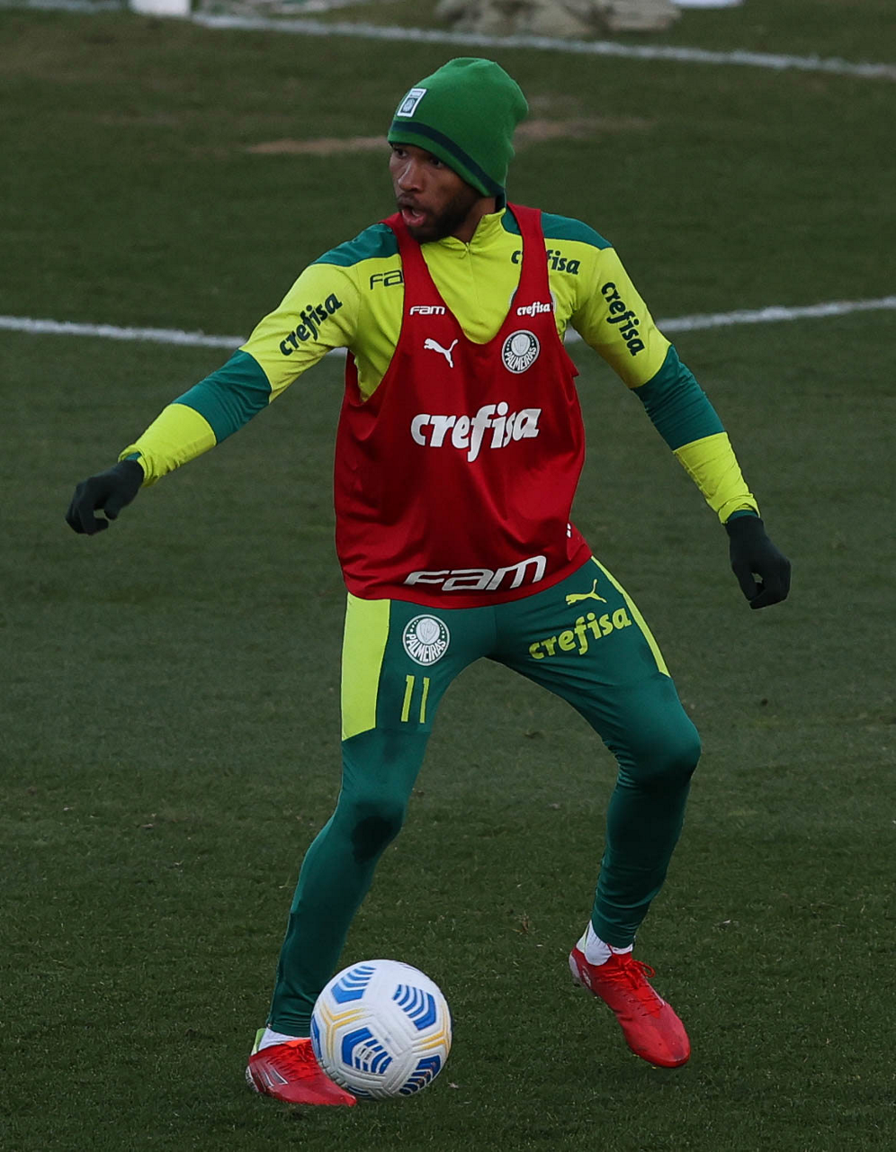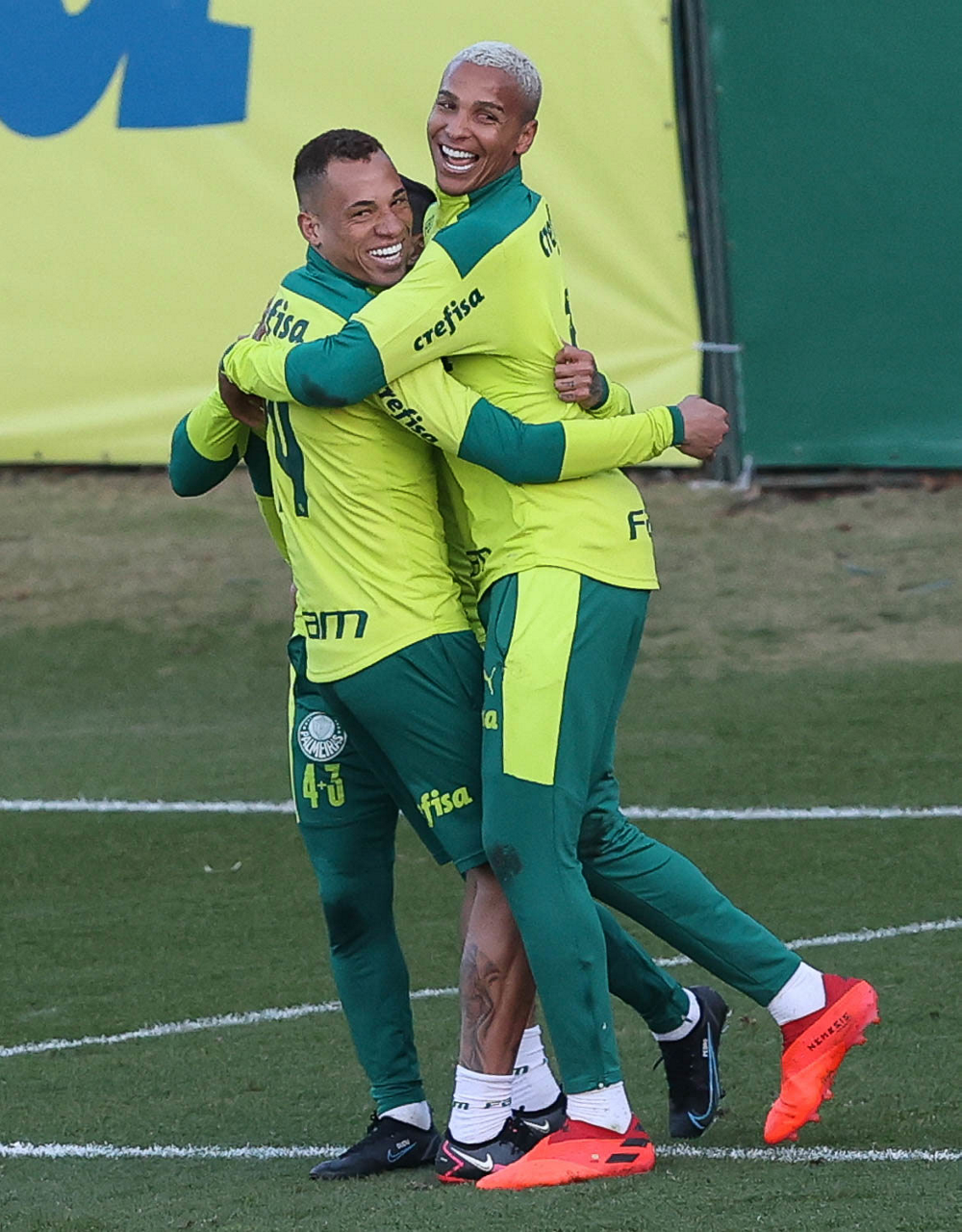 O goleiro Bruno (E) e os jogadores Marcos Rocha, Victor Luis, Felipe Melo, Benjamín Kuscevic, Breno Lopes, Deyverson, Mathesu Fernades e Dudu (E/D em pé) e Gabriel Veron, Patrick de Paula e Gustavo Scarpa (E/D agachados), da SE Palmeiras, durante treinamento, na Academia de Futebol. (Foto: Cesar Greco)