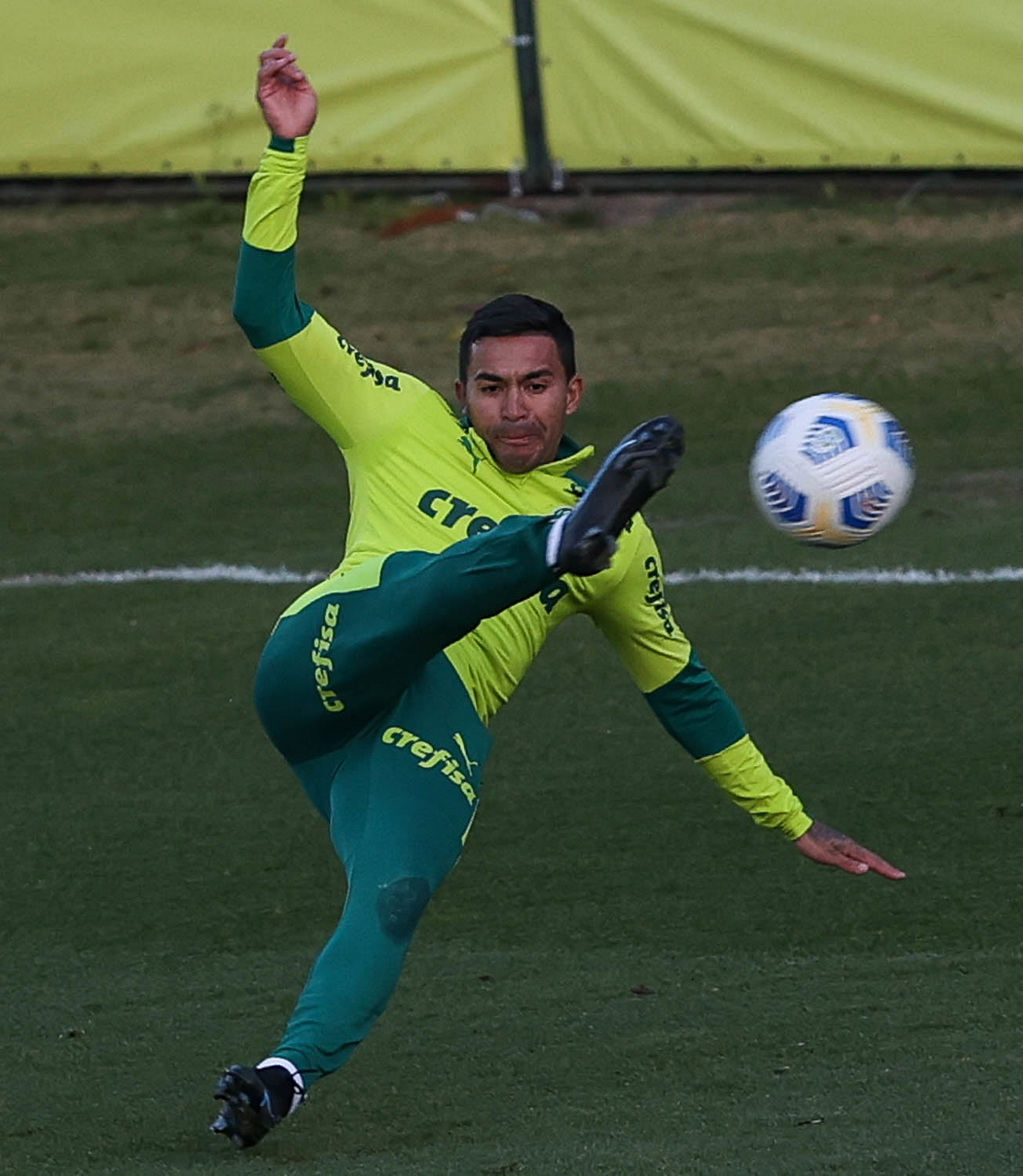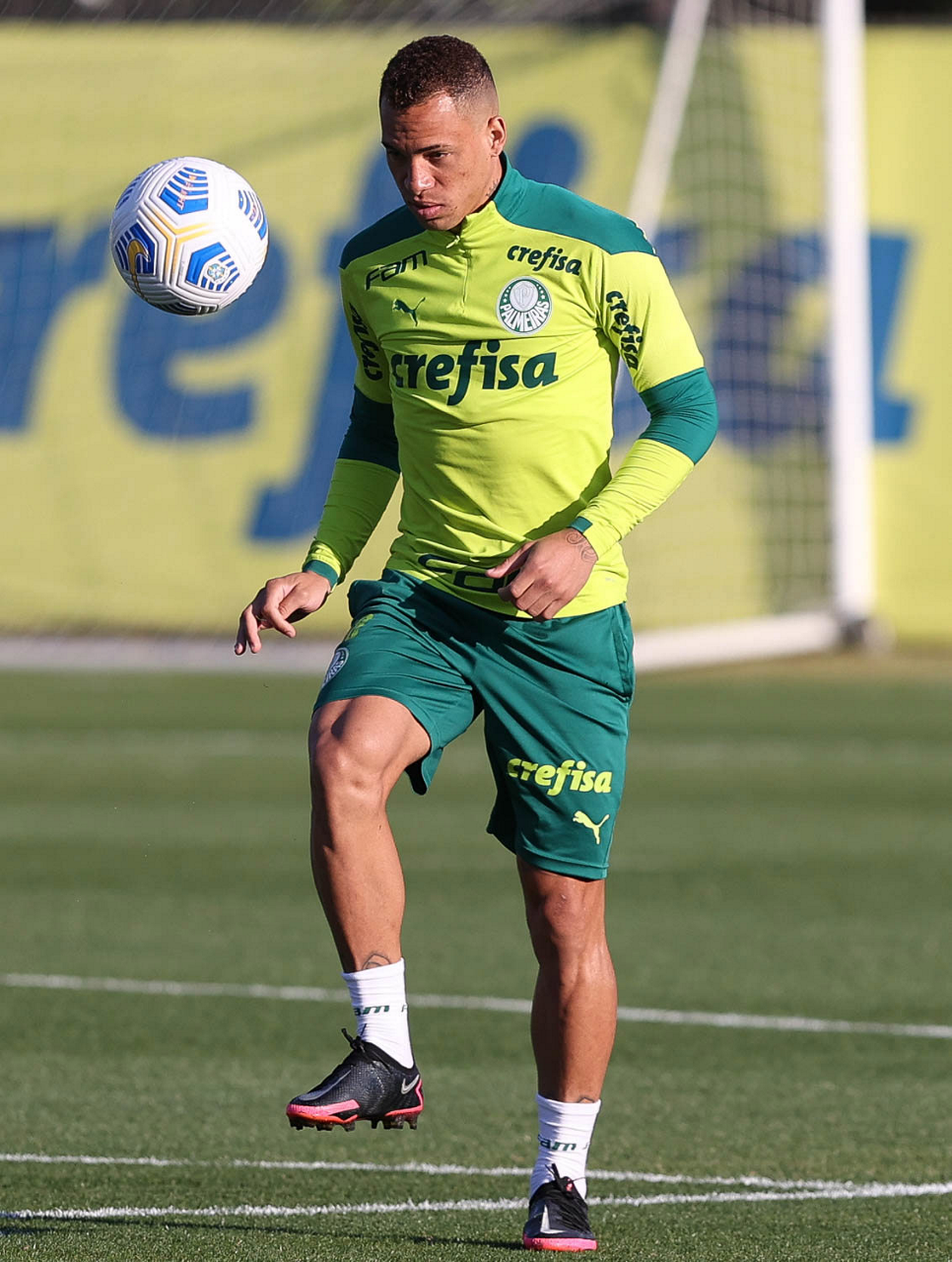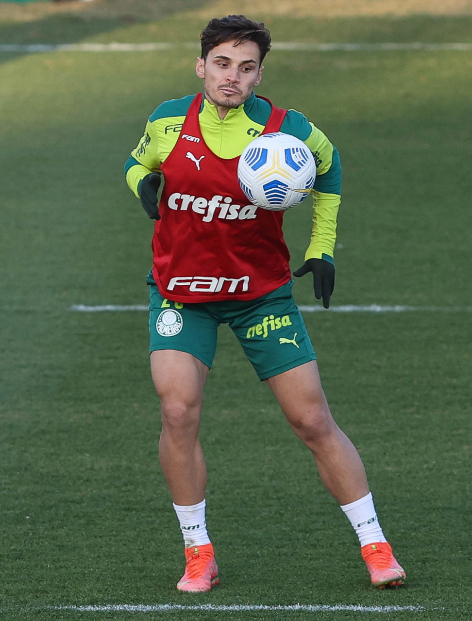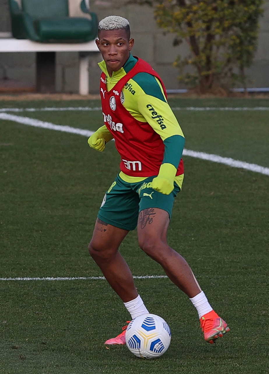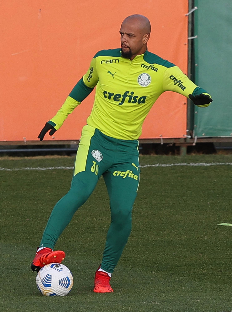 O goleiro Bruno (E) e os jogadores Marcos Rocha, Victor Luis, Felipe Melo, Benjamín Kuscevic, Breno Lopes, Deyverson, Mathesu Fernades e Dudu (E/D em pé) e Gabriel Veron, Patrick de Paula e Gustavo Scarpa (E/D agachados), da SE Palmeiras, durante treinamento, na Academia de Futebol. (Foto: Cesar Greco)