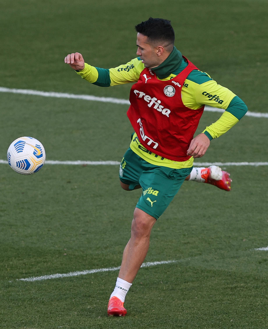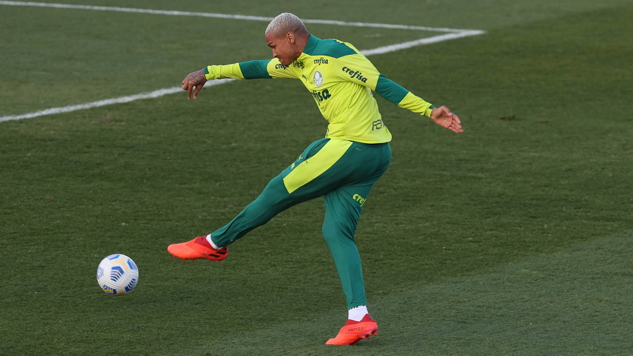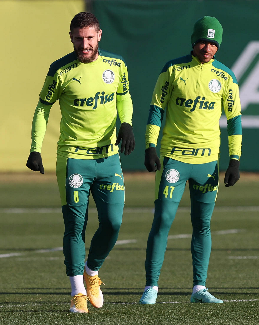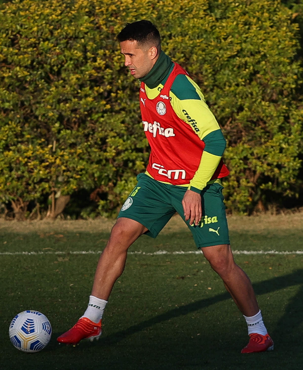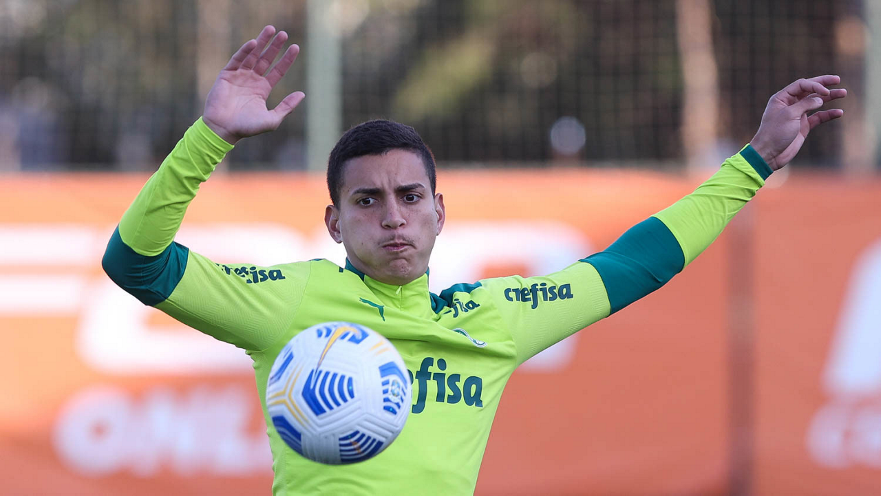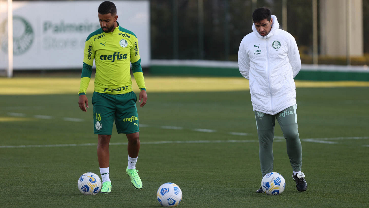 O goleiro Bruno (E) e os jogadores Marcos Rocha, Victor Luis, Felipe Melo, Benjamín Kuscevic, Breno Lopes, Deyverson, Mathesu Fernades e Dudu (E/D em pé) e Gabriel Veron, Patrick de Paula e Gustavo Scarpa (E/D agachados), da SE Palmeiras, durante treinamento, na Academia de Futebol. (Foto: Cesar Greco)