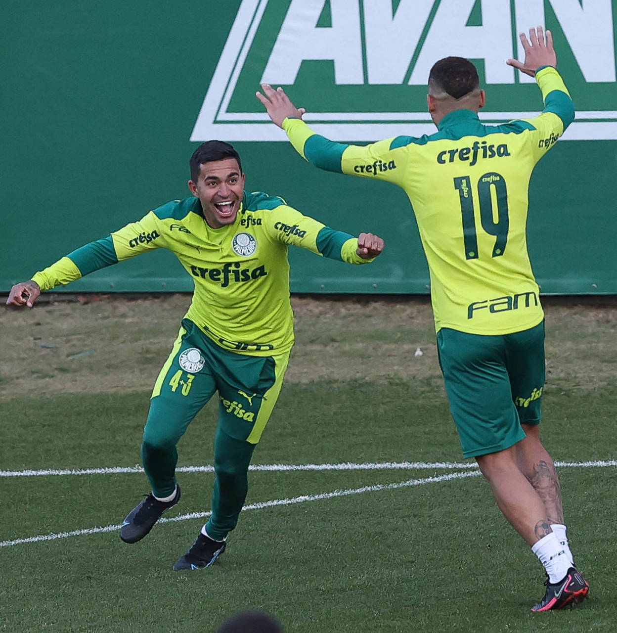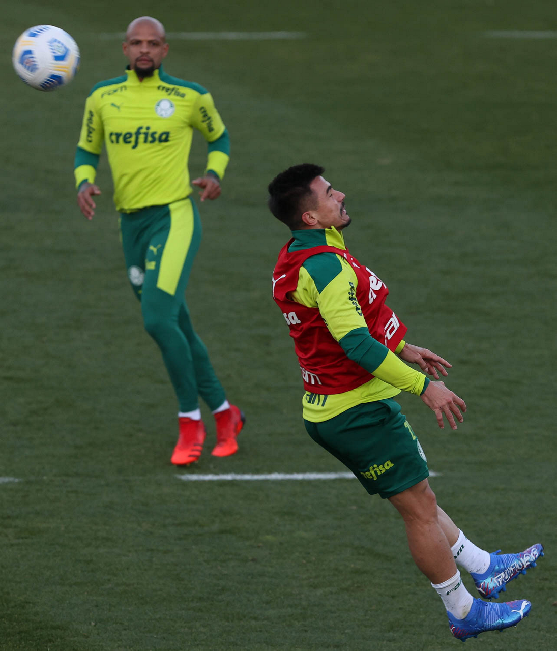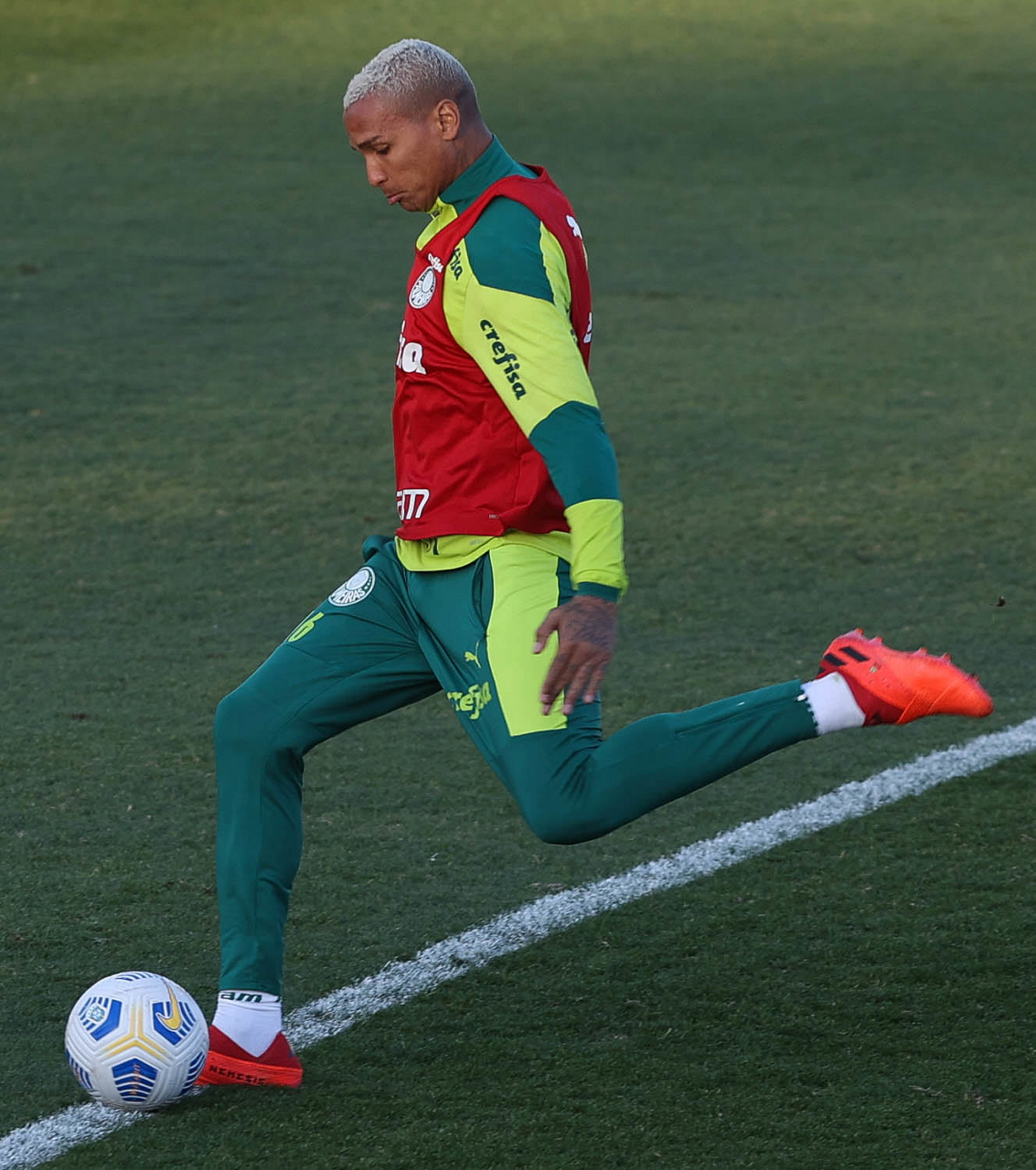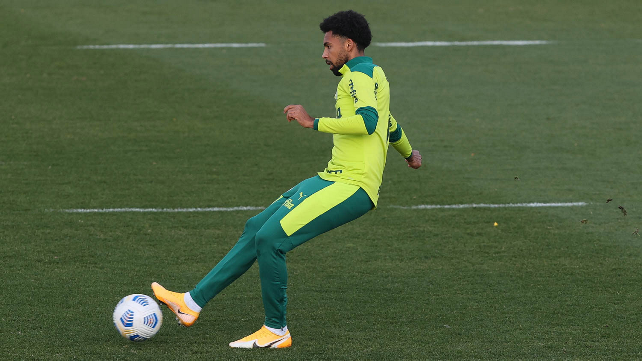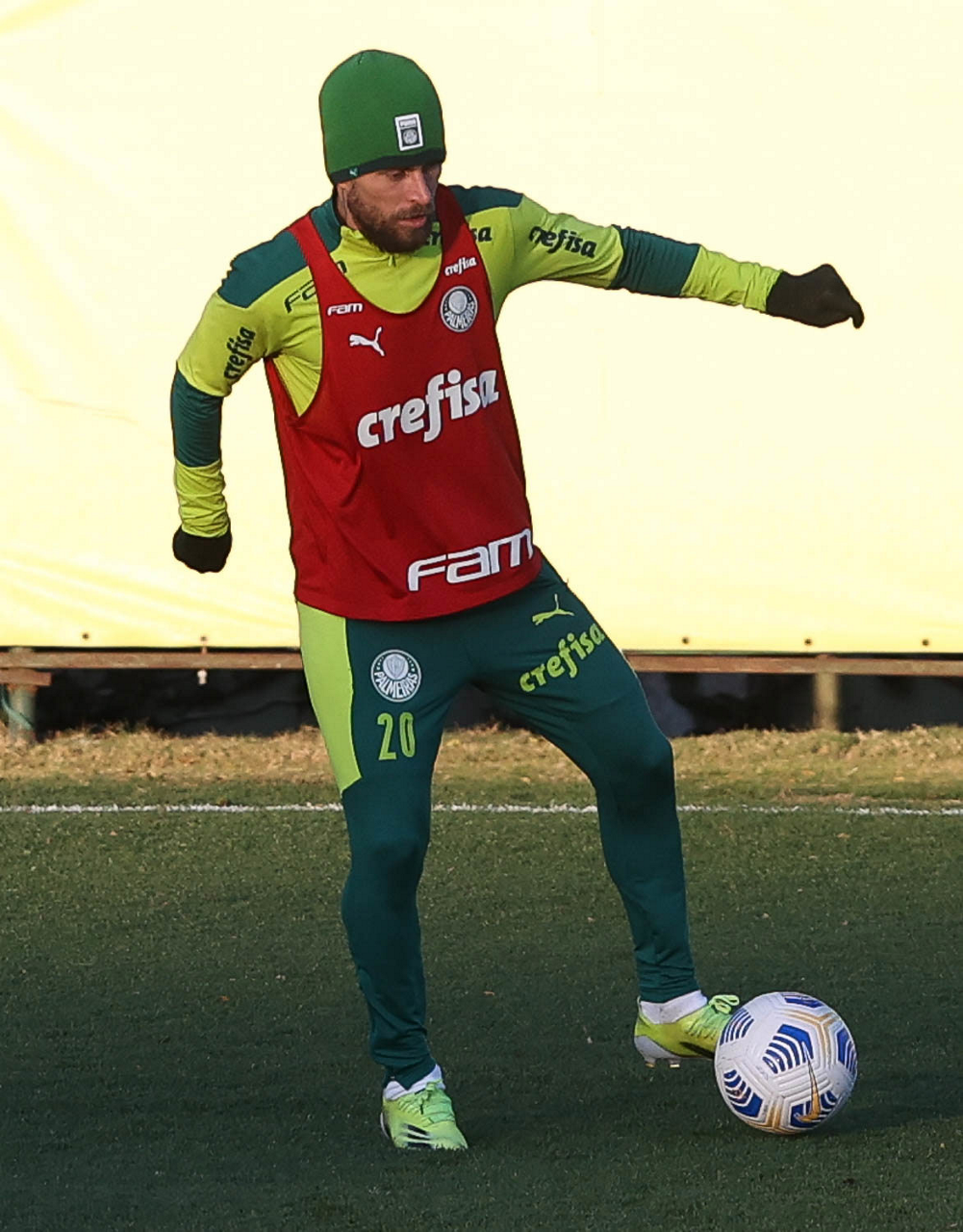 O goleiro Bruno (E) e os jogadores Marcos Rocha, Victor Luis, Felipe Melo, Benjamín Kuscevic, Breno Lopes, Deyverson, Mathesu Fernades e Dudu (E/D em pé) e Gabriel Veron, Patrick de Paula e Gustavo Scarpa (E/D agachados), da SE Palmeiras, durante treinamento, na Academia de Futebol. (Foto: Cesar Greco)
