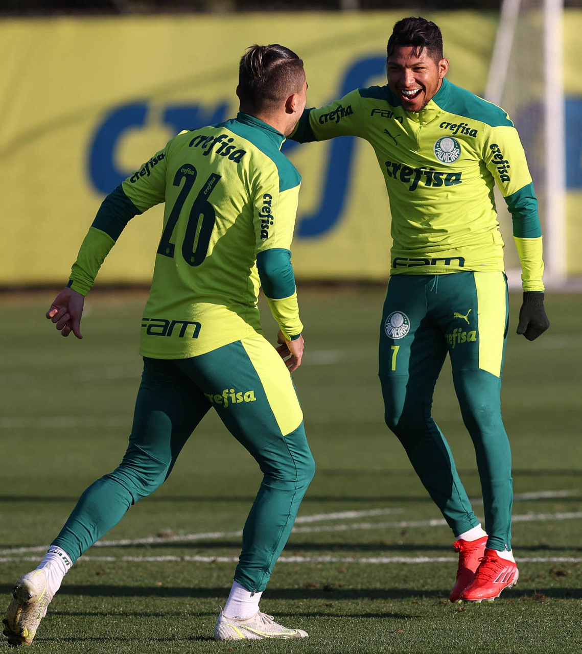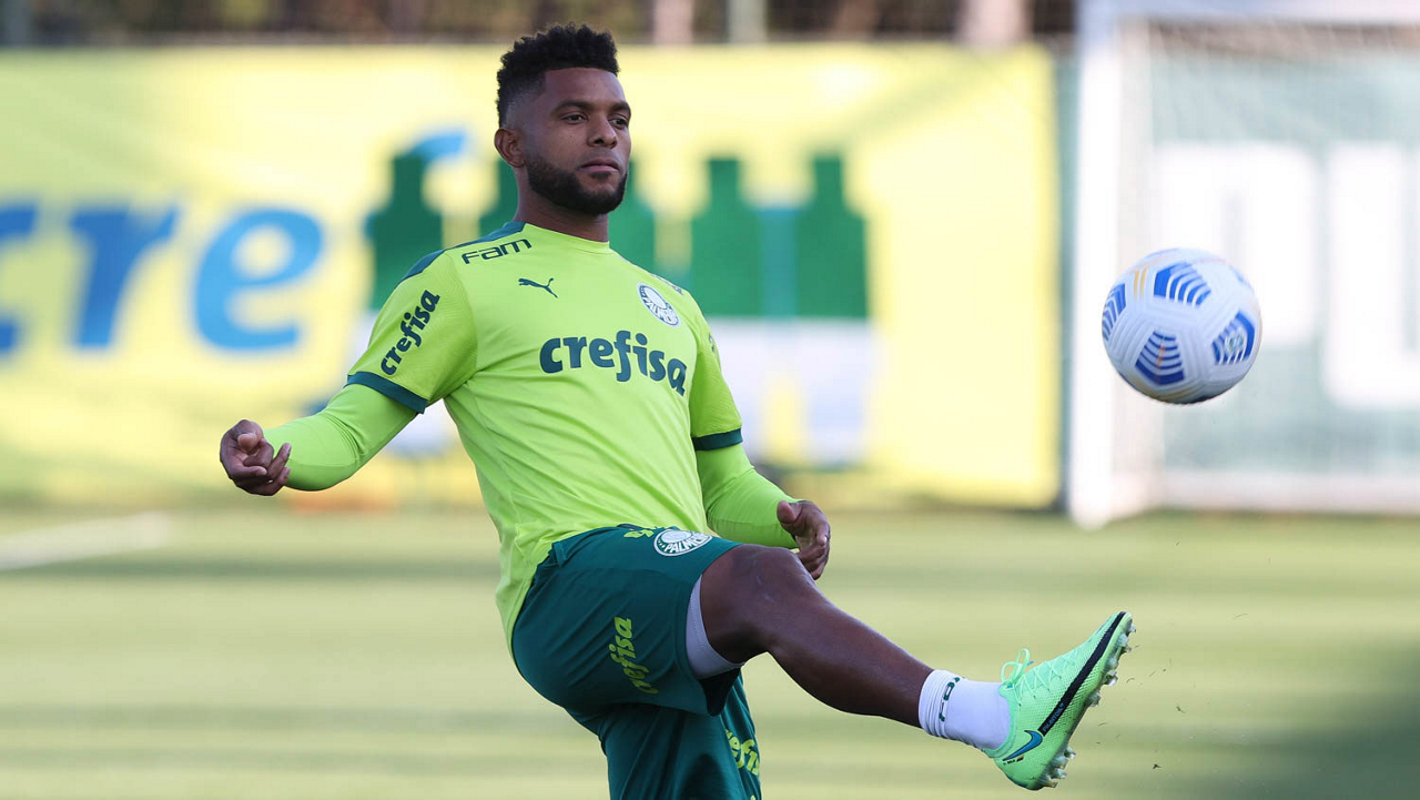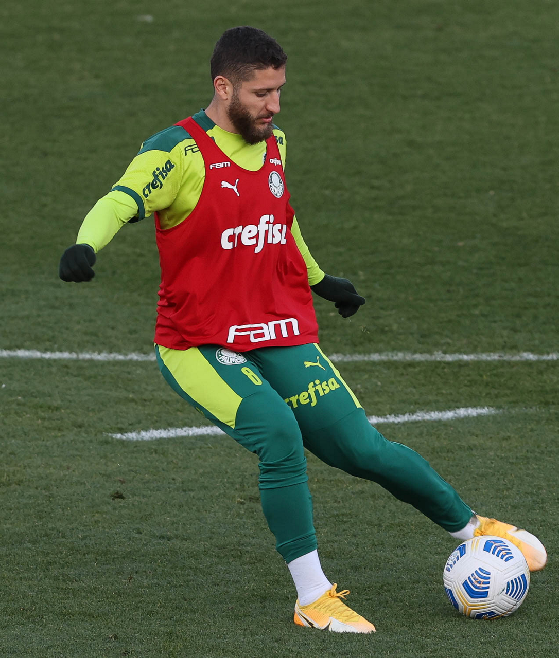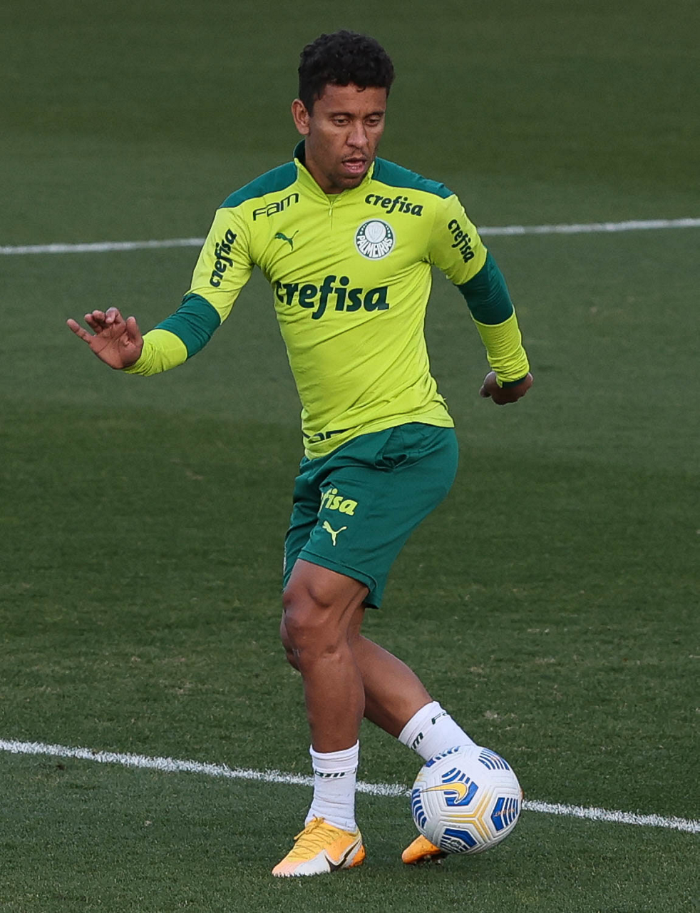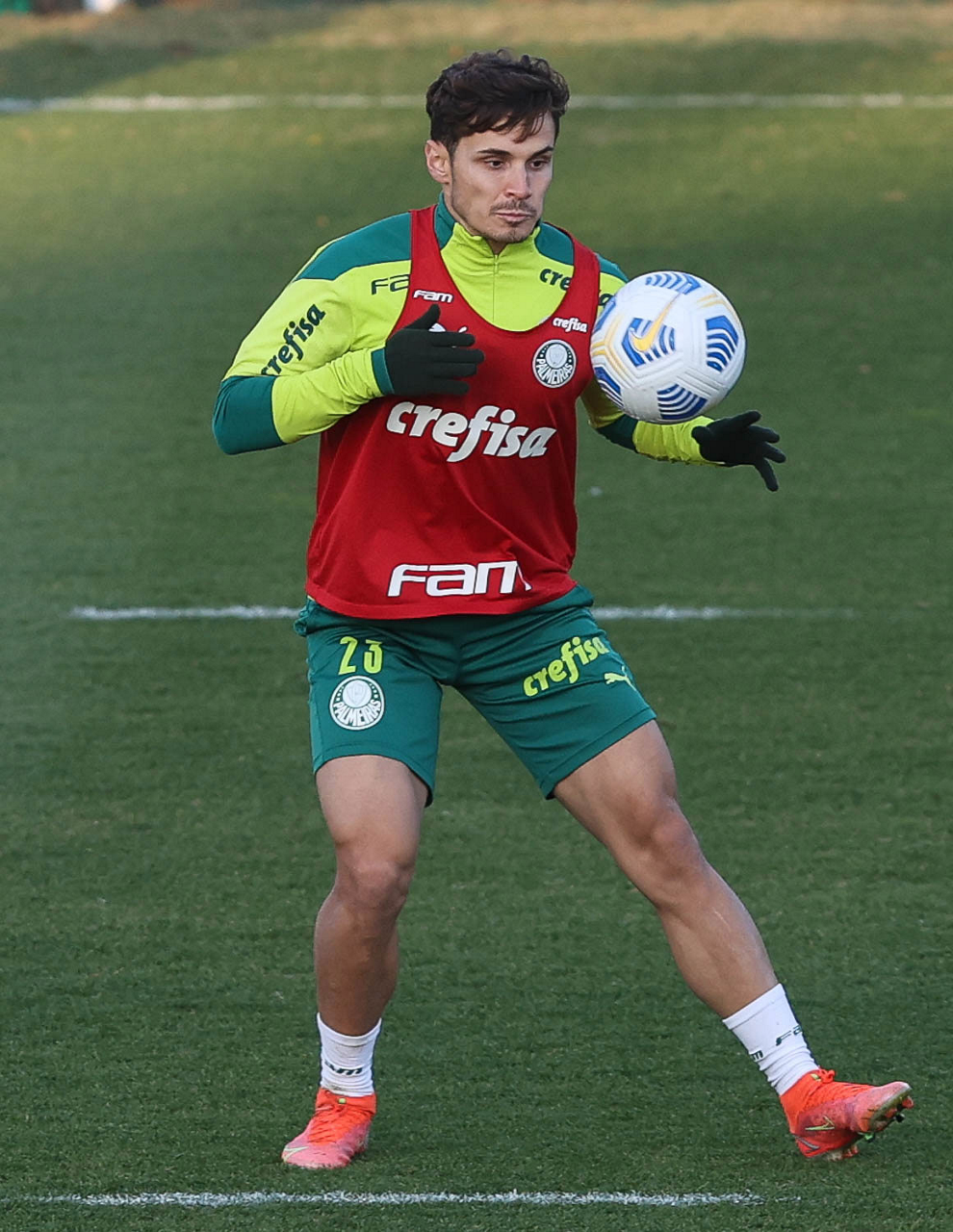 O goleiro Bruno (E) e os jogadores Marcos Rocha, Victor Luis, Felipe Melo, Benjamín Kuscevic, Breno Lopes, Deyverson, Mathesu Fernades e Dudu (E/D em pé) e Gabriel Veron, Patrick de Paula e Gustavo Scarpa (E/D agachados), da SE Palmeiras, durante treinamento, na Academia de Futebol. (Foto: Cesar Greco)