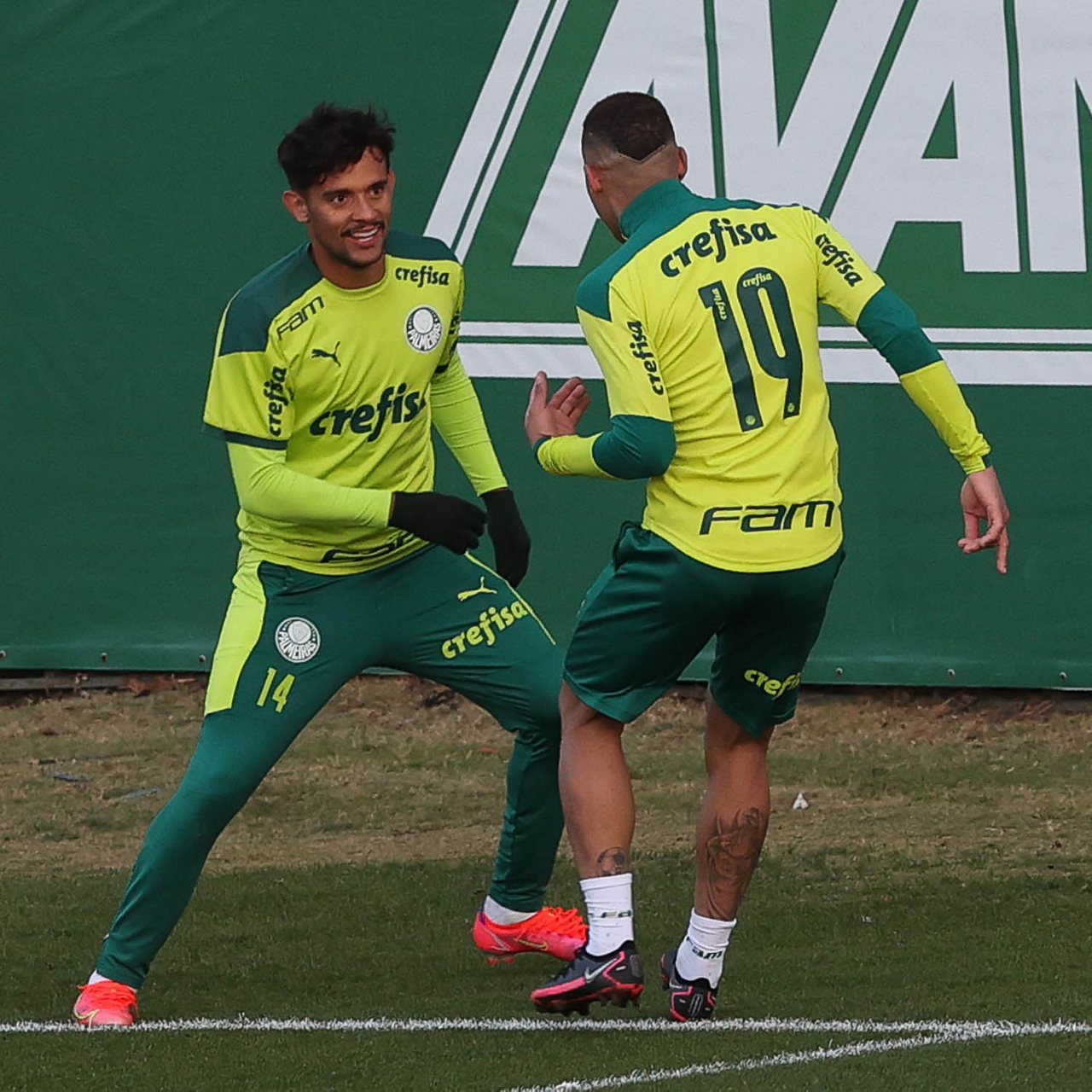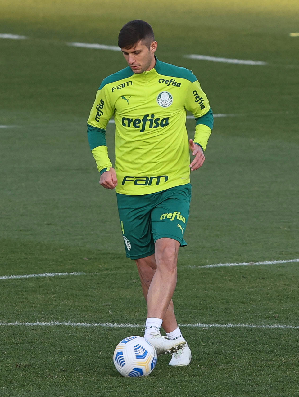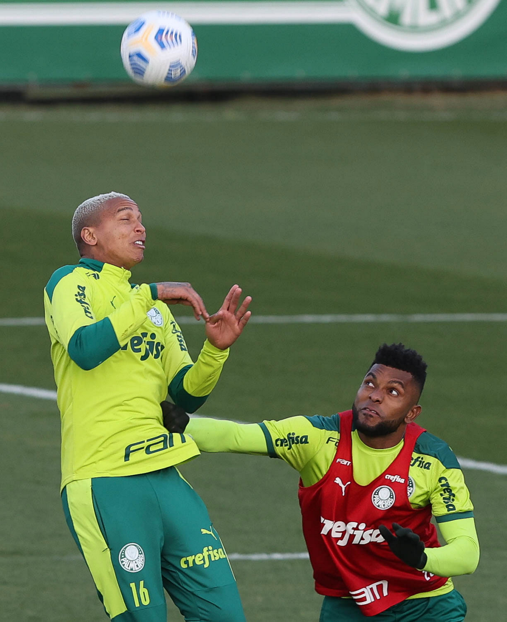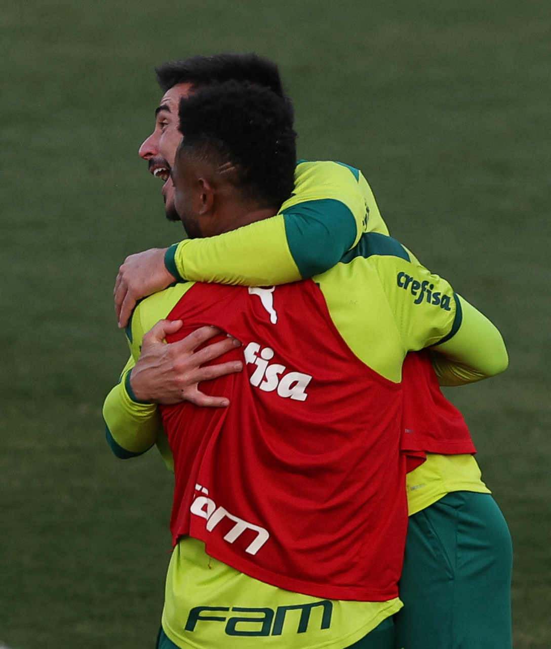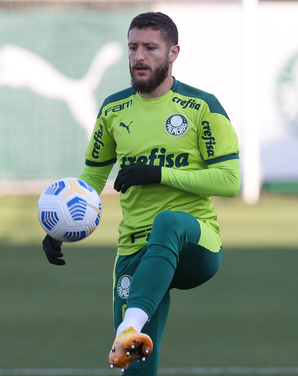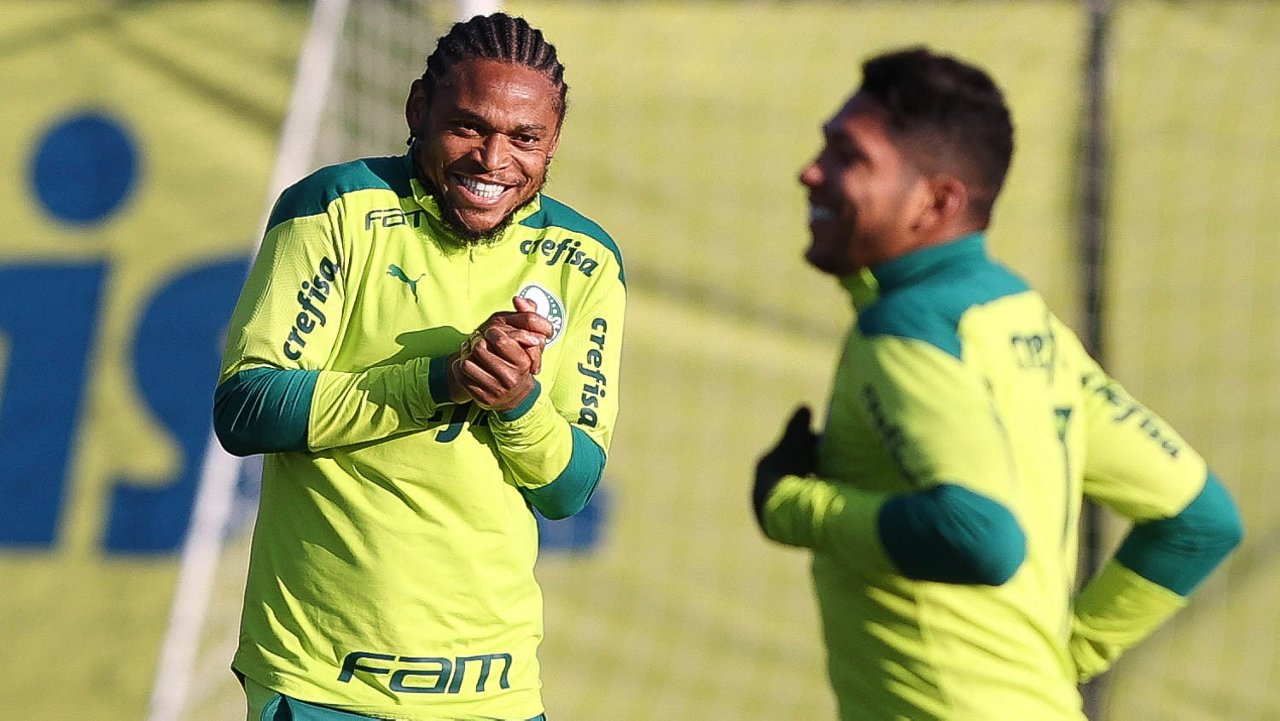 O goleiro Bruno (E) e os jogadores Marcos Rocha, Victor Luis, Felipe Melo, Benjamín Kuscevic, Breno Lopes, Deyverson, Mathesu Fernades e Dudu (E/D em pé) e Gabriel Veron, Patrick de Paula e Gustavo Scarpa (E/D agachados), da SE Palmeiras, durante treinamento, na Academia de Futebol. (Foto: Cesar Greco)