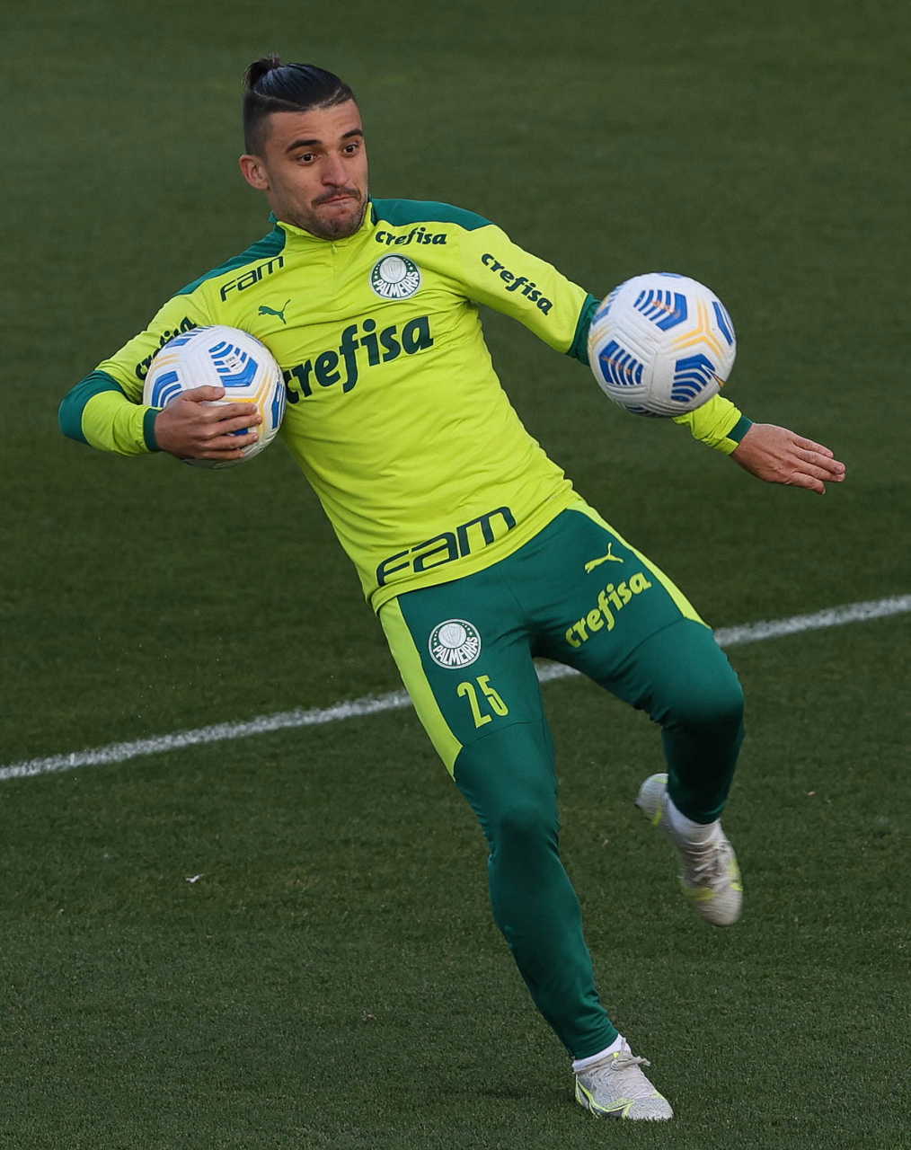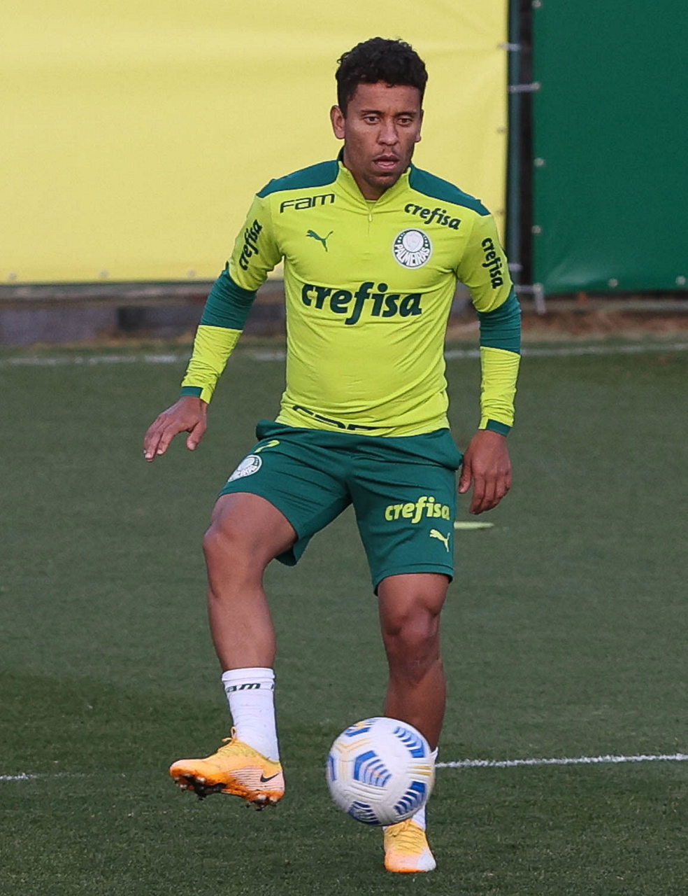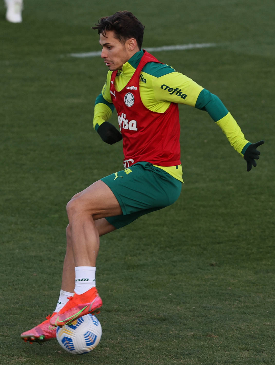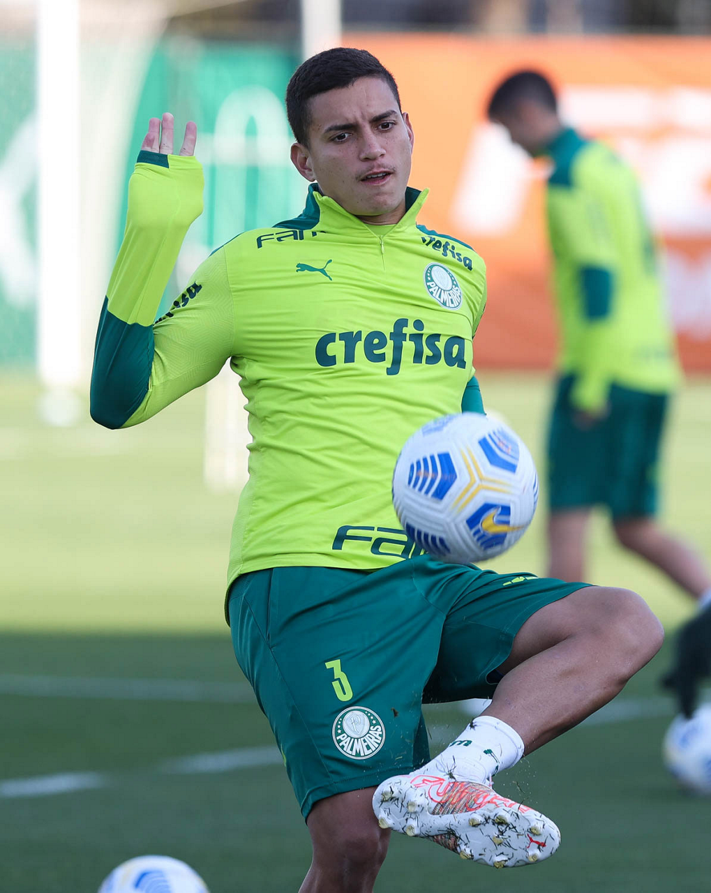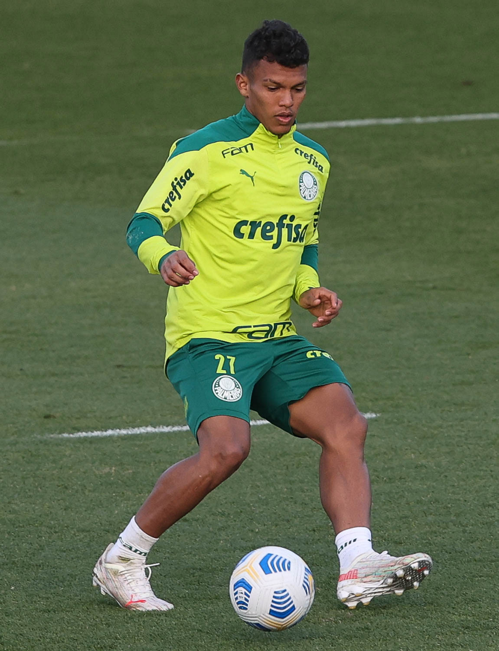 O goleiro Bruno (E) e os jogadores Marcos Rocha, Victor Luis, Felipe Melo, Benjamín Kuscevic, Breno Lopes, Deyverson, Mathesu Fernades e Dudu (E/D em pé) e Gabriel Veron, Patrick de Paula e Gustavo Scarpa (E/D agachados), da SE Palmeiras, durante treinamento, na Academia de Futebol. (Foto: Cesar Greco)