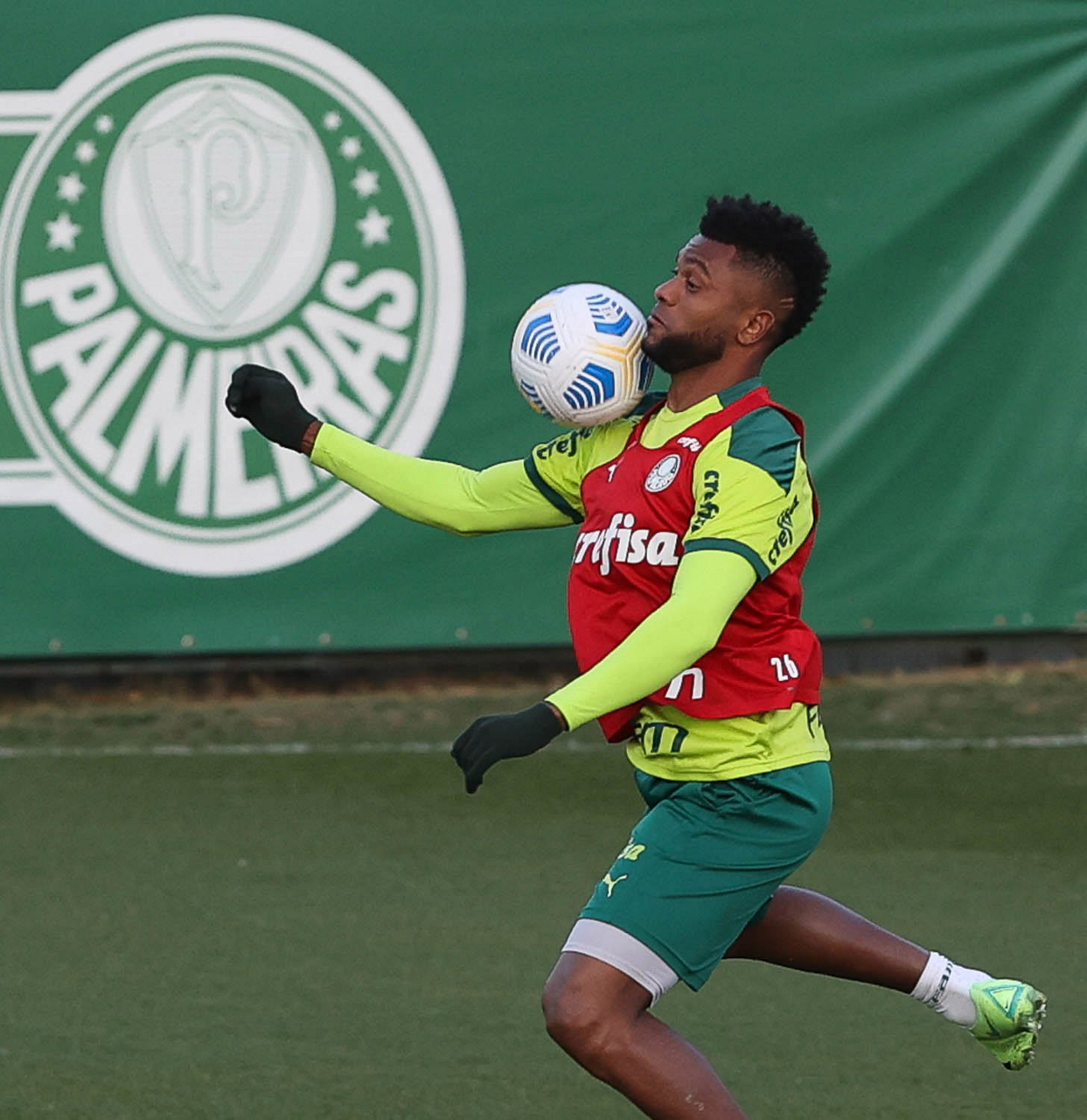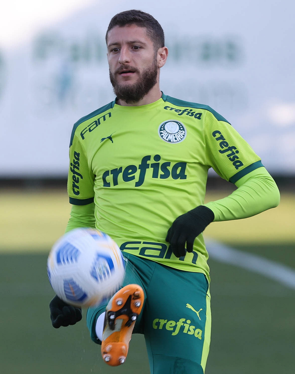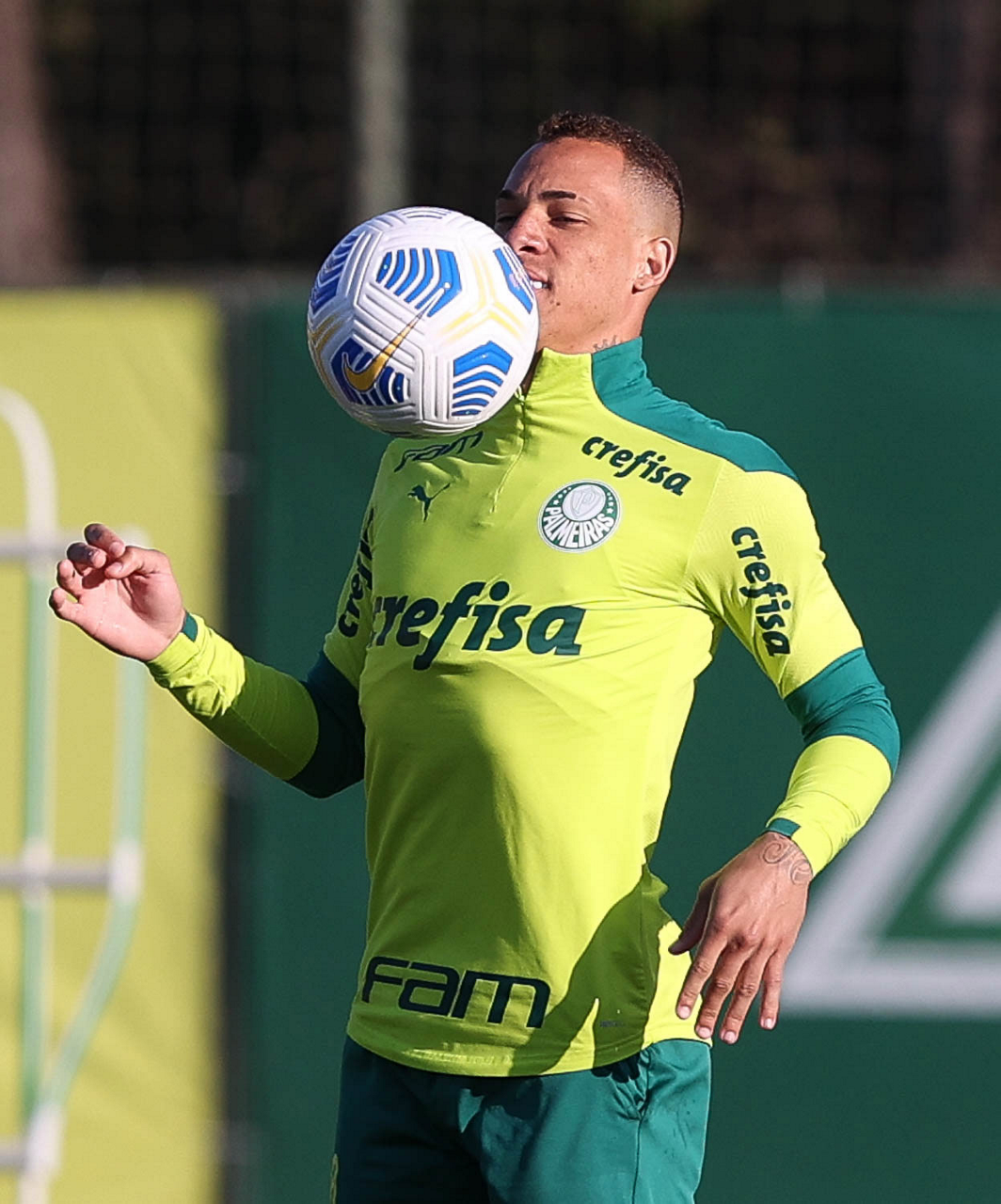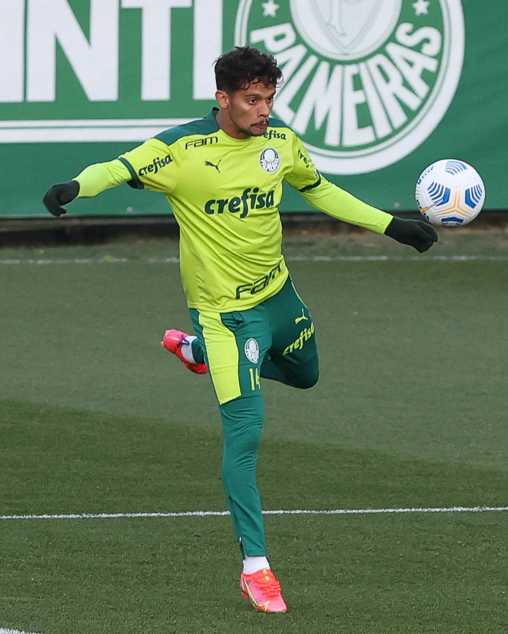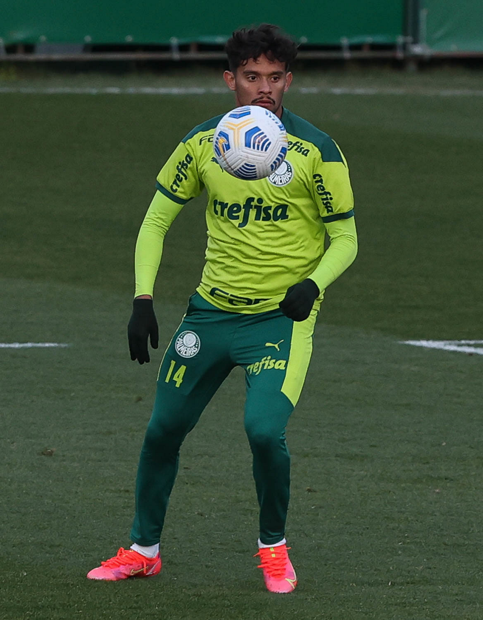 O goleiro Bruno (E) e os jogadores Marcos Rocha, Victor Luis, Felipe Melo, Benjamín Kuscevic, Breno Lopes, Deyverson, Mathesu Fernades e Dudu (E/D em pé) e Gabriel Veron, Patrick de Paula e Gustavo Scarpa (E/D agachados), da SE Palmeiras, durante treinamento, na Academia de Futebol. (Foto: Cesar Greco)