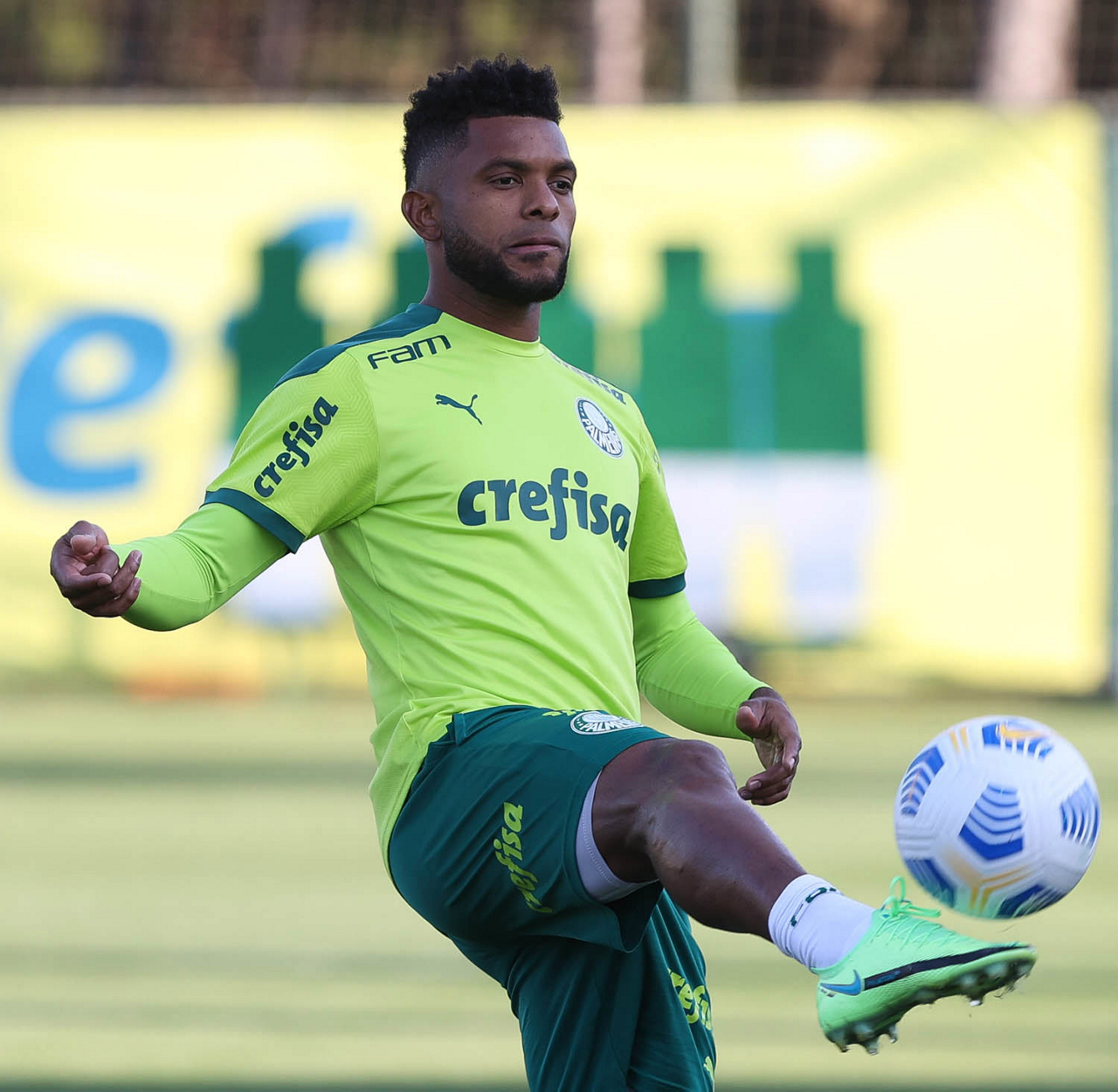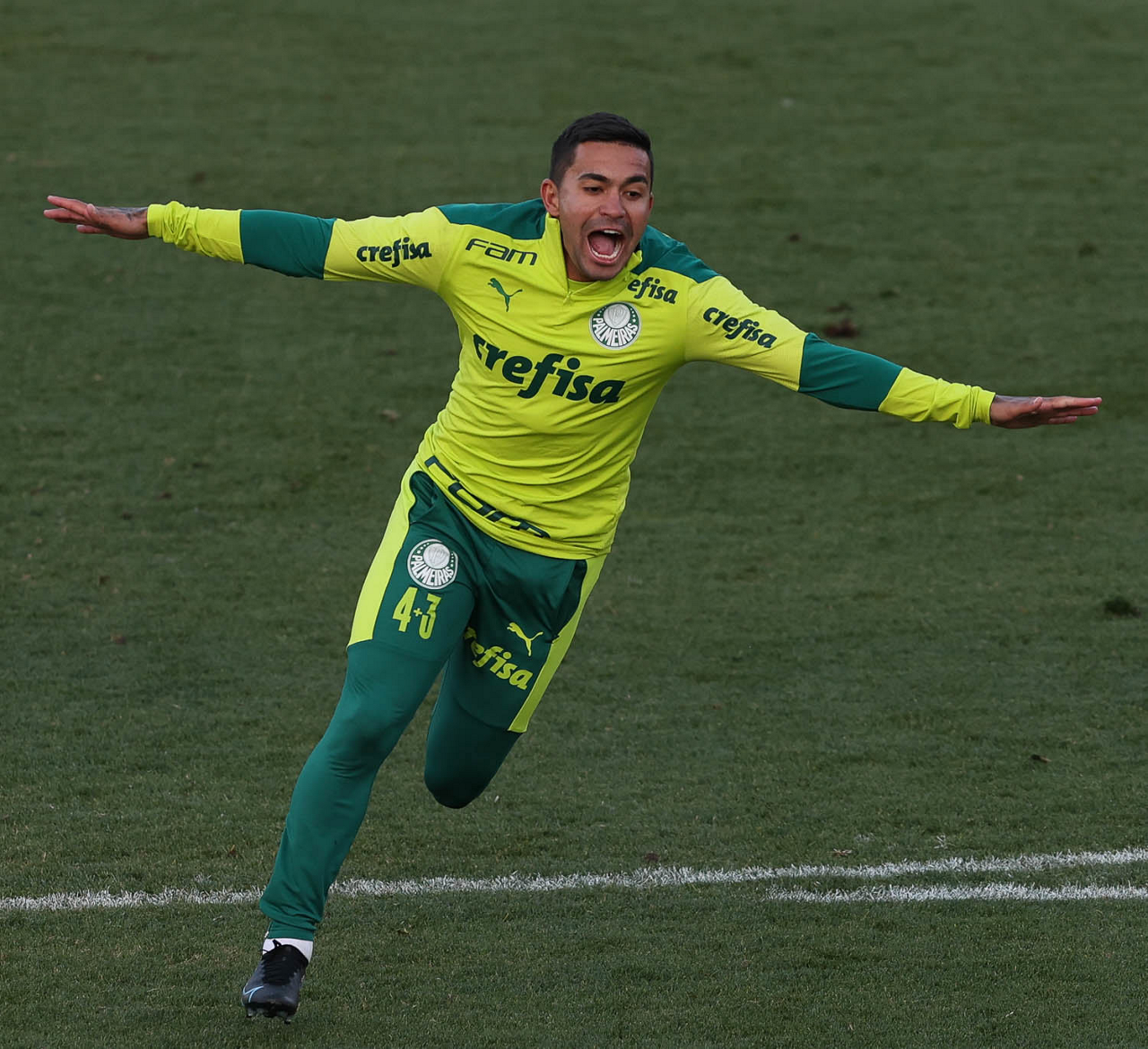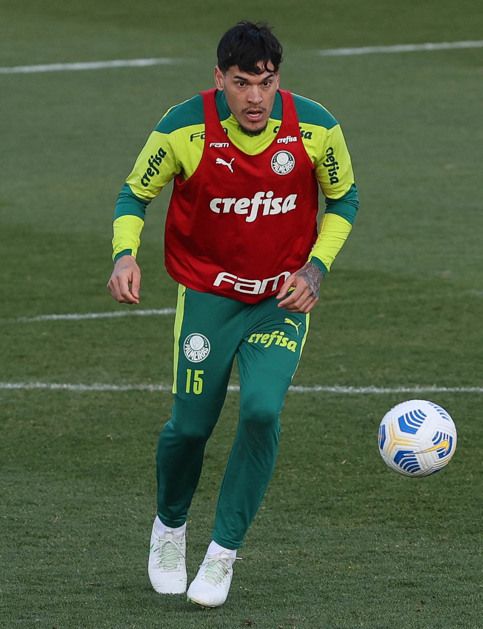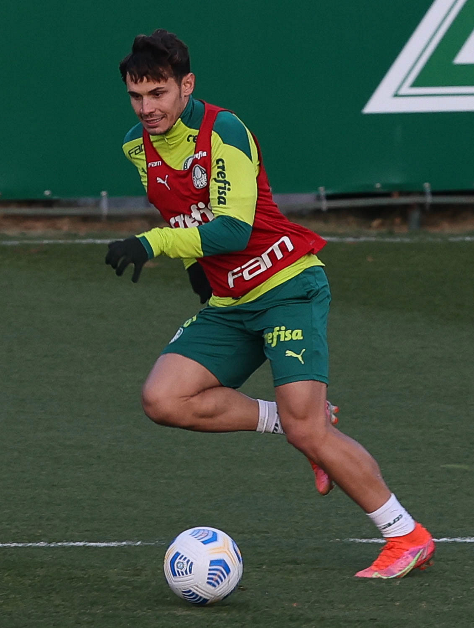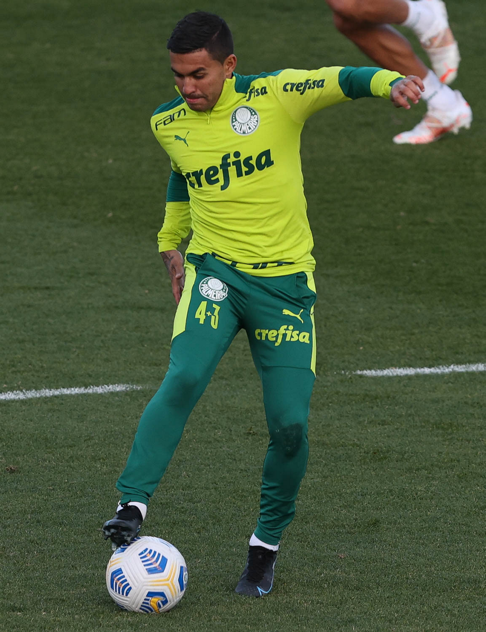 O goleiro Bruno (E) e os jogadores Marcos Rocha, Victor Luis, Felipe Melo, Benjamín Kuscevic, Breno Lopes, Deyverson, Mathesu Fernades e Dudu (E/D em pé) e Gabriel Veron, Patrick de Paula e Gustavo Scarpa (E/D agachados), da SE Palmeiras, durante treinamento, na Academia de Futebol. (Foto: Cesar Greco)