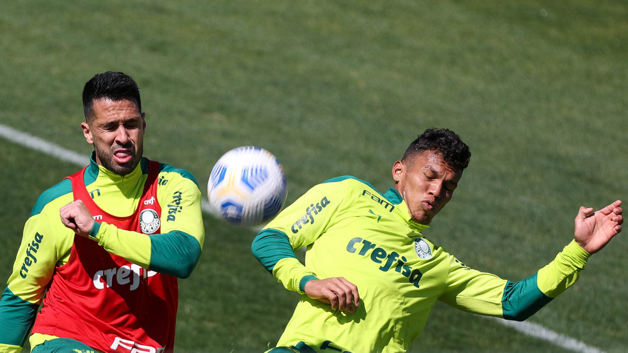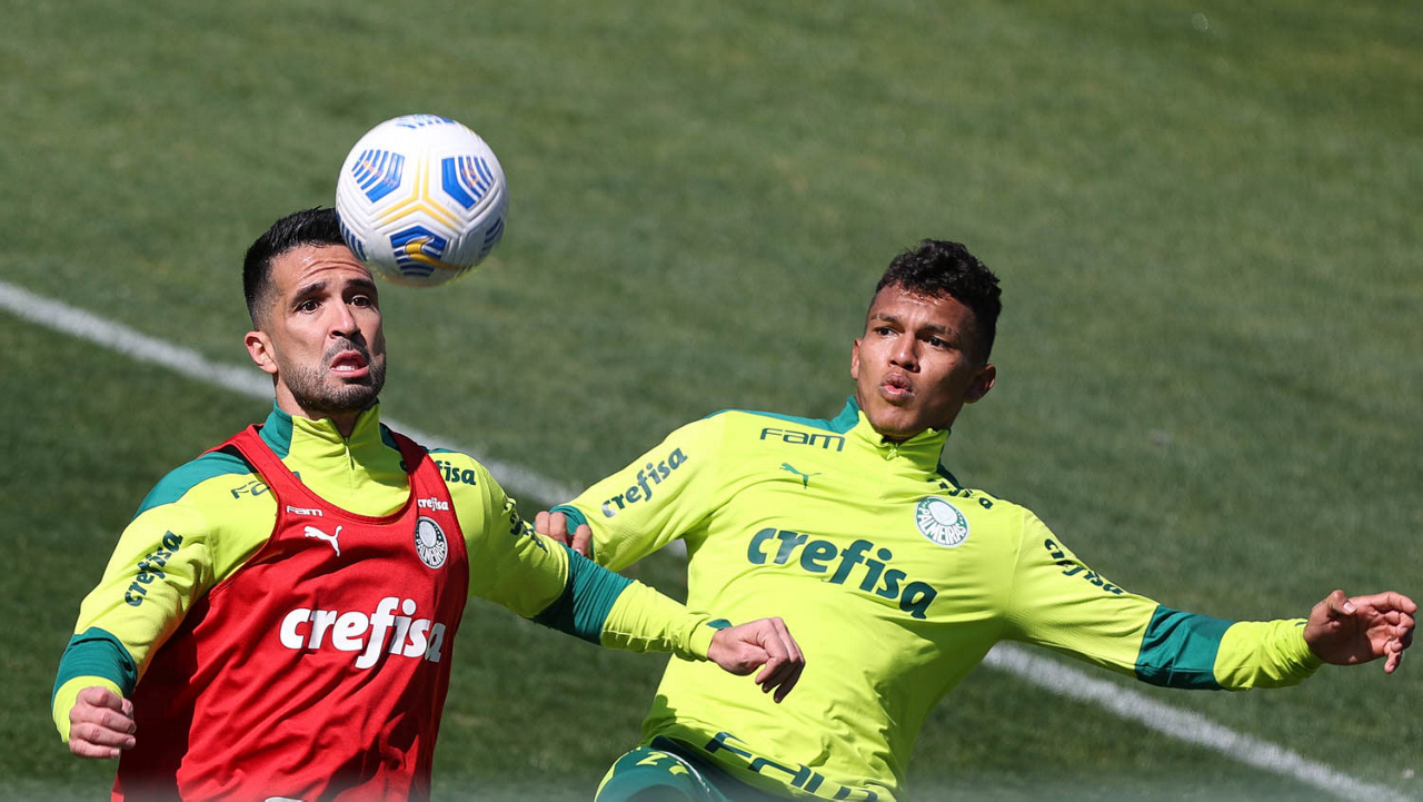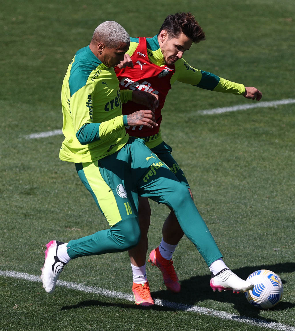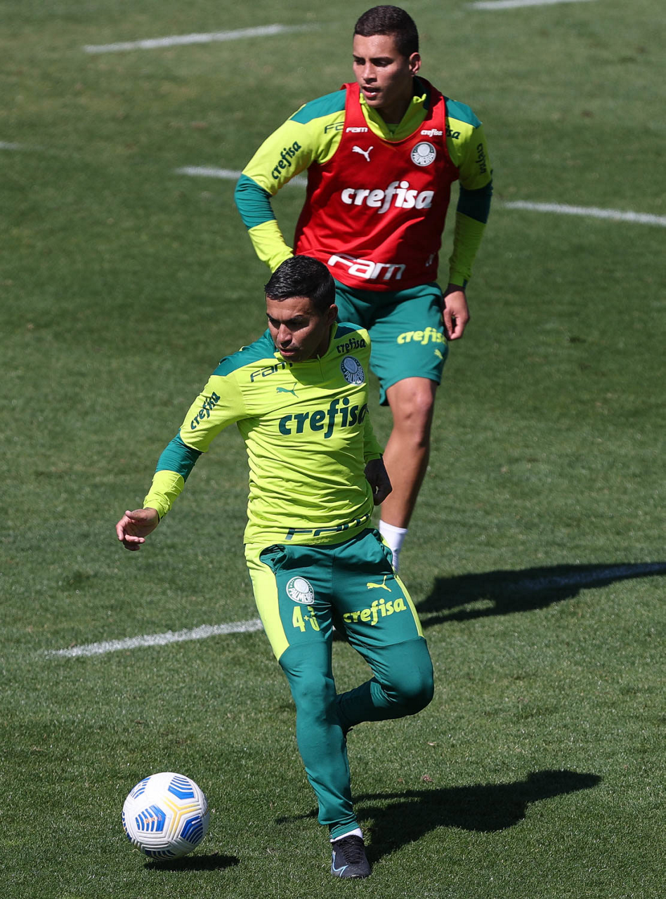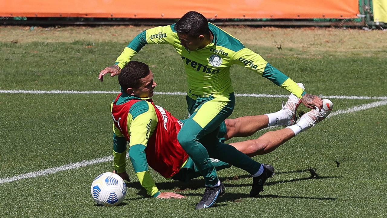 Os jogadores Deyverson e Raphael Veiga (D), da SE Palmeiras, durante treinamento, na Academia de Futebol. (Foto: Cesar Greco)