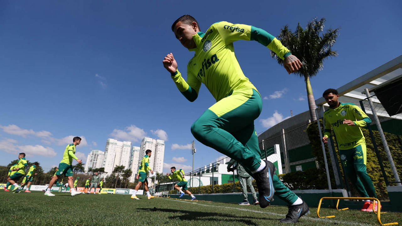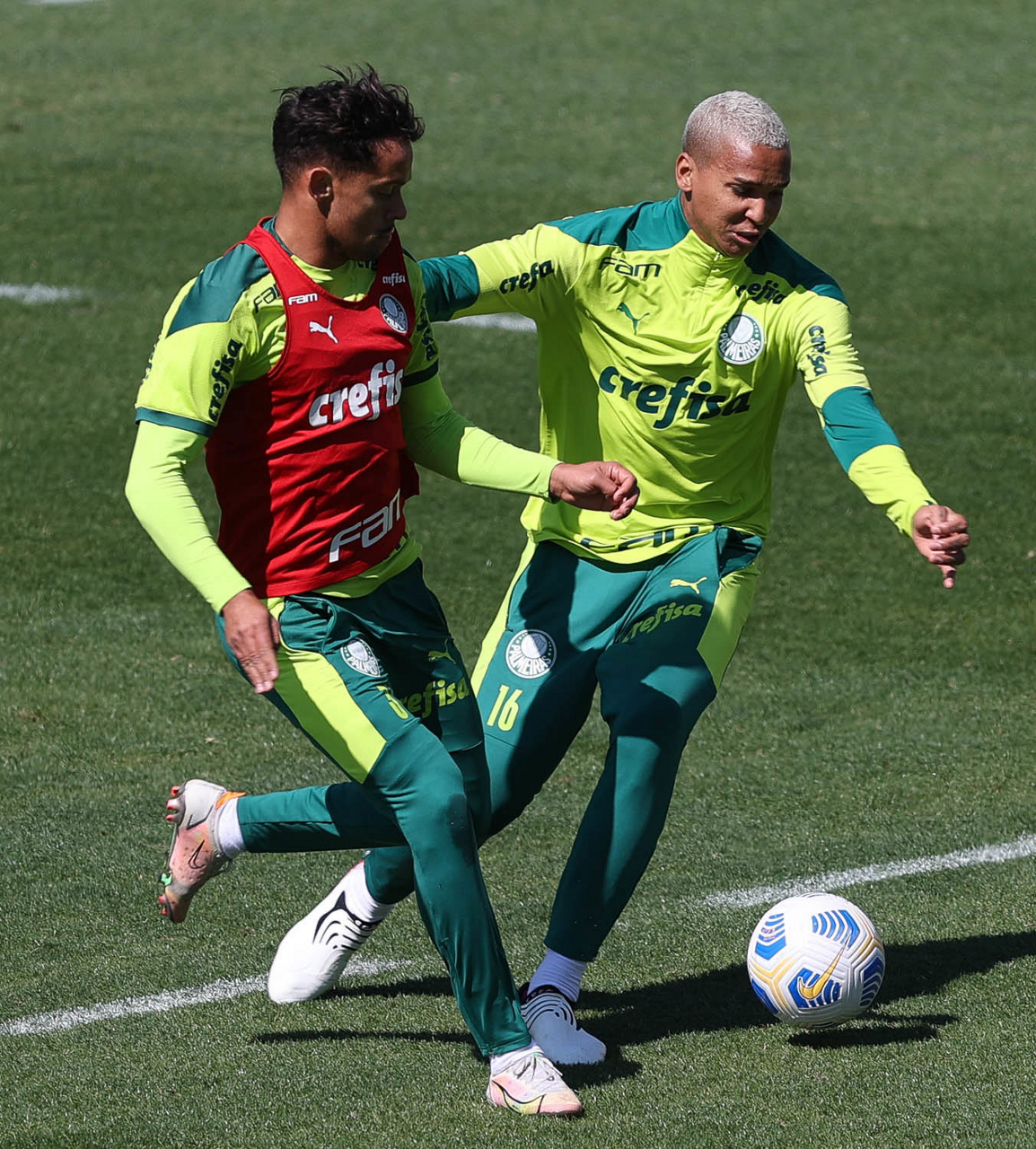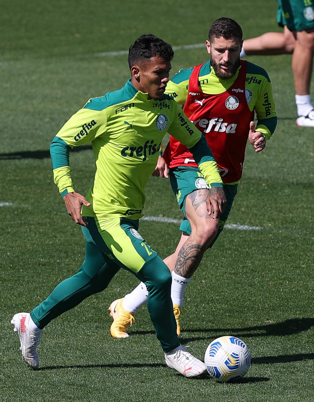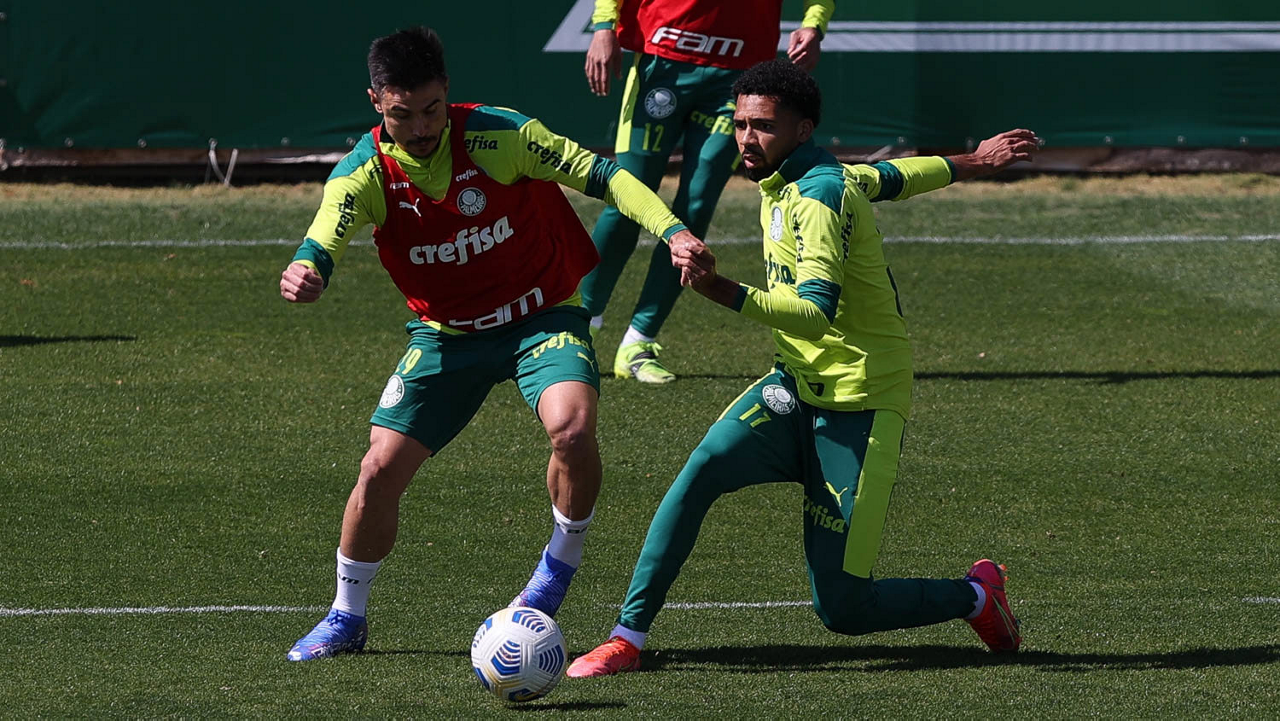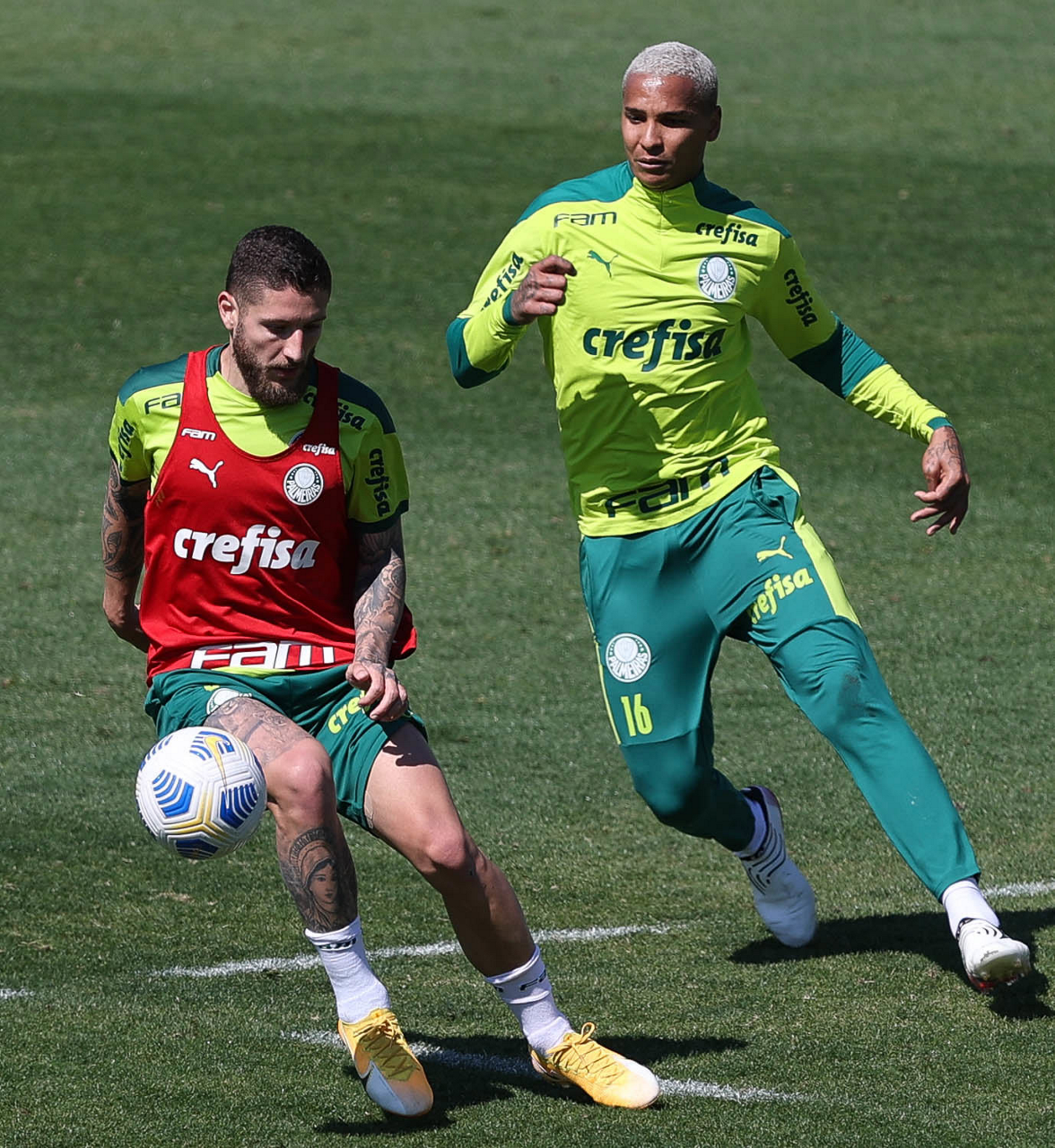 Os jogadores Deyverson e Raphael Veiga (D), da SE Palmeiras, durante treinamento, na Academia de Futebol. (Foto: Cesar Greco)