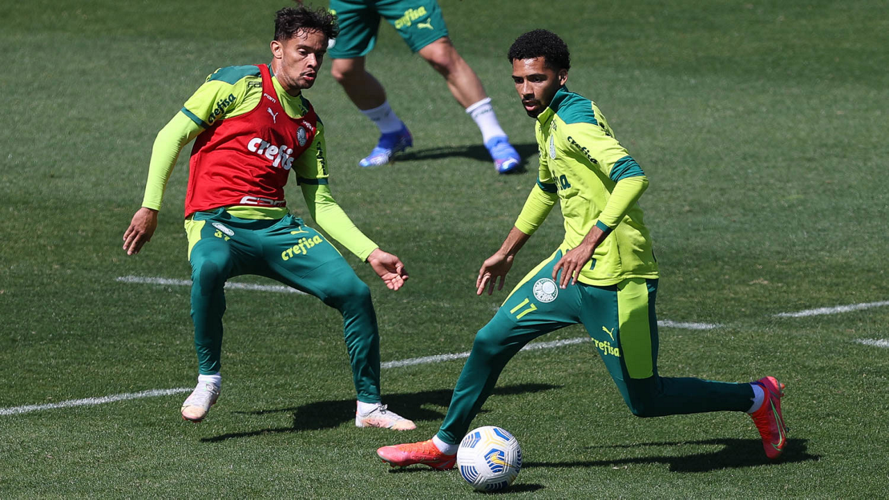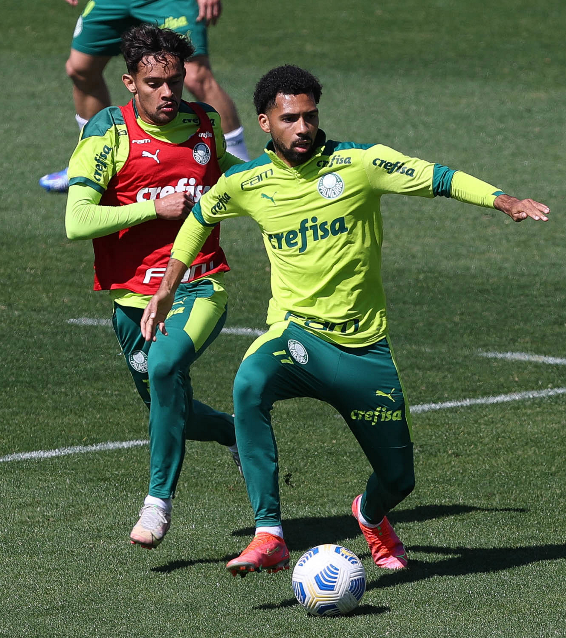 Os jogadores Gabriel Veron e Zé Rafael (D), da SE Palmeiras, durante treinamento, na Academia de Futebol. (Foto: Cesar Greco)