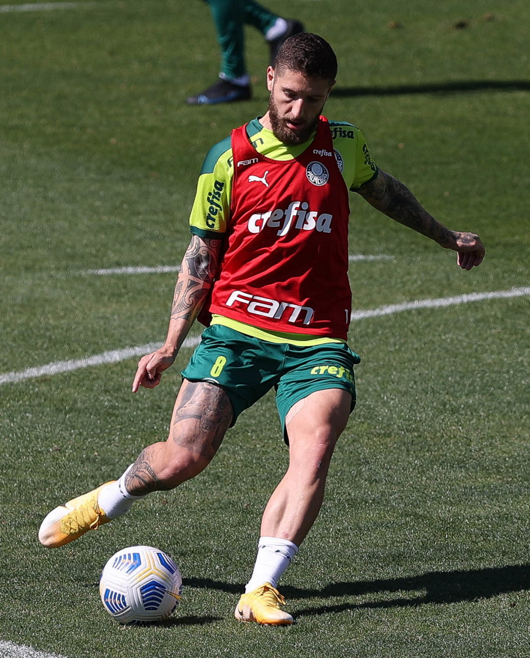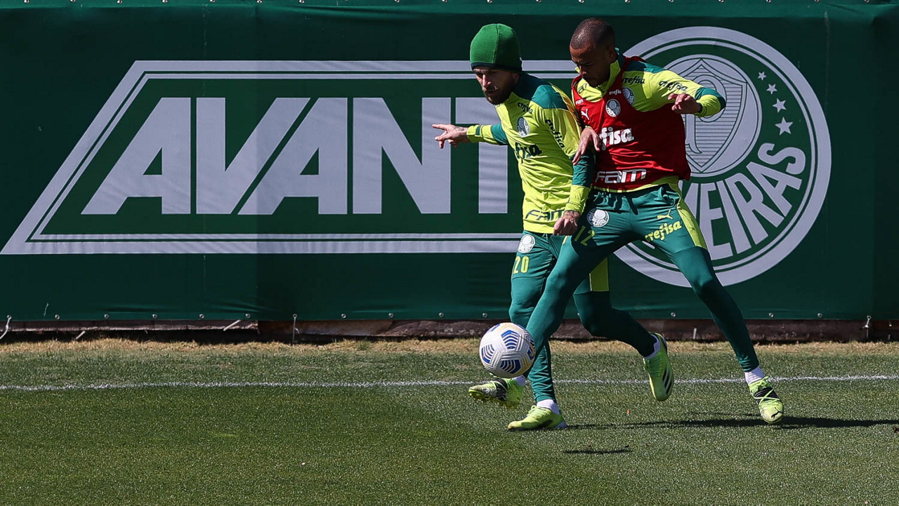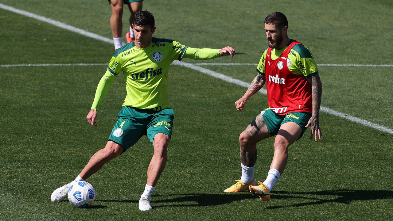 Os jogadores Benjamín Kuscevic e Zé Rafael (D), da SE Palmeiras, durante treinamento, na Academia de Futebol. (Foto: Cesar Greco)
