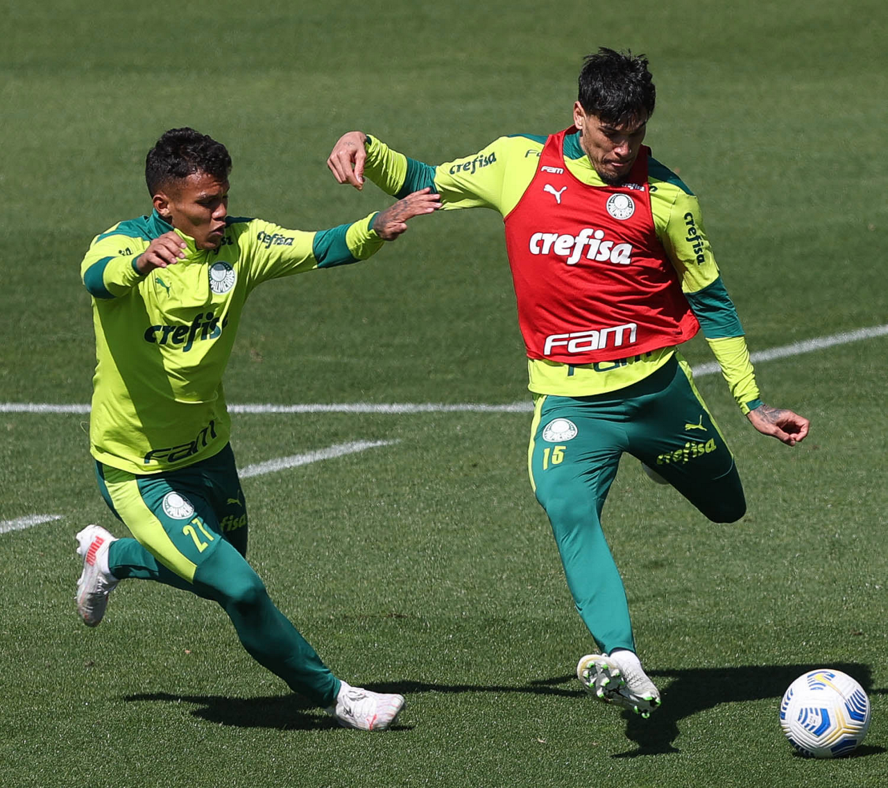 Os jogadores Gabriel Veron e Gustavo Gómez (D), da SE Palmeiras, durante treinamento, na Academia de Futebol. (Foto: Cesar Greco)