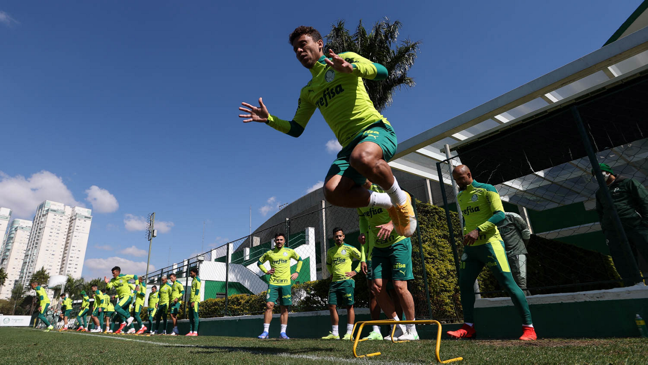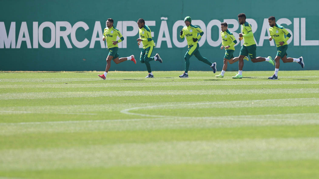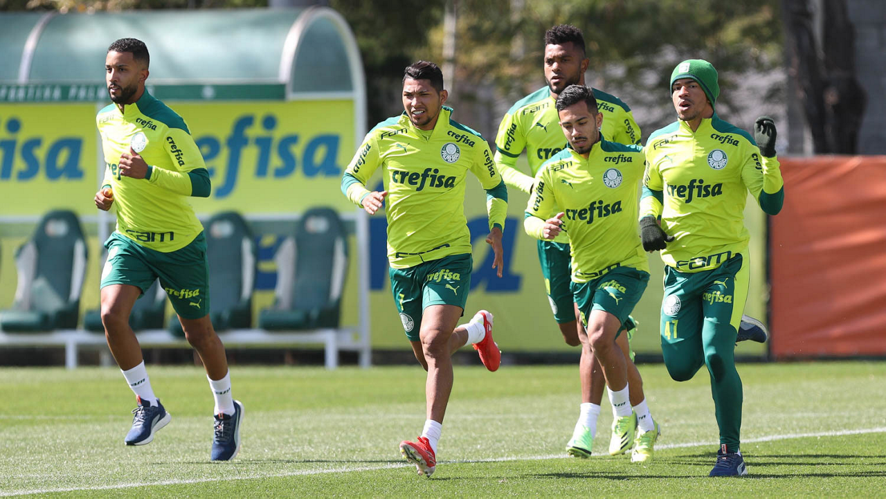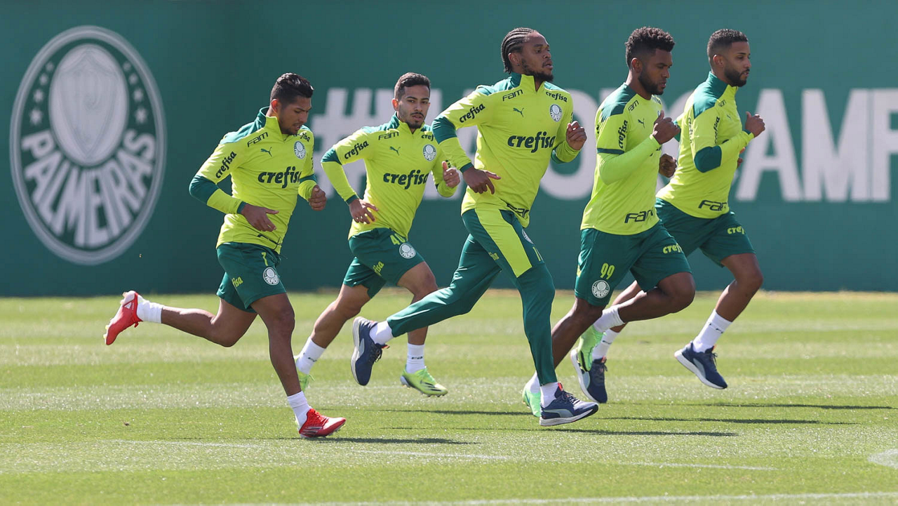 Os jogadores Jorge, Rony, Borja, Alan e Lucas Esteves (E/D), da SE Palmeiras, durante treinamento, na Academia de Futebol. (Foto: Cesar Greco)