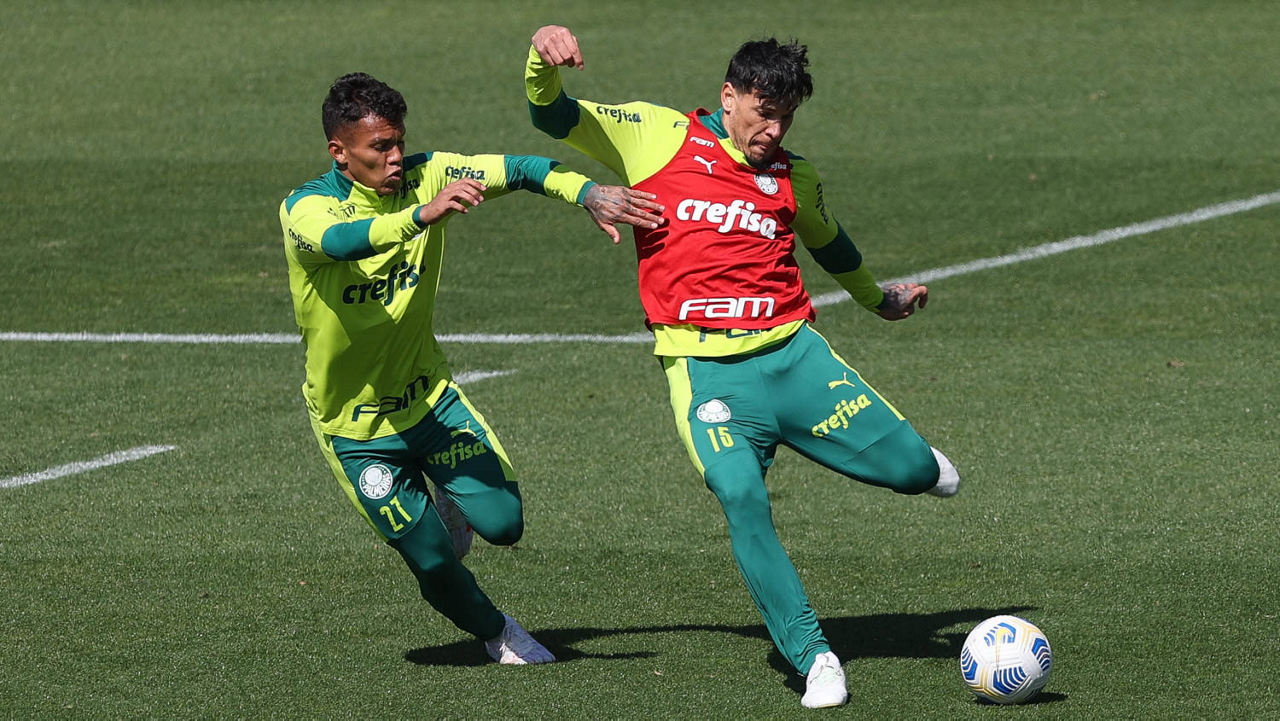 Os jogadores Gustavo Scarpa e Matheus Fernandes (D), da SE Palmeiras, durante treinamento, na Academia de Futebol. (Foto: Cesar Greco)