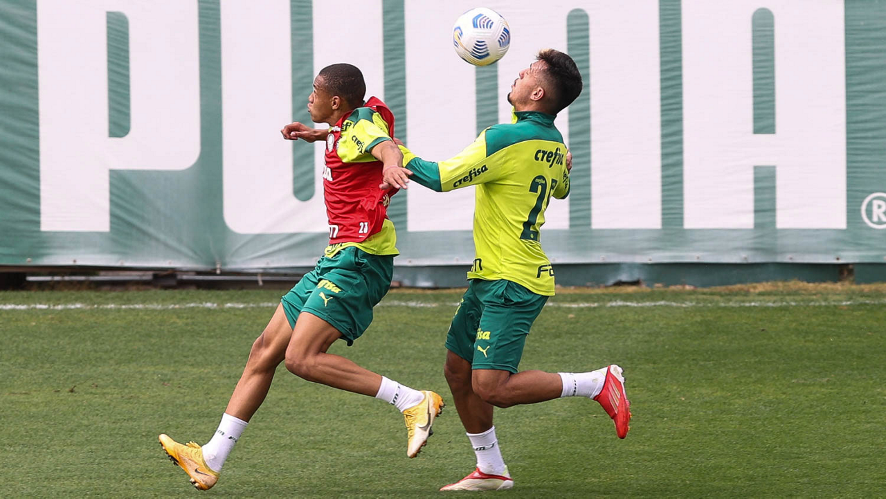 Os jogadores Yago e Gabriel Veron (D), da SE Palmeiras, durante treinamento, na Academia de Futebol. (Foto: Cesar Greco)