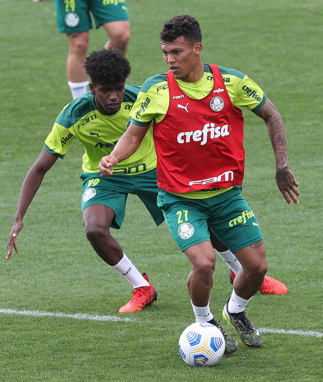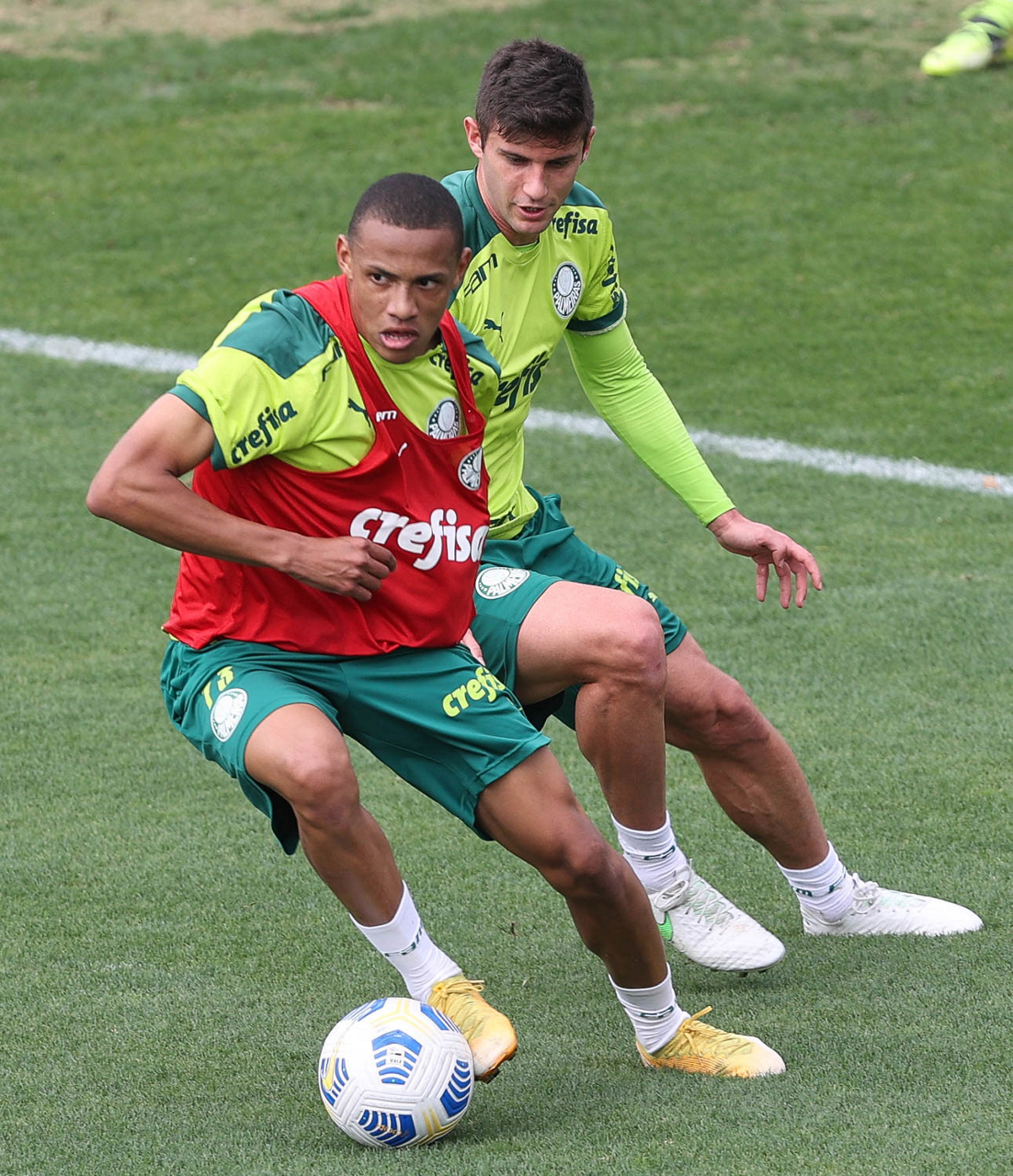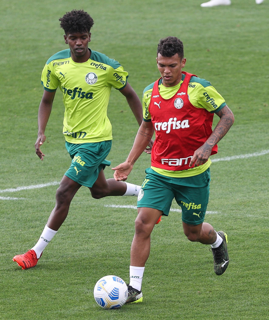 Os jogadores Victor Luis e Gabriel Menino (D), da SE Palmeiras, durante treinamento, na Academia de Futebol. (Foto: Cesar Greco)
