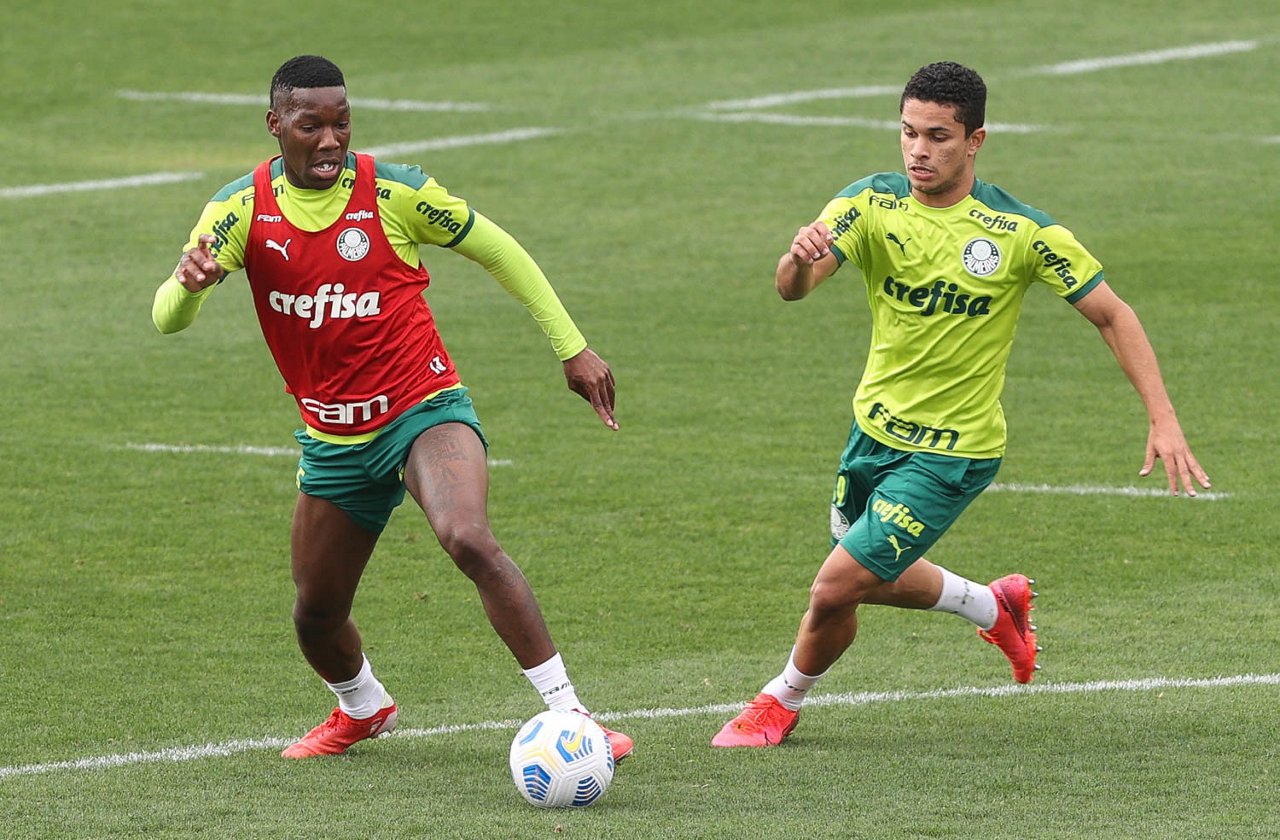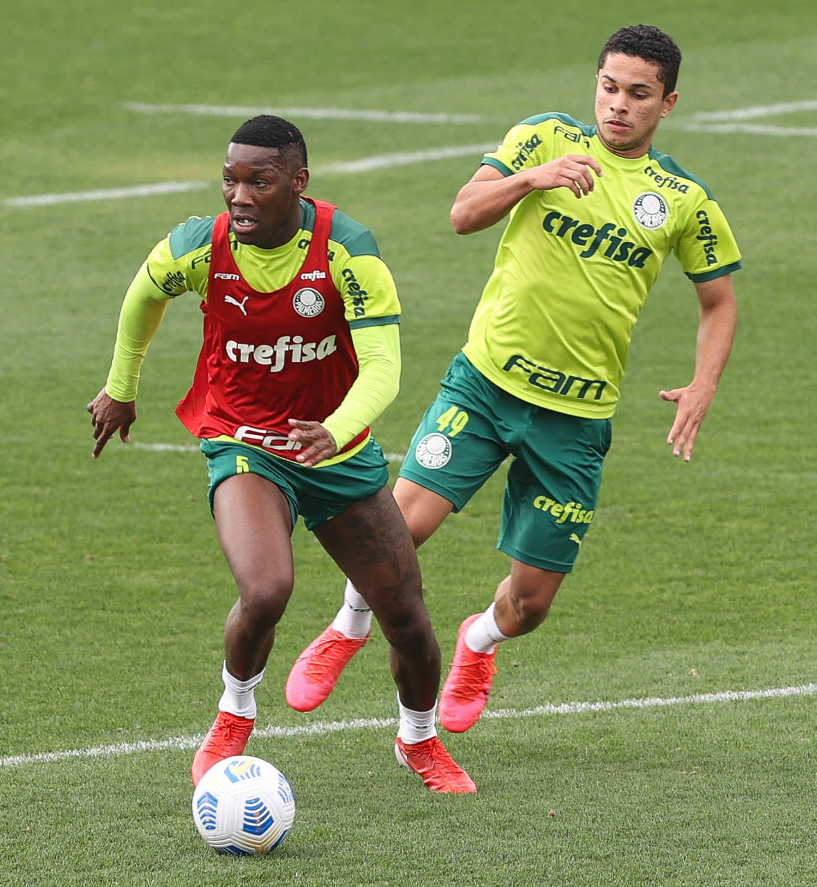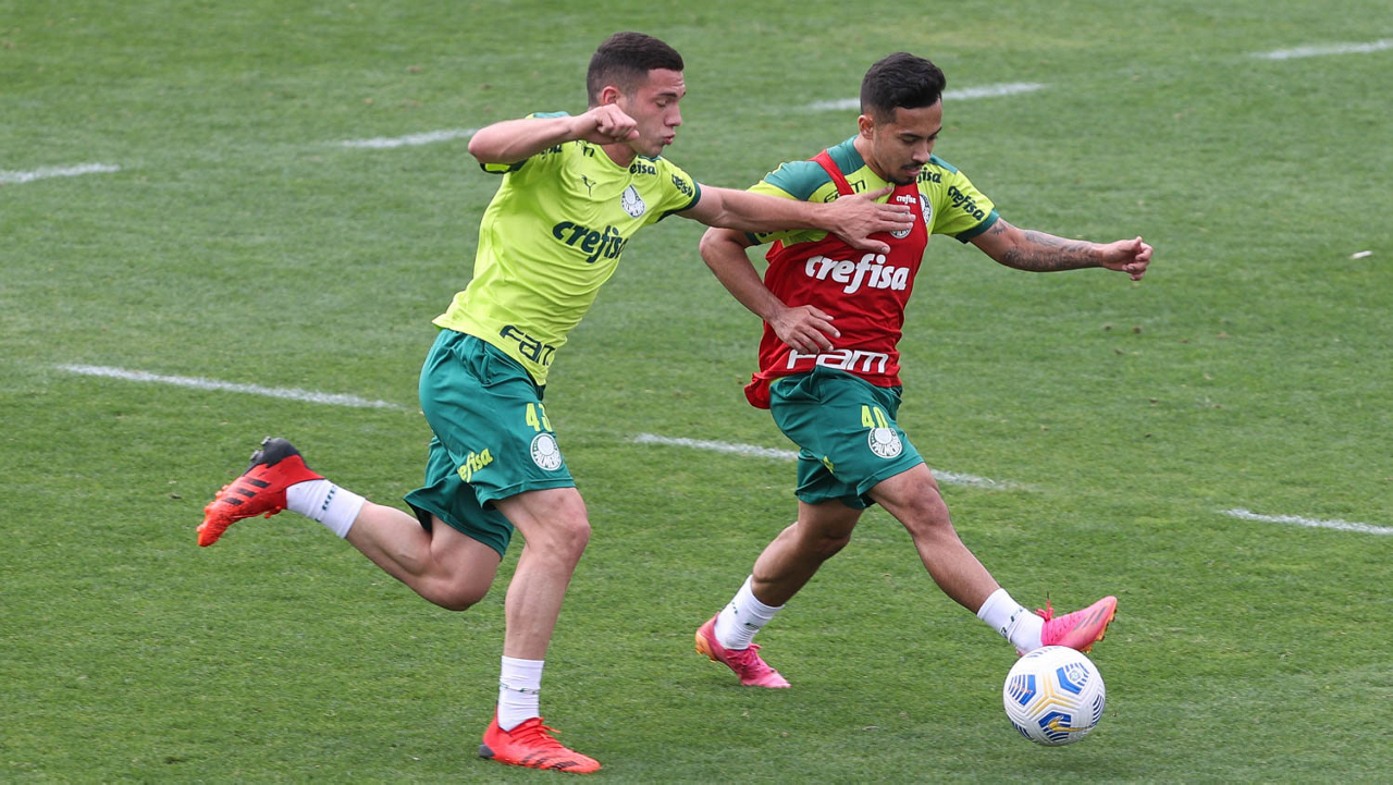 Os jogadores Victor Luis e Gabriel Menino (D), da SE Palmeiras, durante treinamento, na Academia de Futebol. (Foto: Cesar Greco)