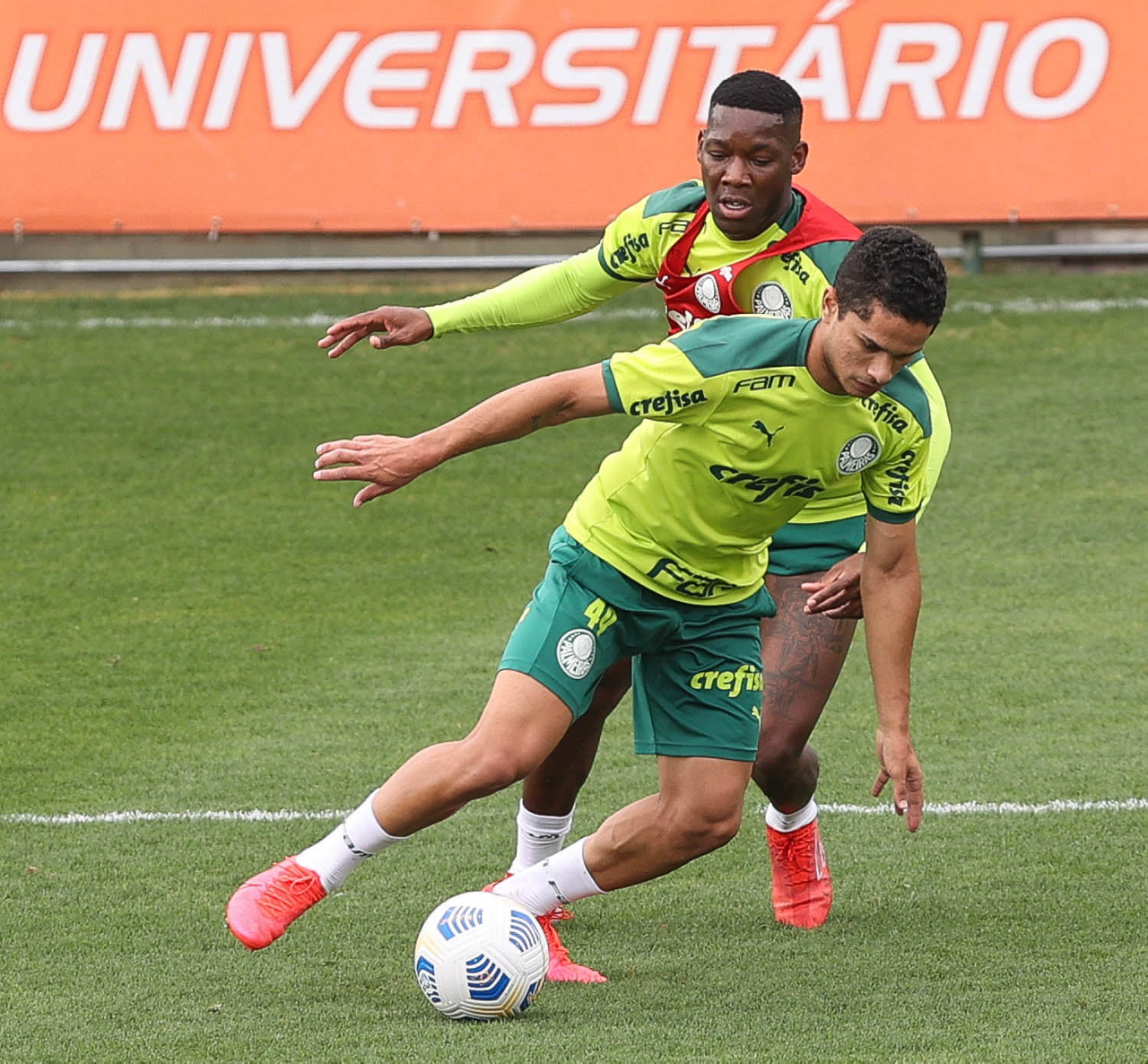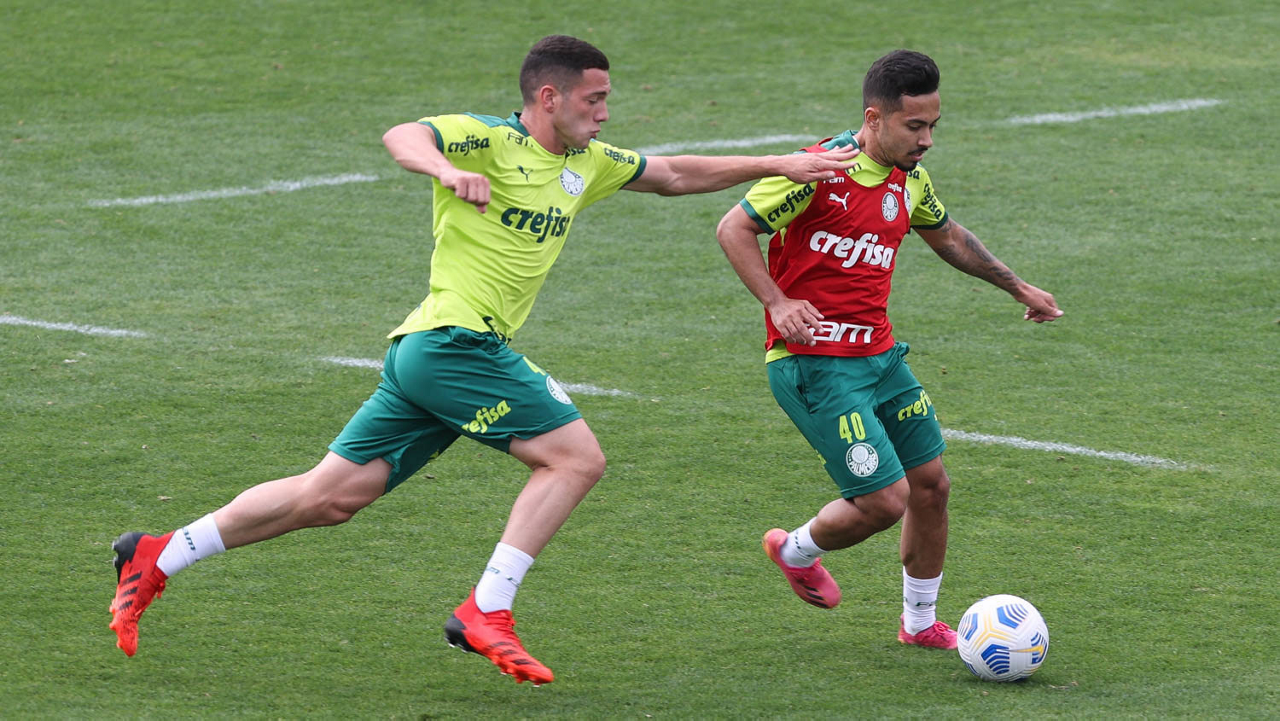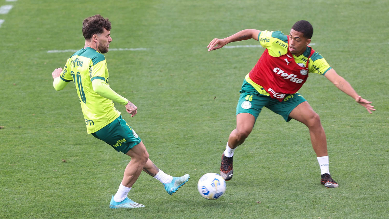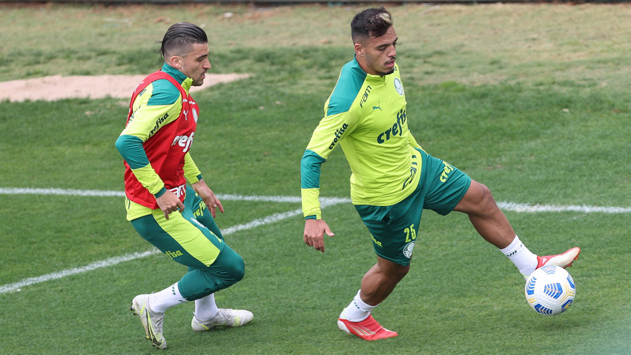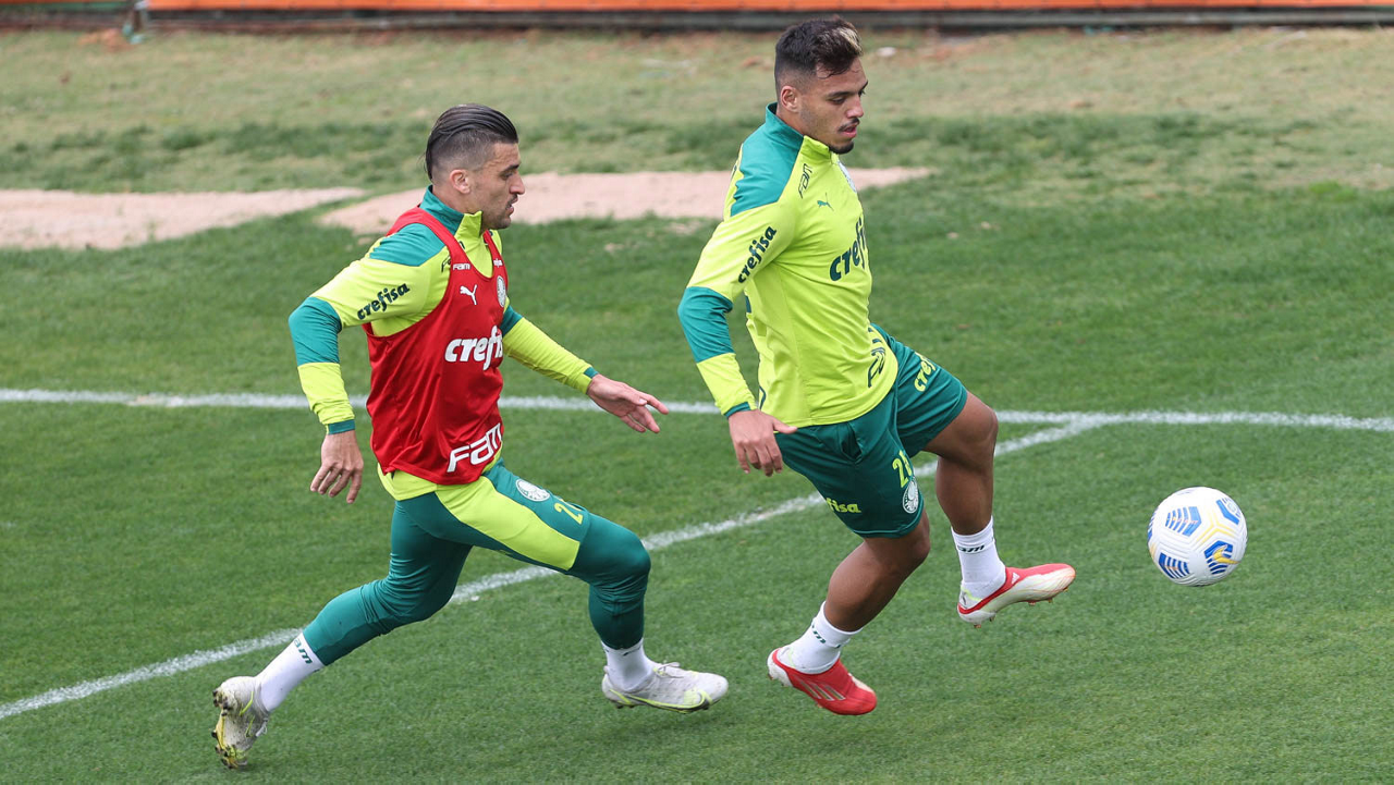 Os jogadores Patrick de Paula e Gabriel Silva (D), da SE Palmeiras, durante treinamento, na Academia de Futebol. (Foto: Cesar Greco)