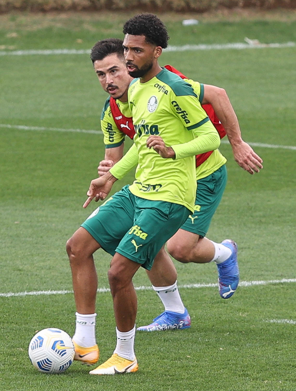 Os jogadores Patrick de Paula e Gabril Silva (D), da SE Palmeiras, durante treinamento, na Academia de Futebol. (Foto: Cesar Greco)